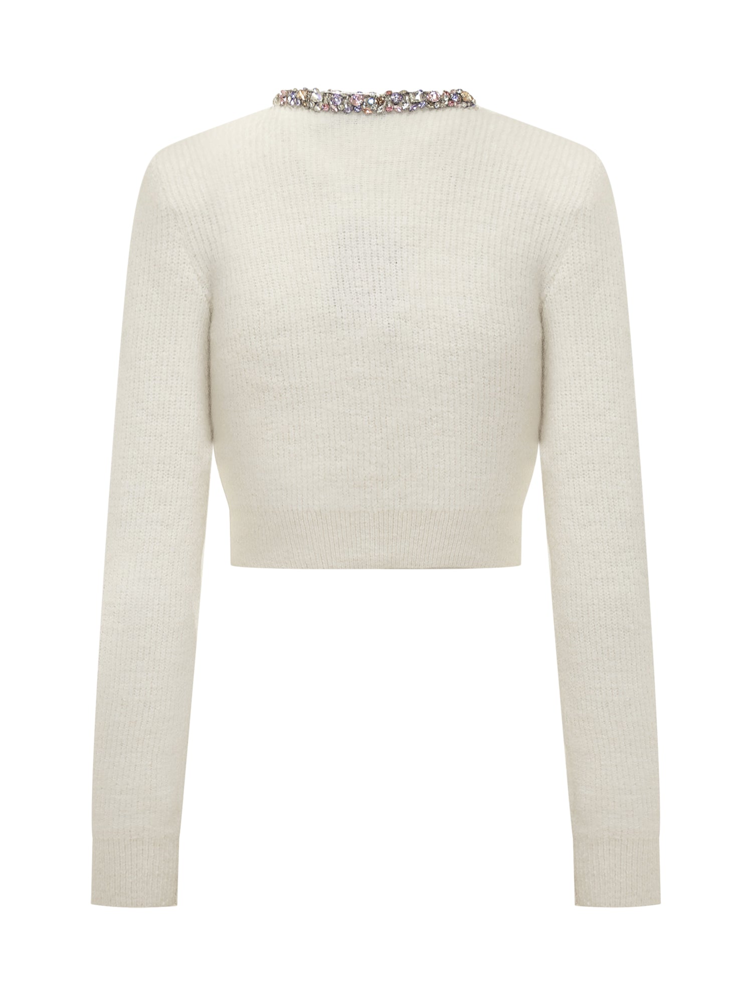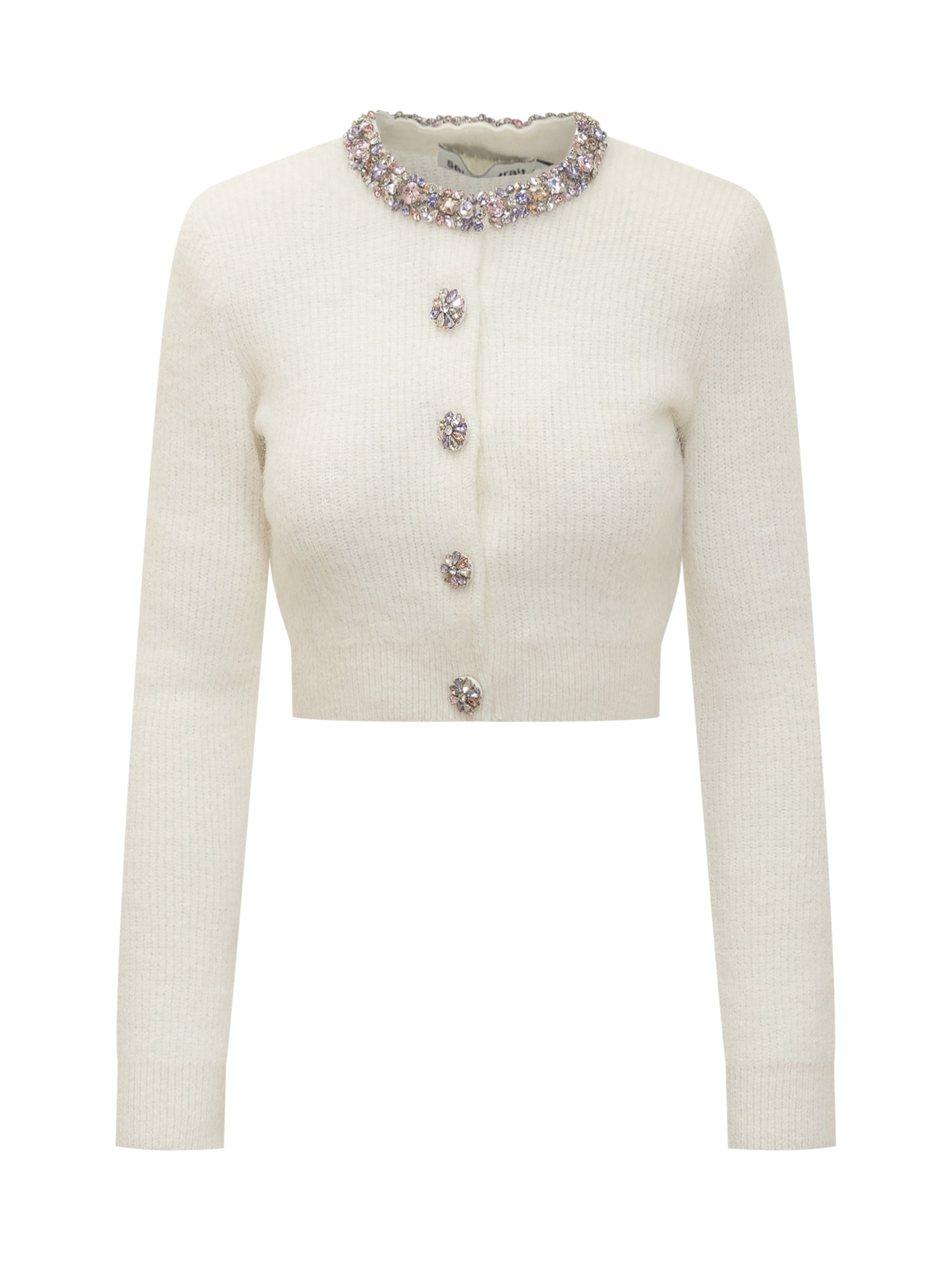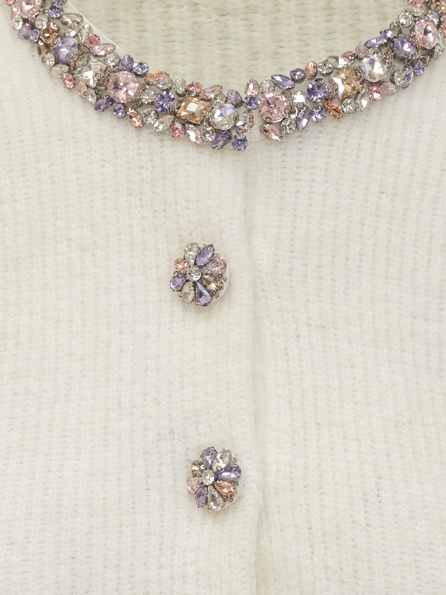 Cardigan corto in maglia avorio con collo girocollo decorato da cristalli e bottoni gioiello.