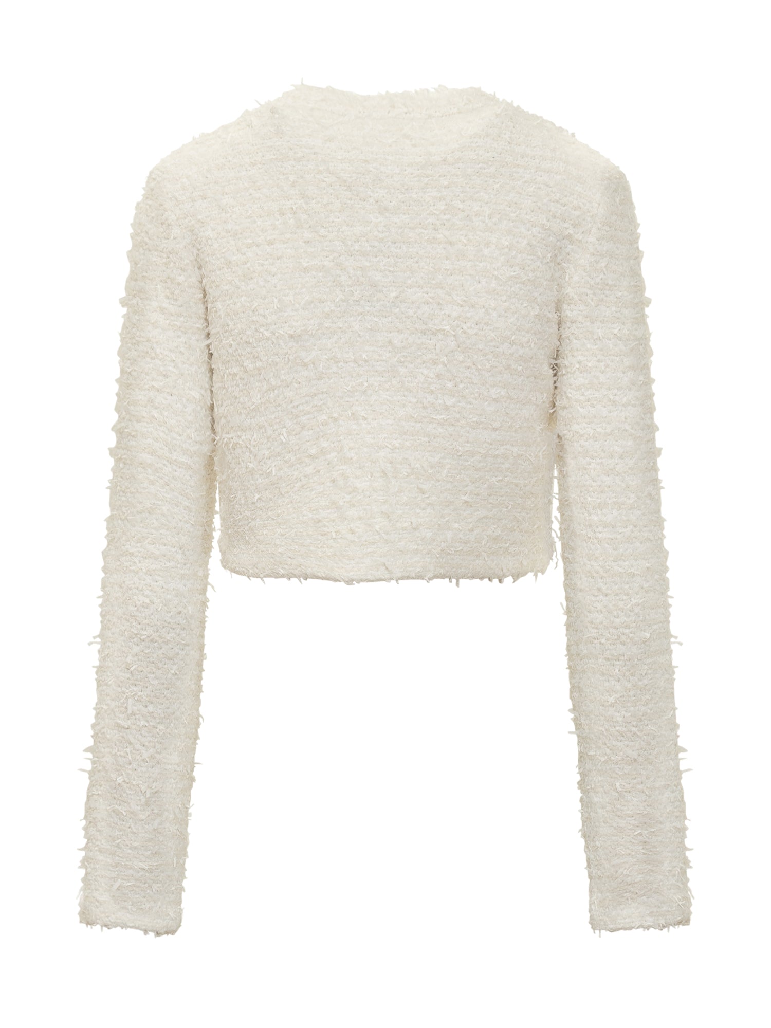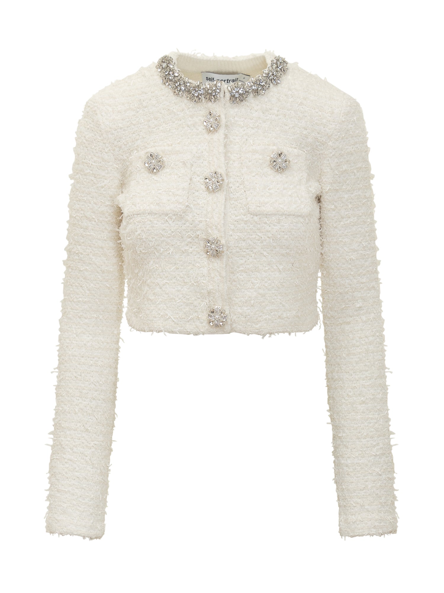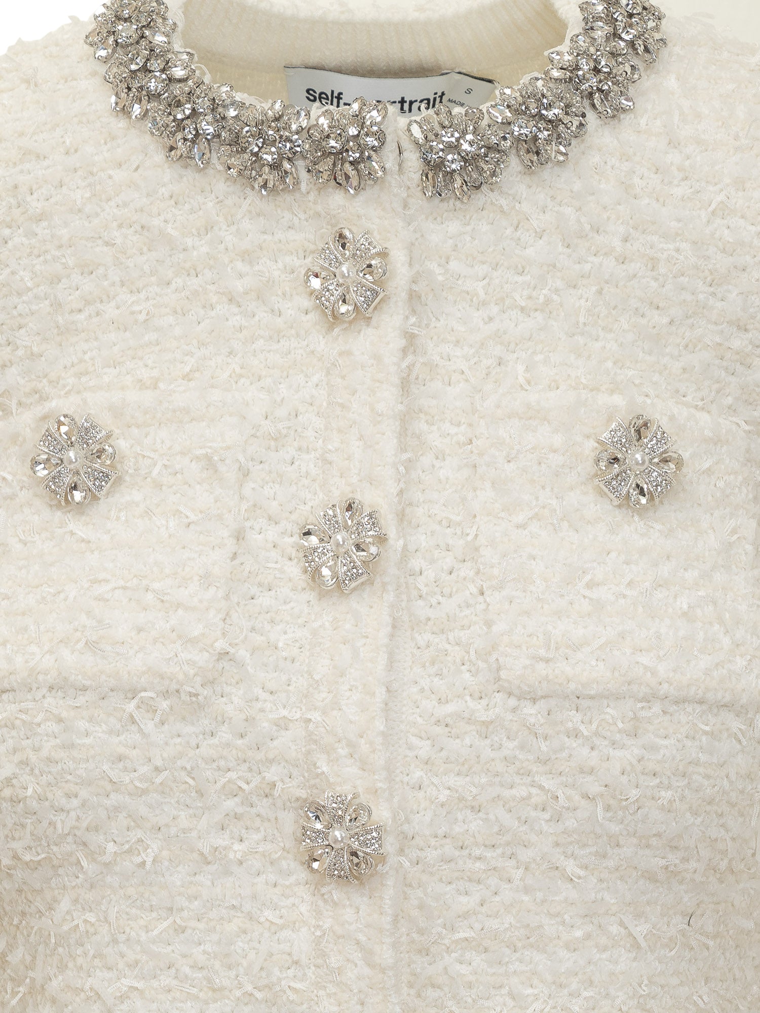 Giacca corta in bouclé avorio con collo girocollo decorato da cristalli e bottoni gioiello.