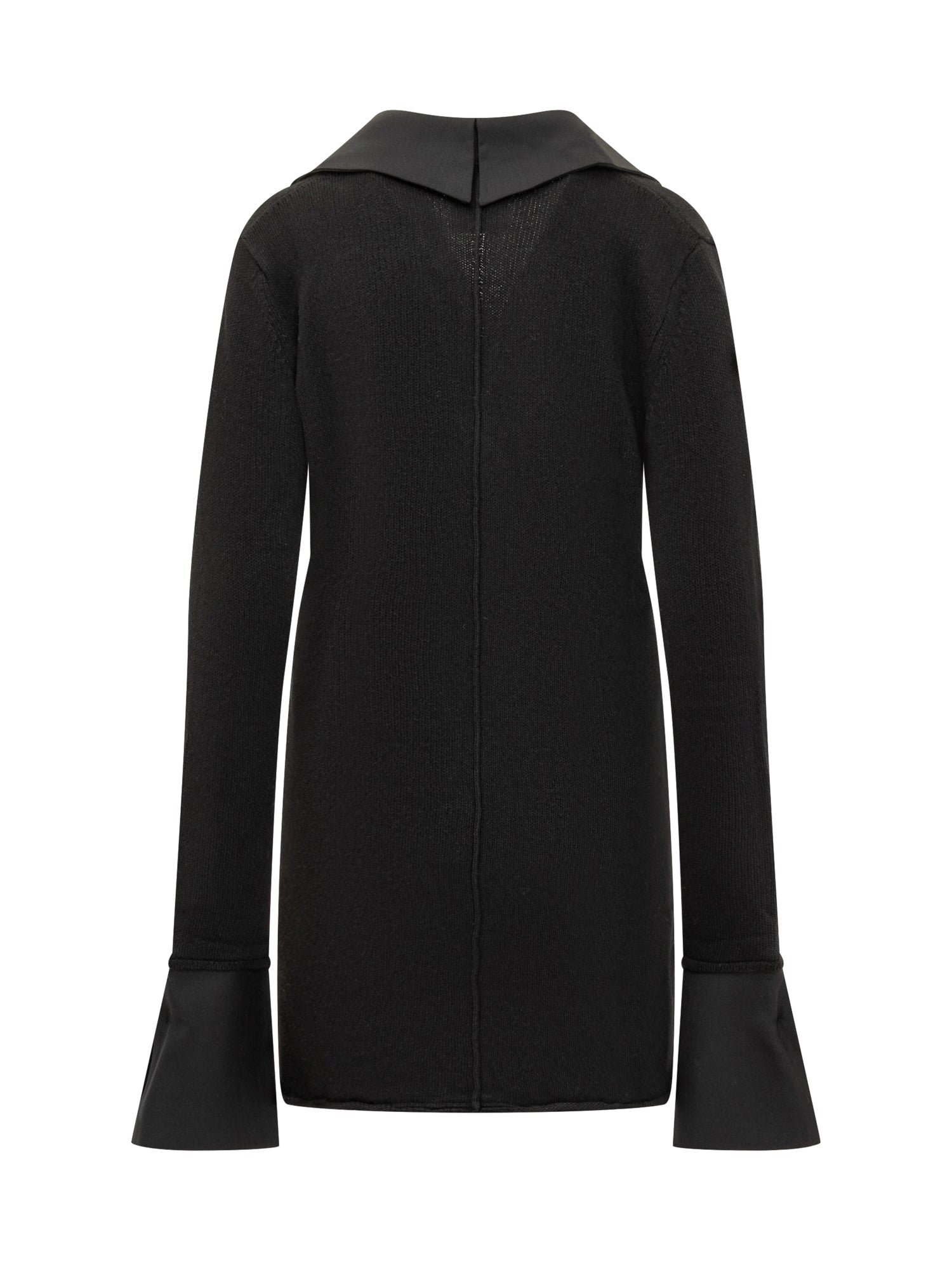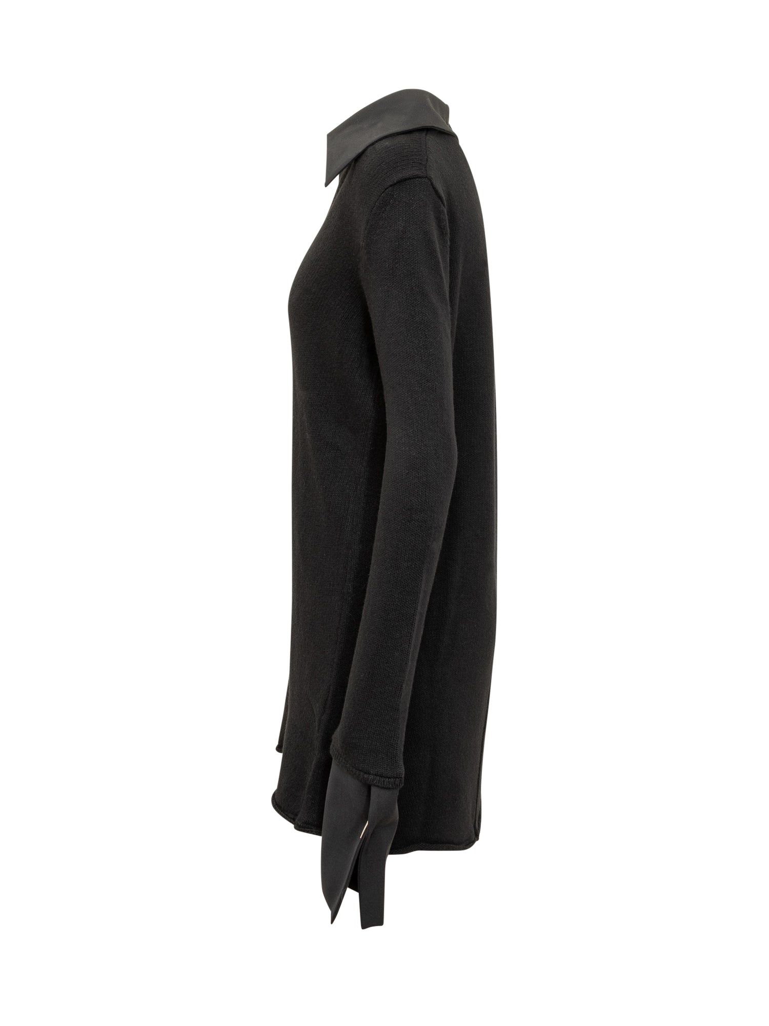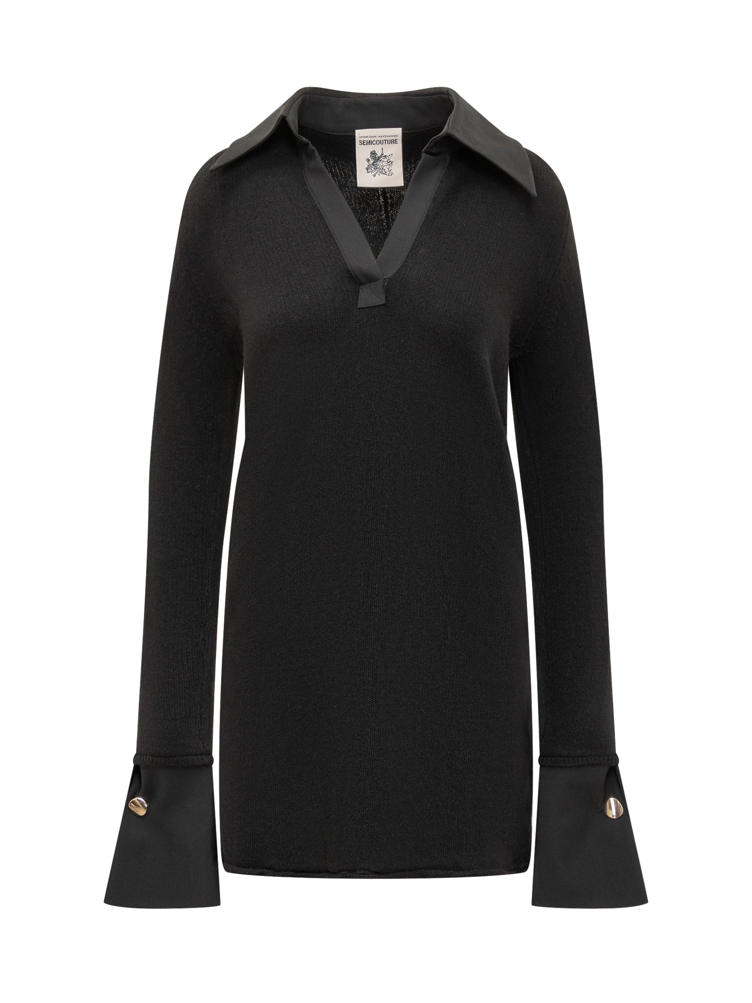 Maglia Semicouture nera a maniche lunghe con colletto in contrasto, scollo a V e polsini svasati con bottone gioiello.
