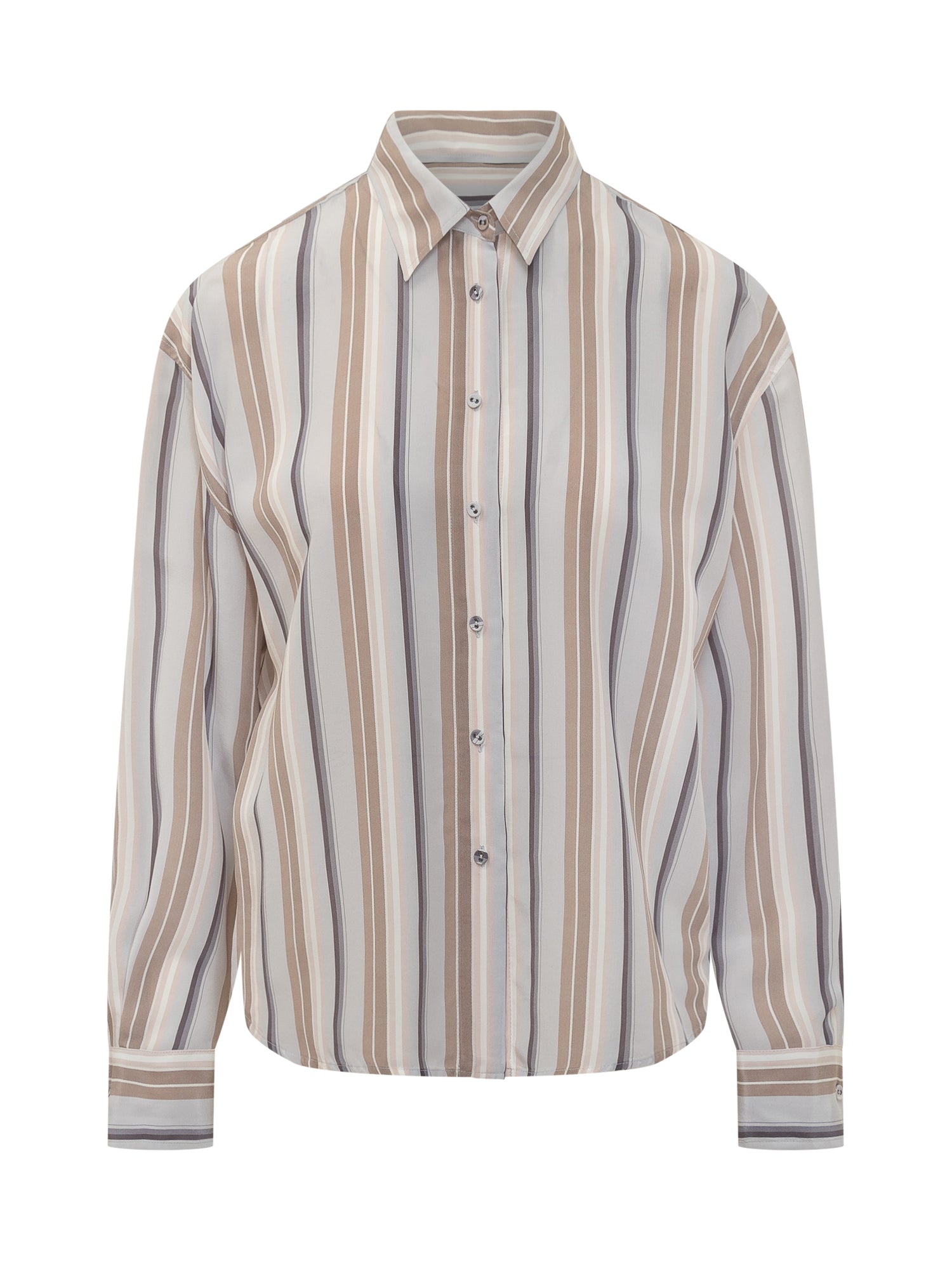 Camicia Seventy 19.70 in tessuto fluido con righe verticali nei toni del beige e del grigio. Colletto classico, chiusura con bottoni e maniche lunghe.