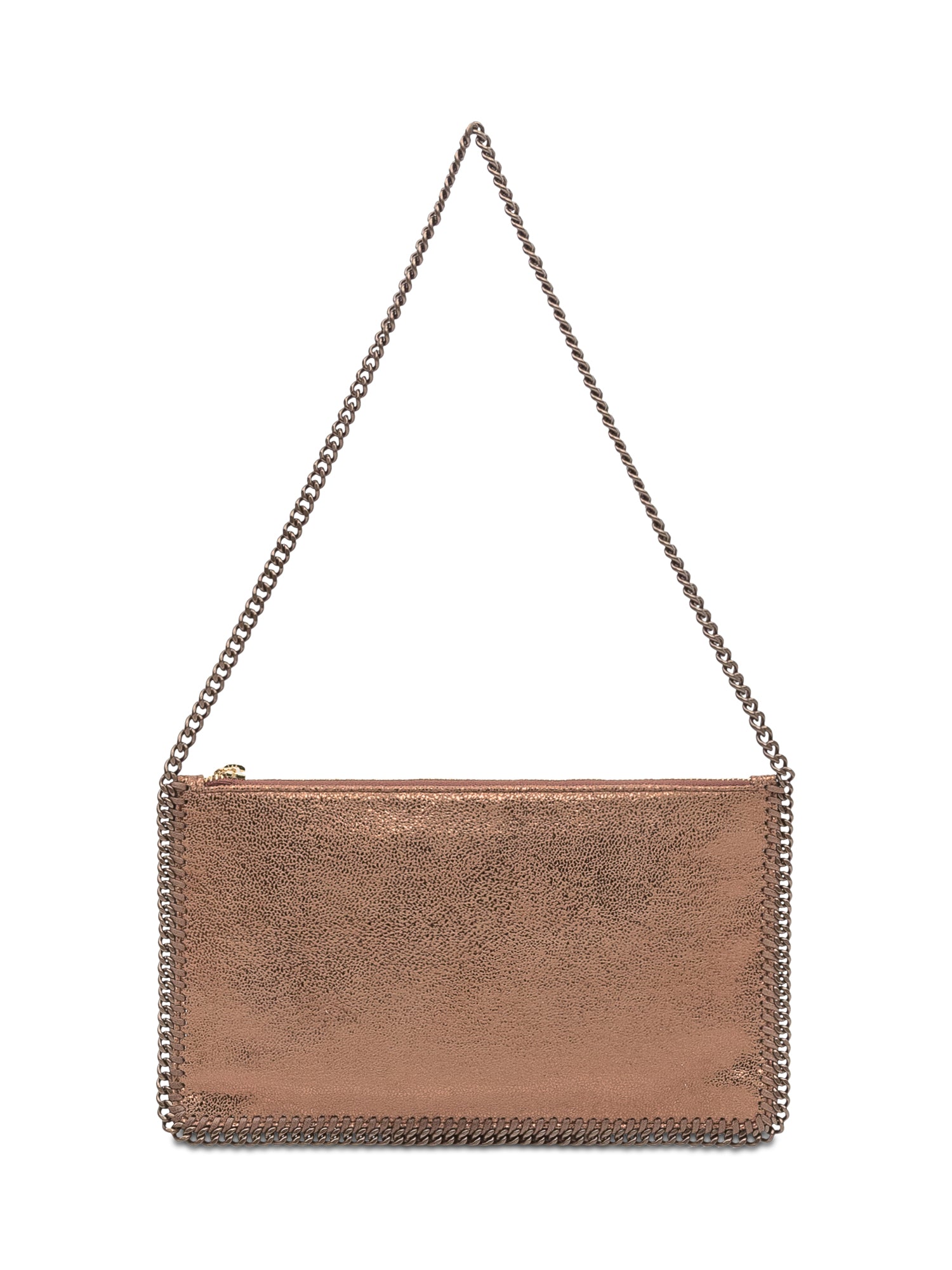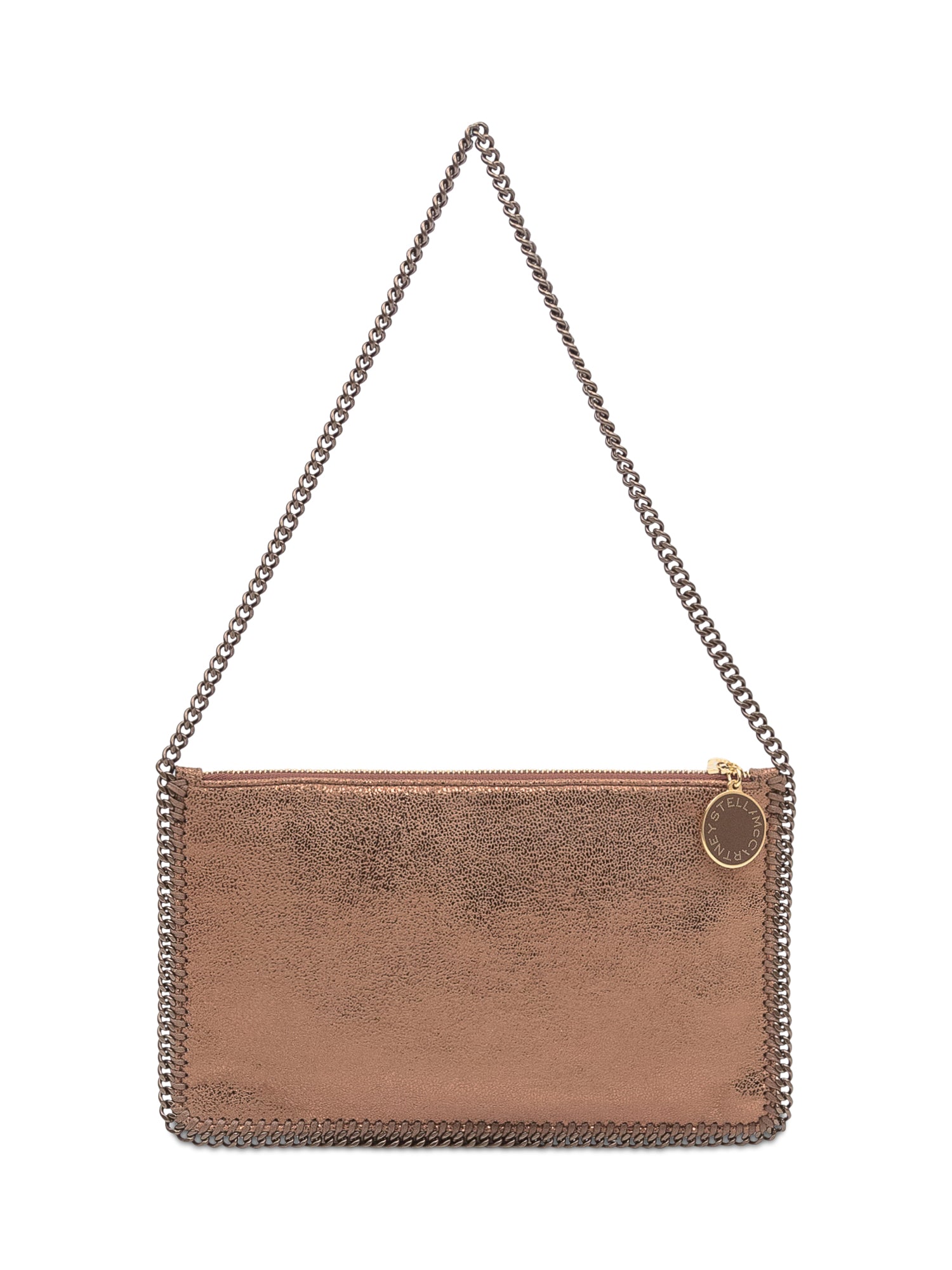 Mini borsa a spalla Stella McCartney in materiale vegan effetto metallizzato rame, con catena intrecciata e charm logato.