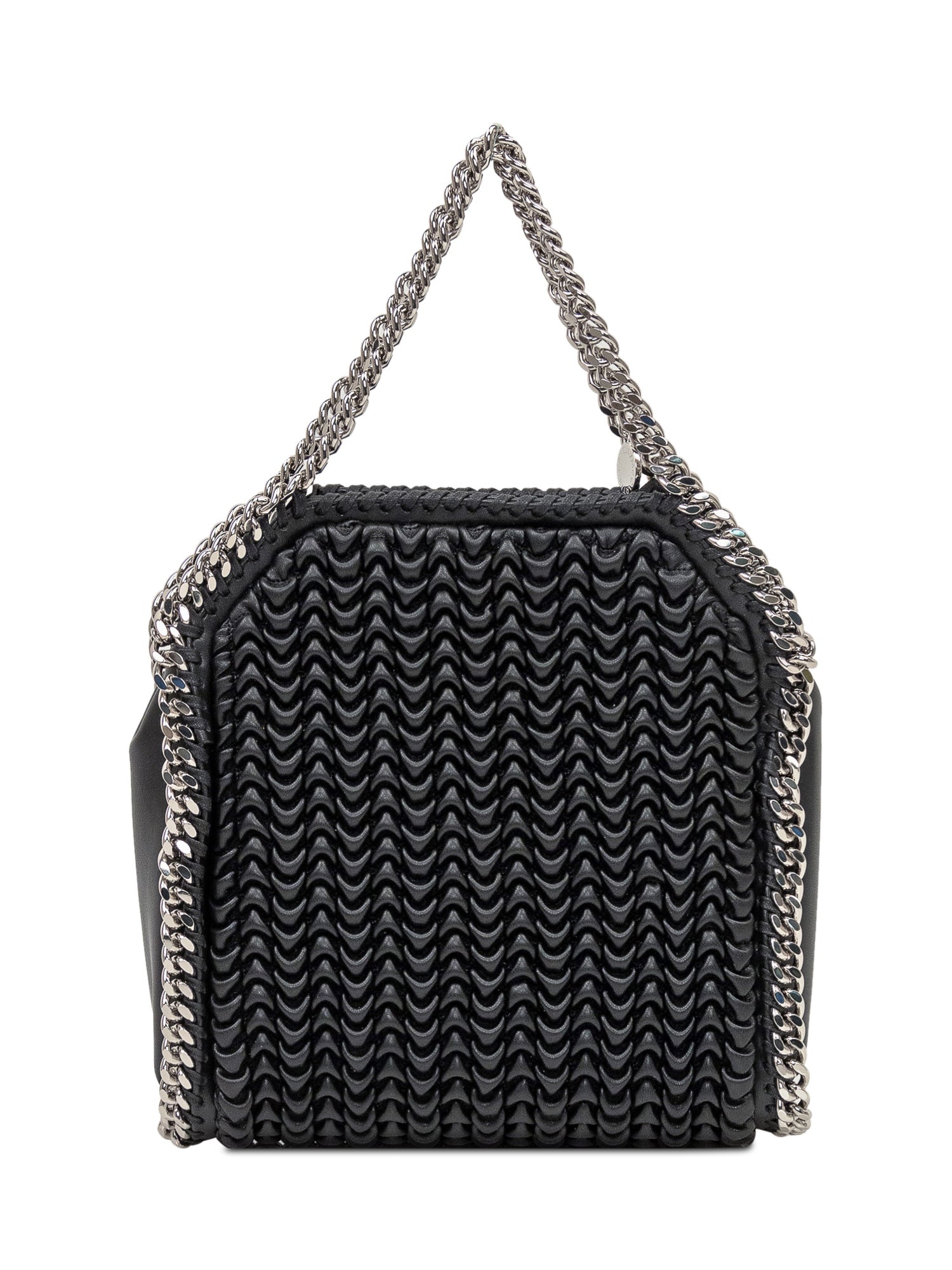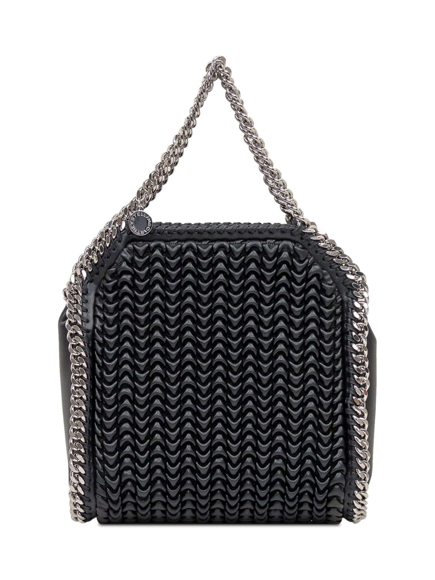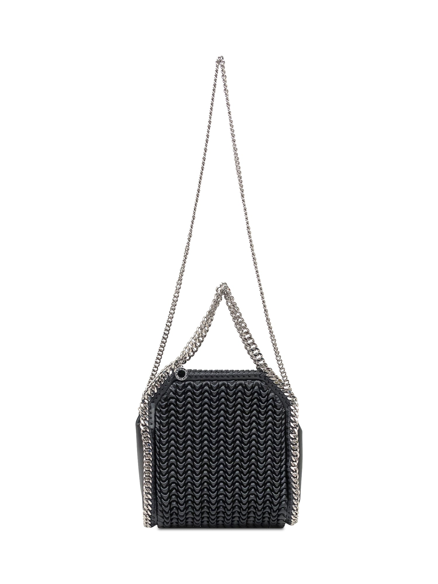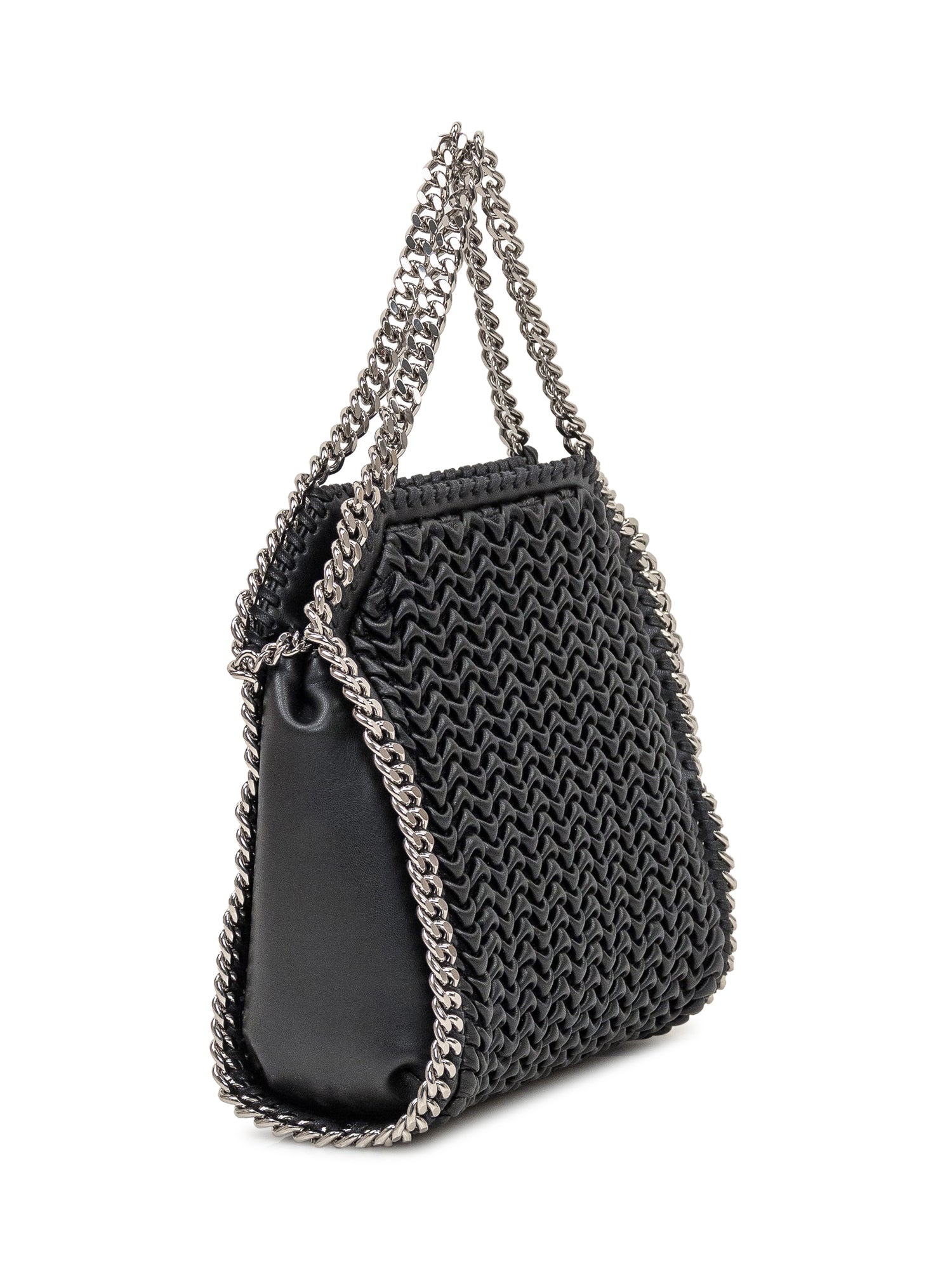 Borsa Falabella Stella McCartney in tessuto intrecciato nero con profili a catena argentata e doppi manici.