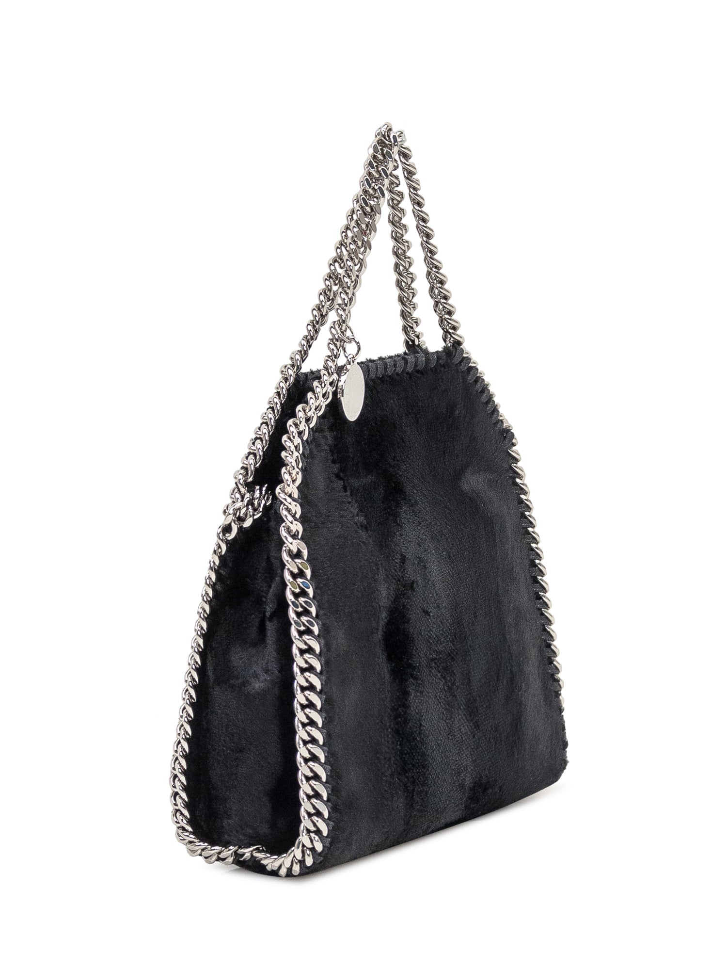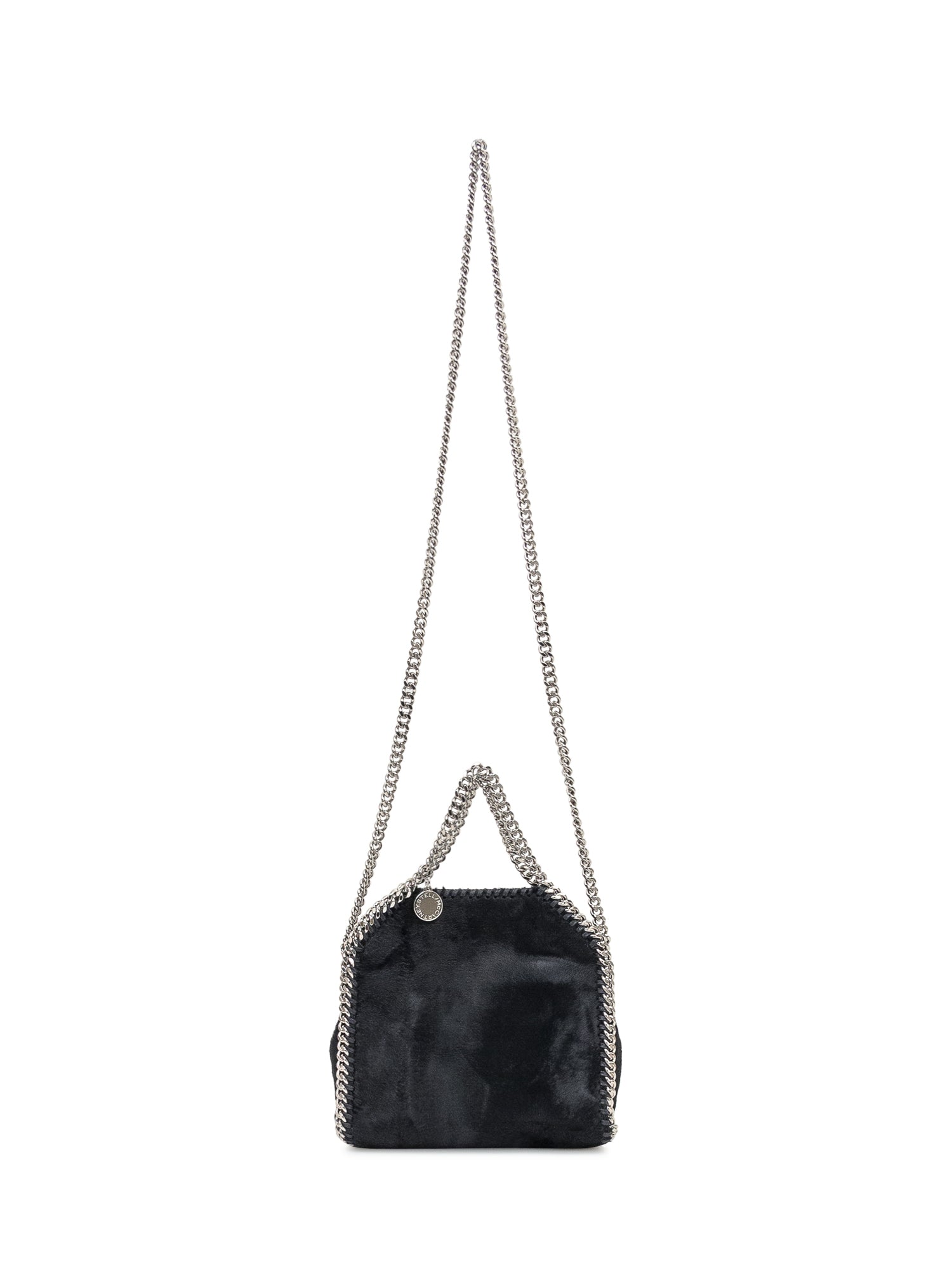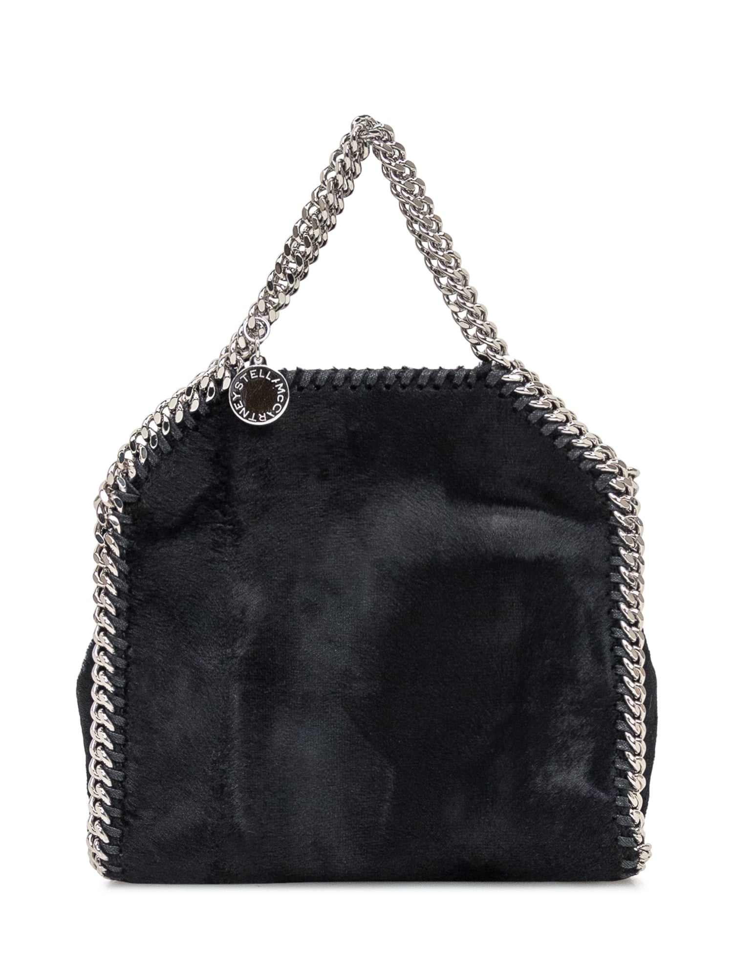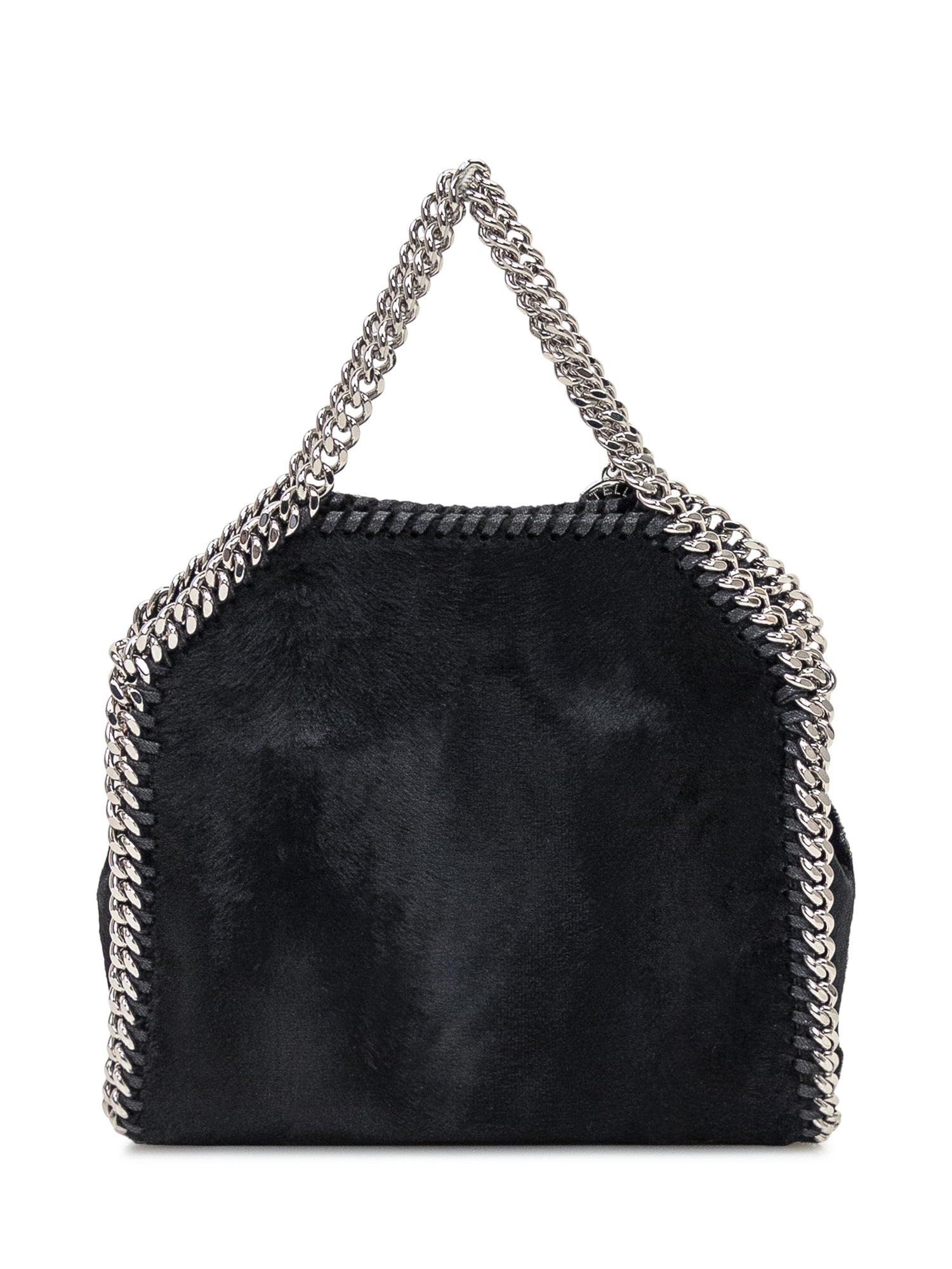 Borsa Falabella Tiny Stella McCartney in morbida eco pelliccia nera con catena argento e doppi manici.