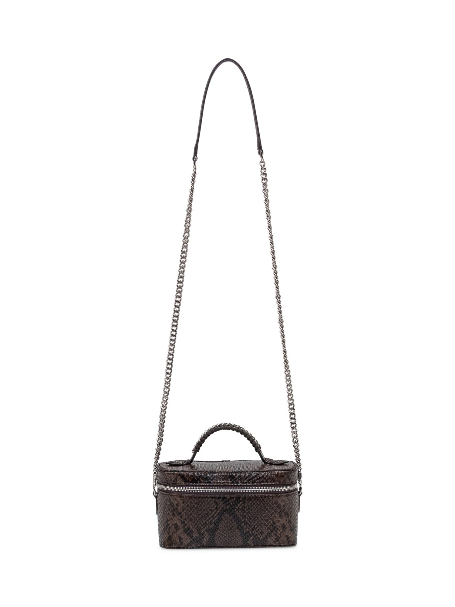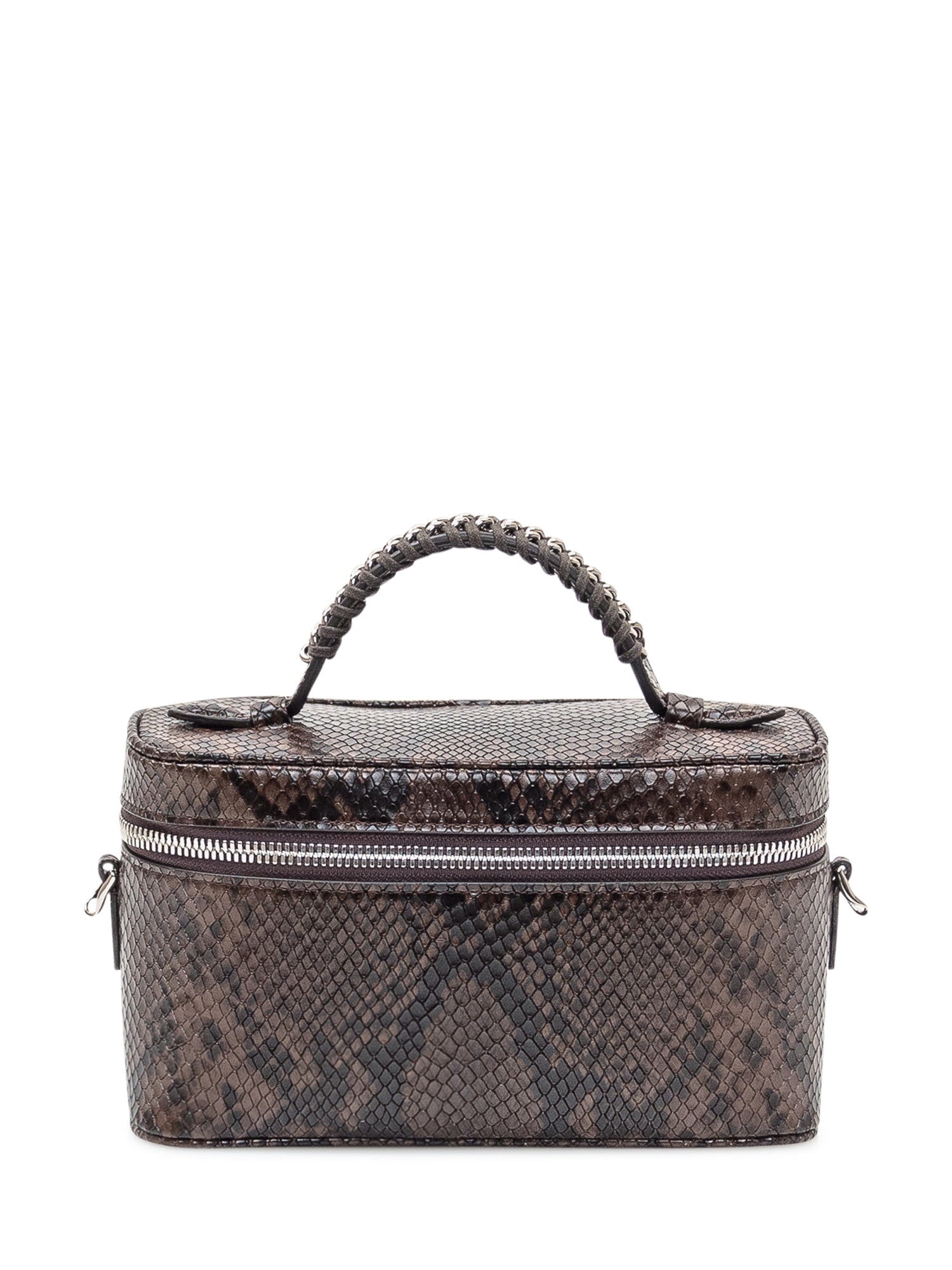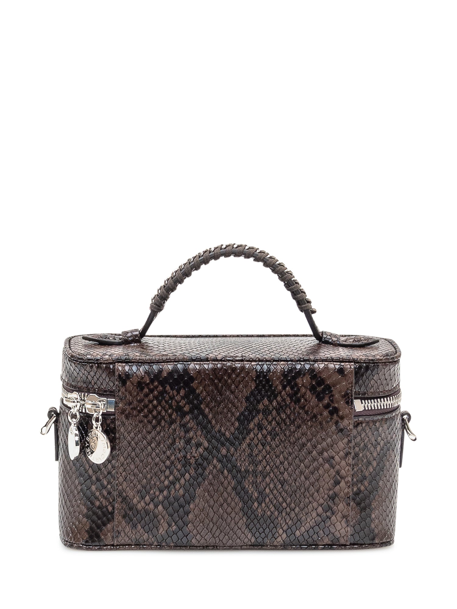 Borsa vanity effetto pitone con manico superiore intrecciato e chiusura zip a doppio cursore. Compatta e strutturata, perfetta per organizzare accessori e cosmetici con stile raffinato.