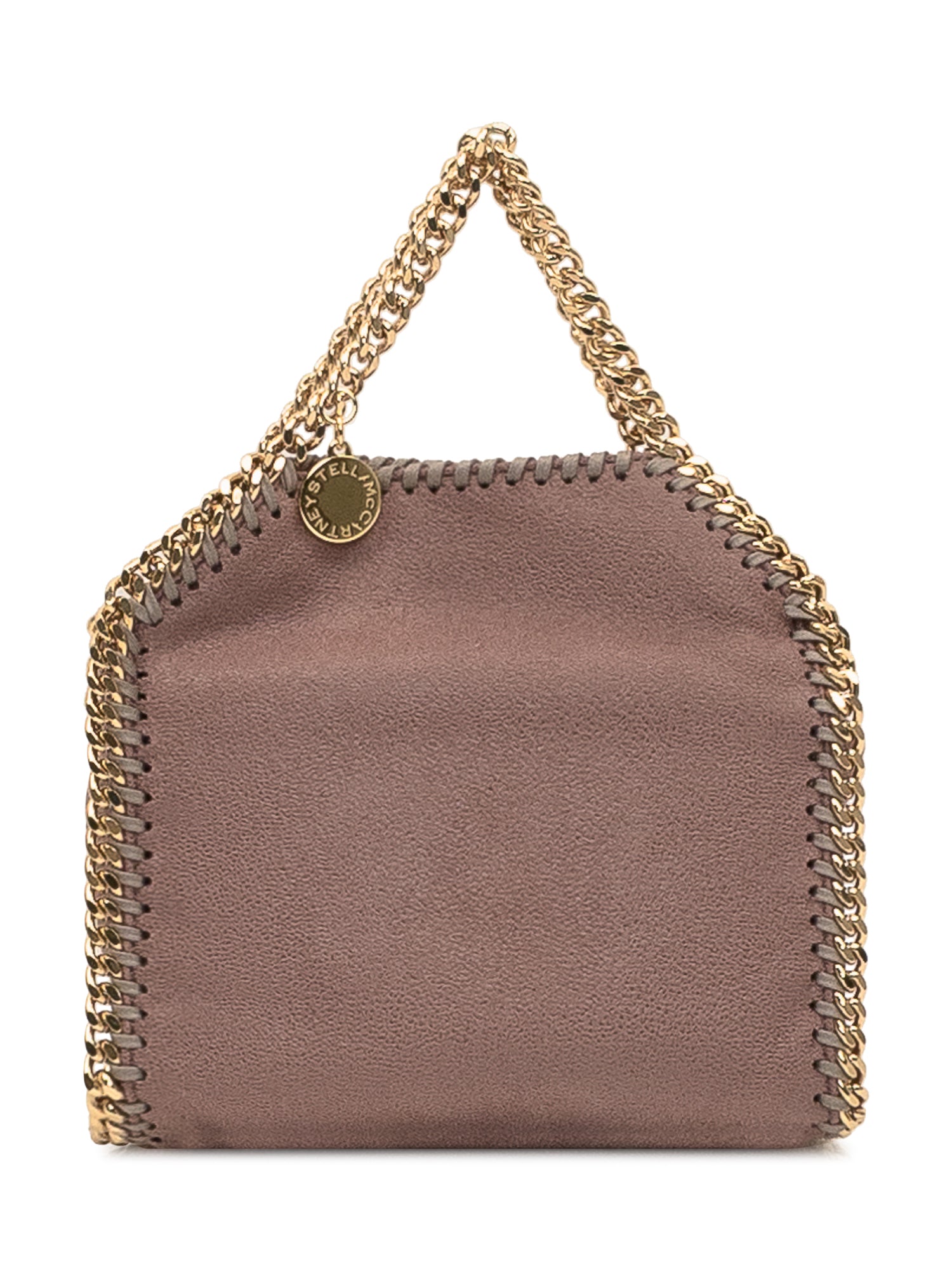 Borsa Stella McCartney modello Falabella Tiny color tortora, rifinita con le iconiche catene dorate e impunture a vista.