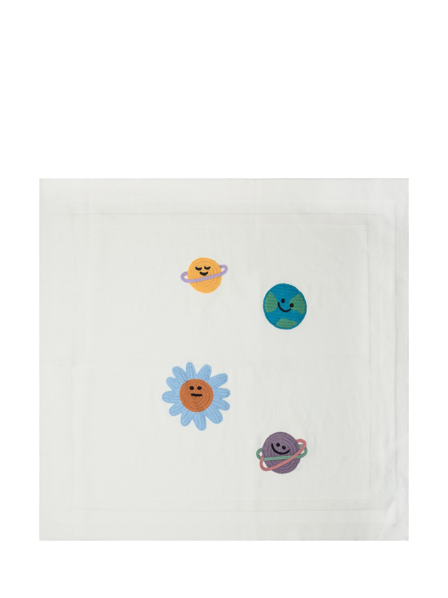 Foulard Kenzo in cotone bianco con ricami multicolor raffiguranti pianeti e fiori stilizzati.