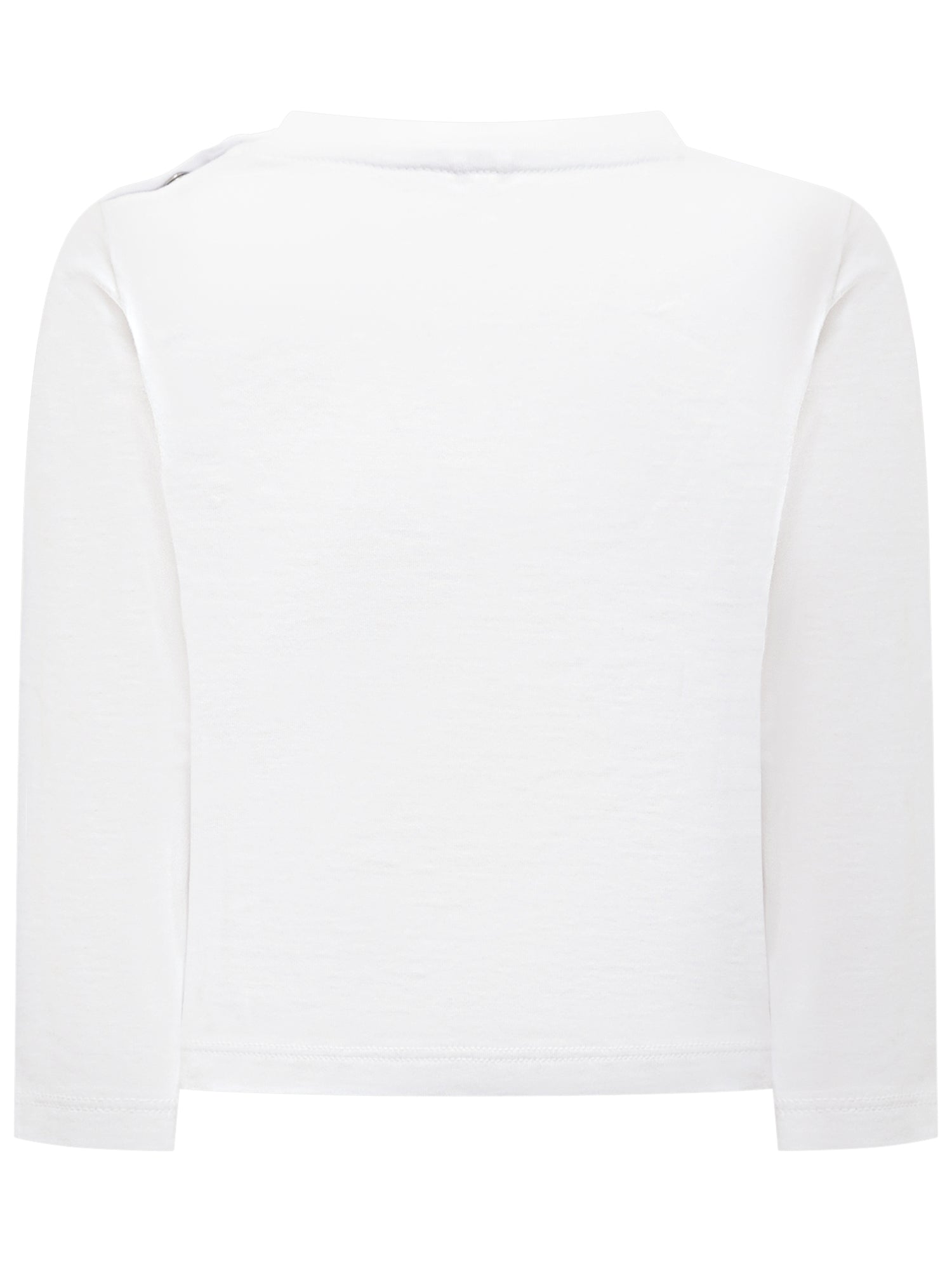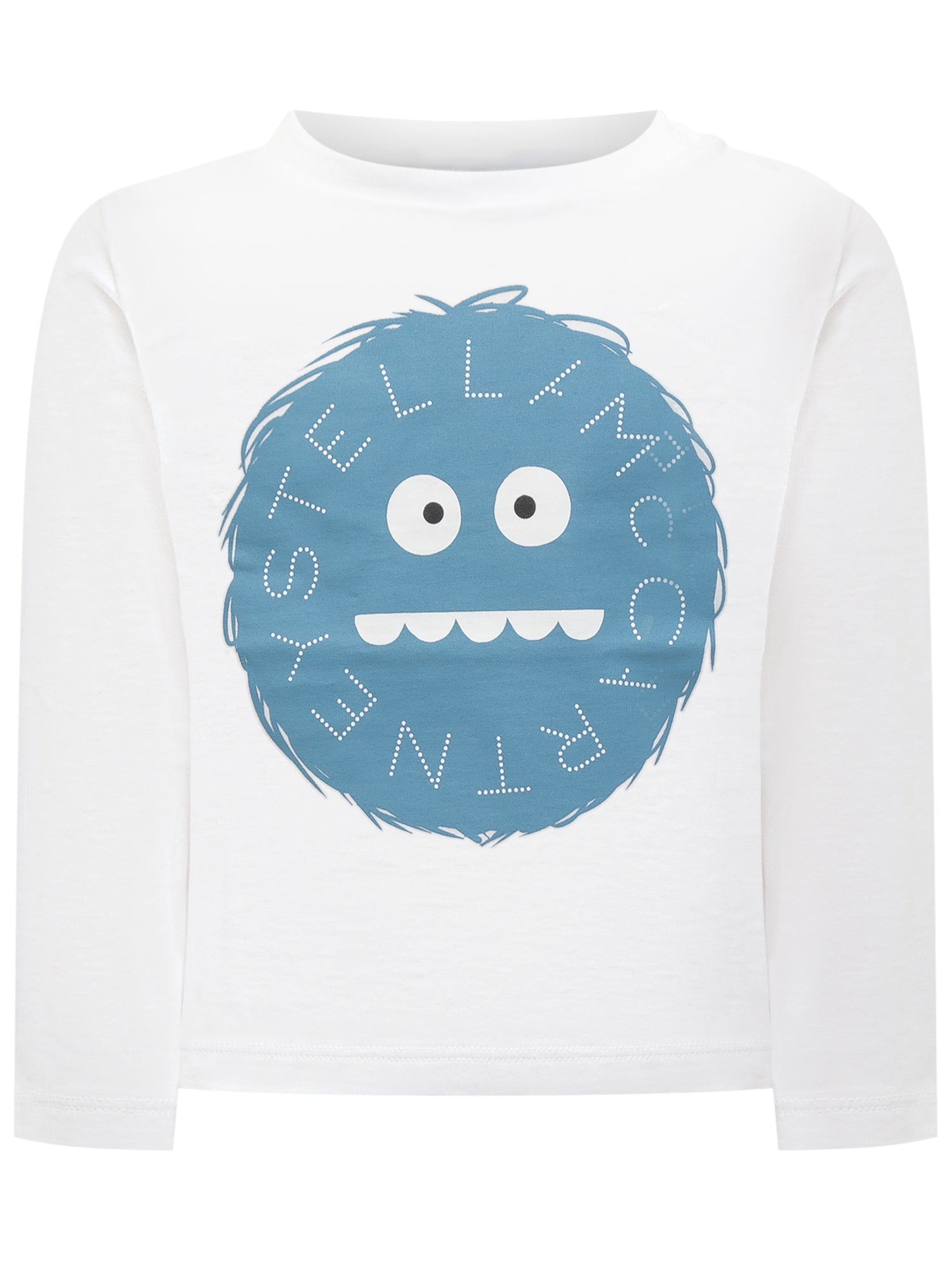 Maglia bianca a maniche lunghe da bambino firmata Stella McCartney Kids, decorata con una simpatica stampa blu e logo del brand in stile puntinato.