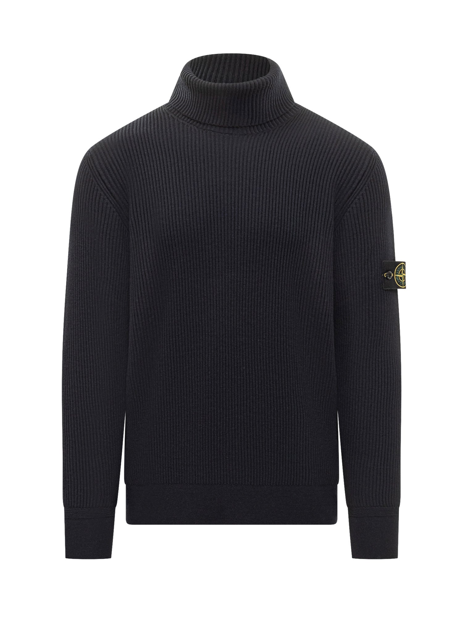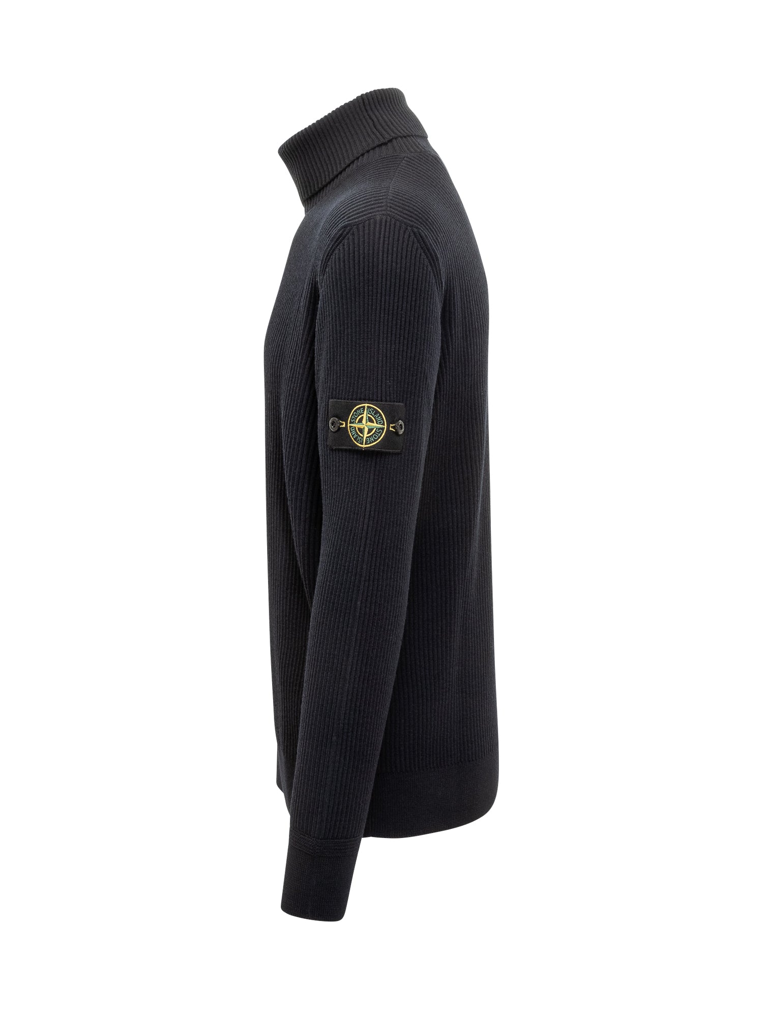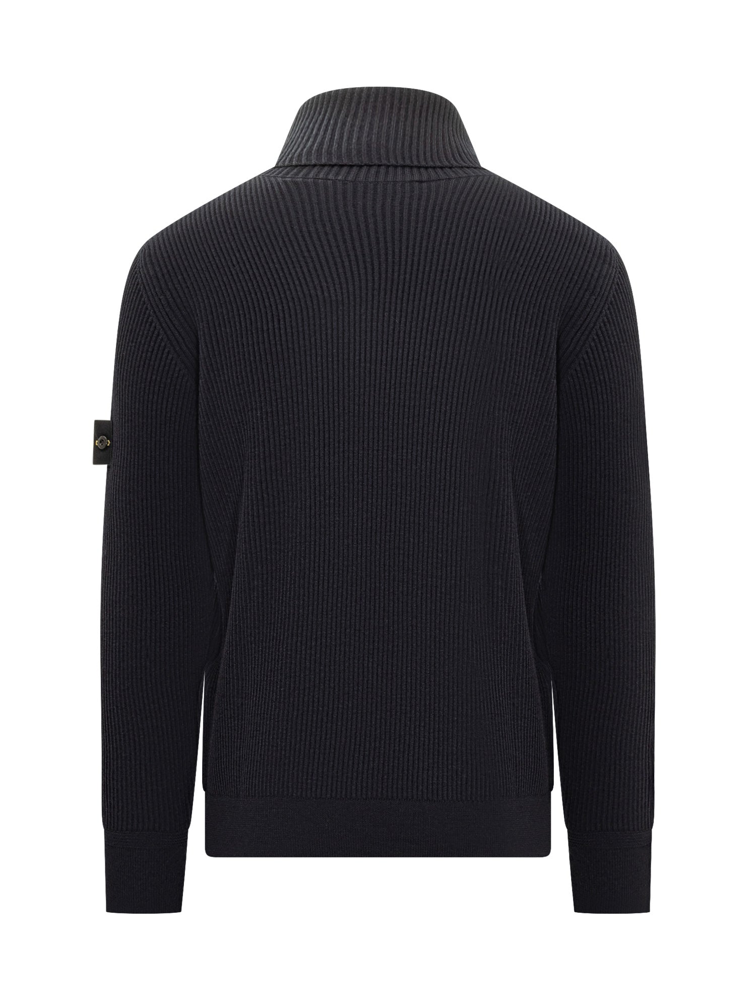 Maglione Stone Island in lana a costine con collo alto e patch logo sulla manica.