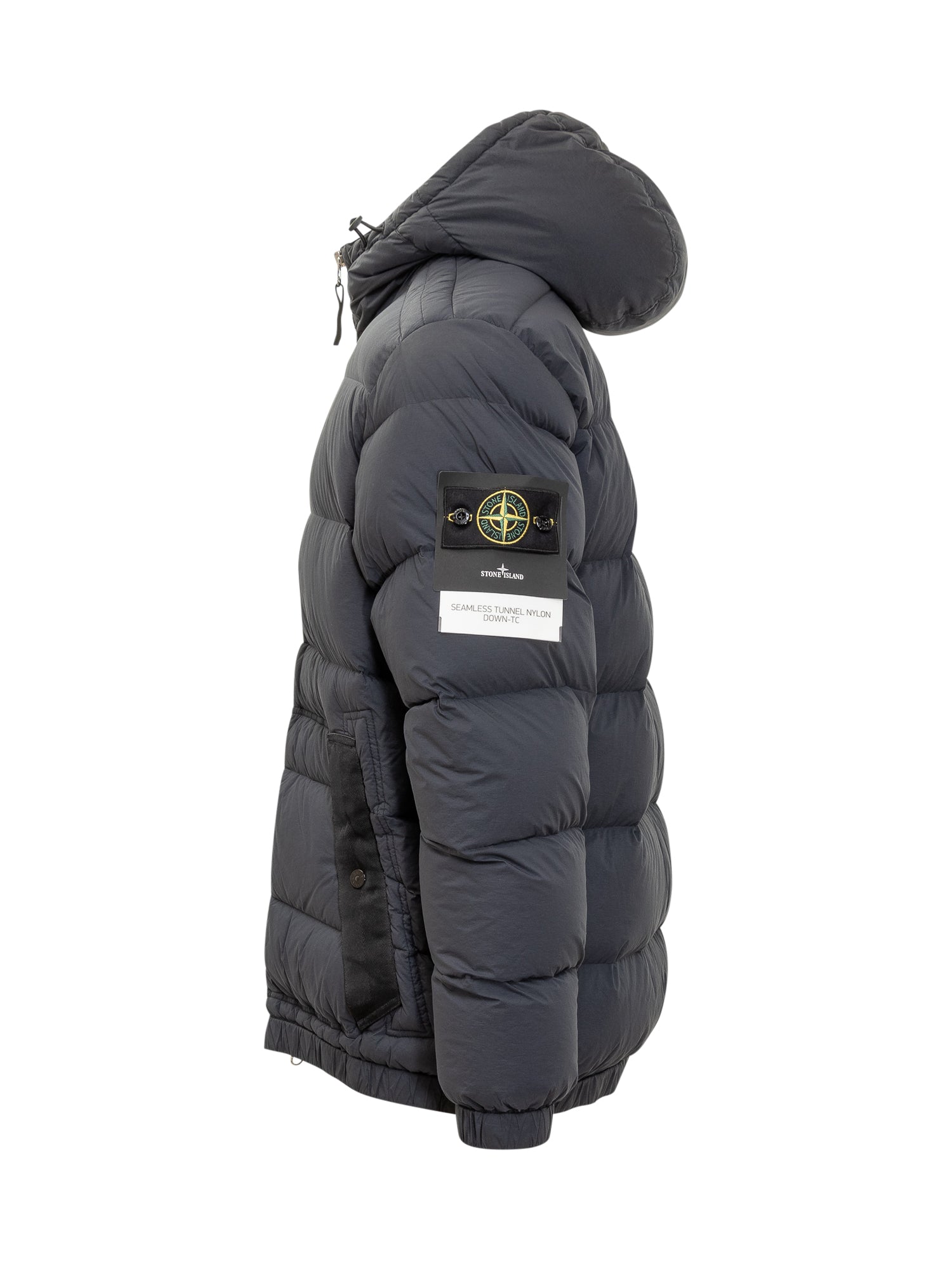 Giacca imbottita Stone Island in tessuto tecnico opaco. Modello con cappuccio regolabile, chiusura zip a doppio cursore e tasche laterali. Logo removibile sulla manica.