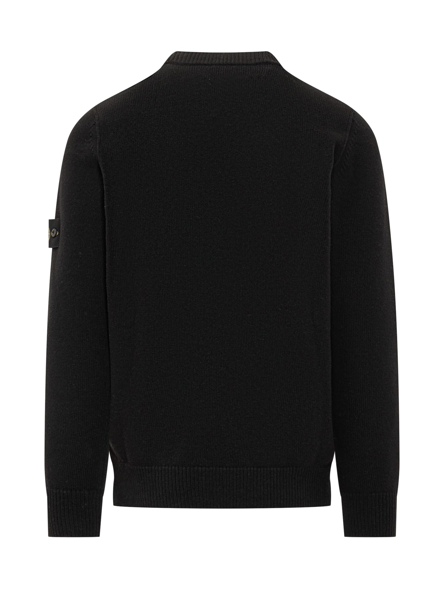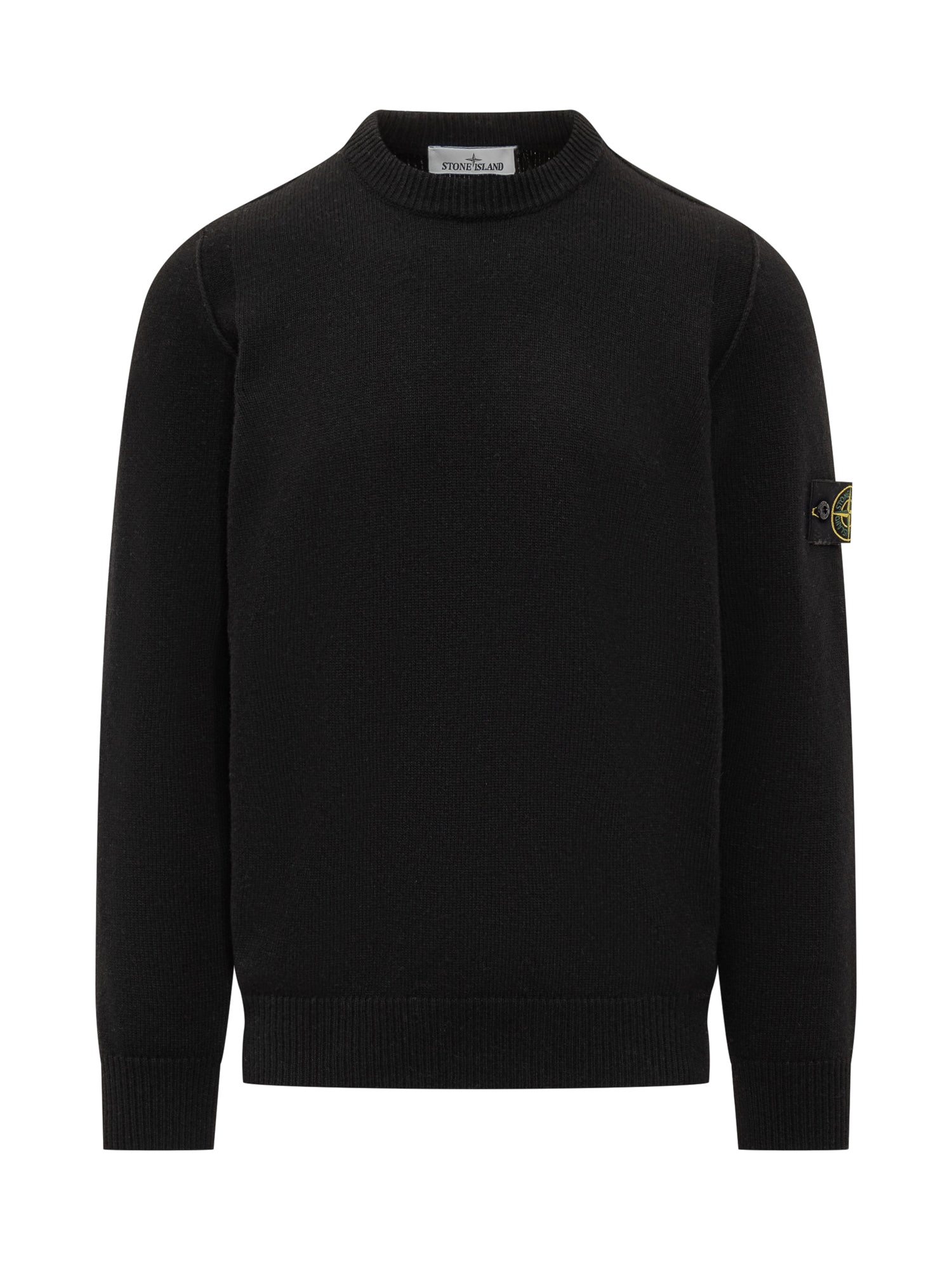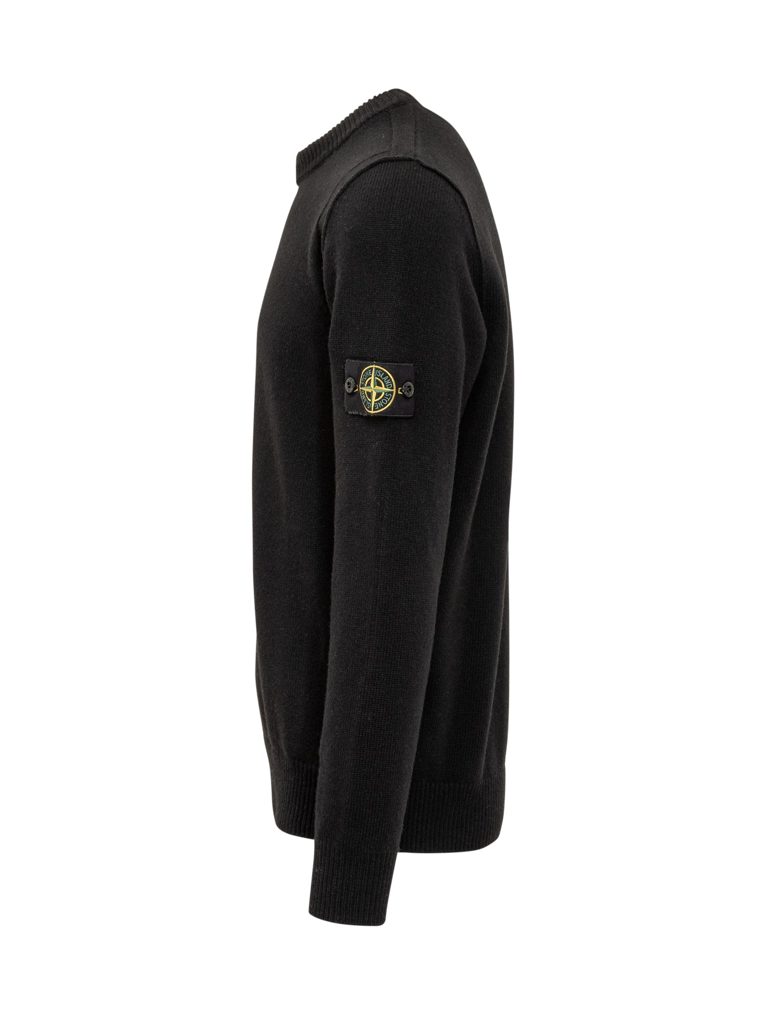 Maglia girocollo nera Stone Island in lana, con iconica patch sulla manica.