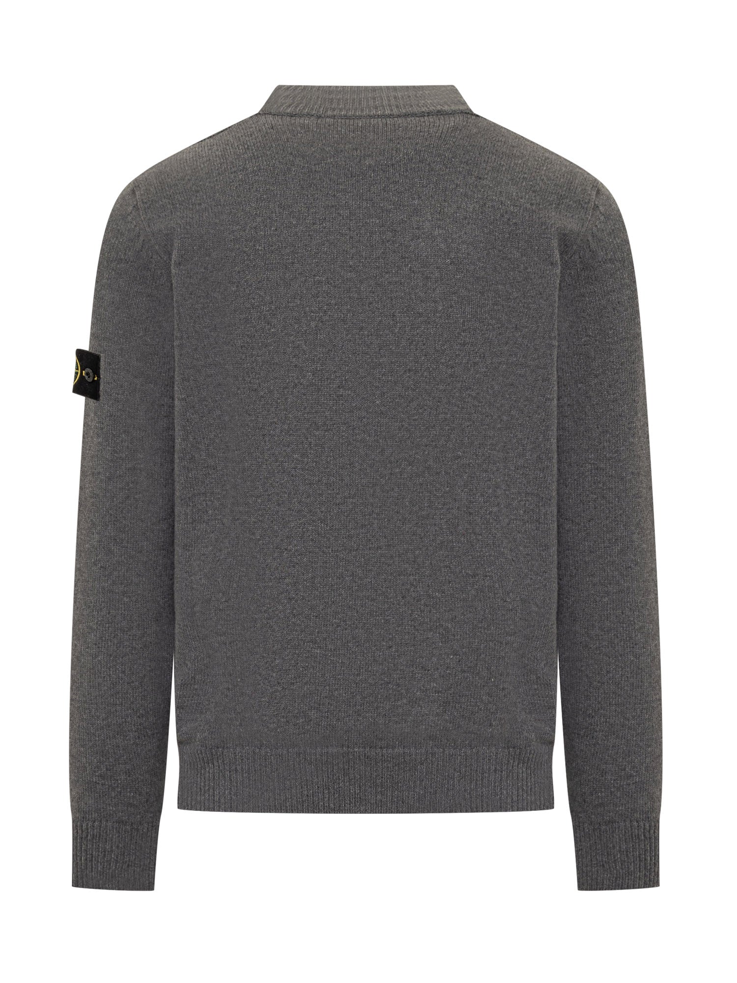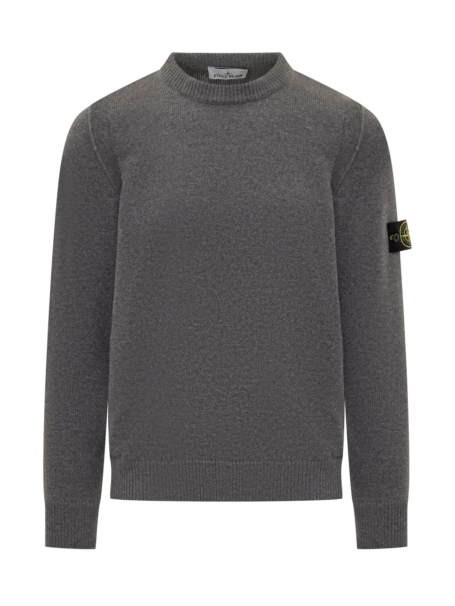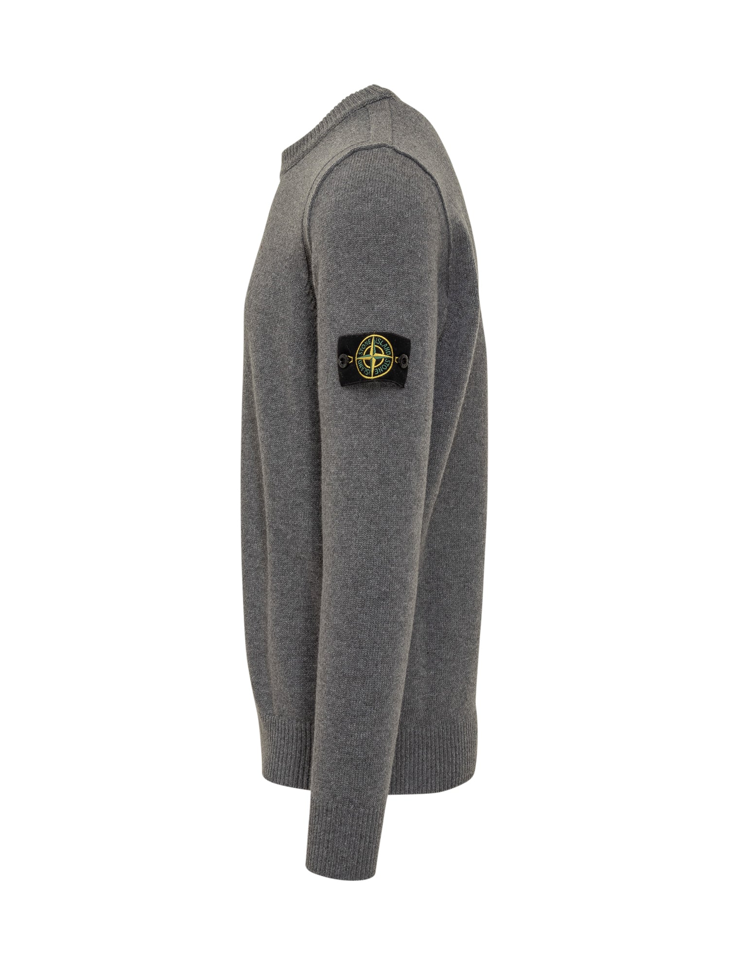 Maglia girocollo Stone Island in lana grigia, con iconico badge sulla manica.