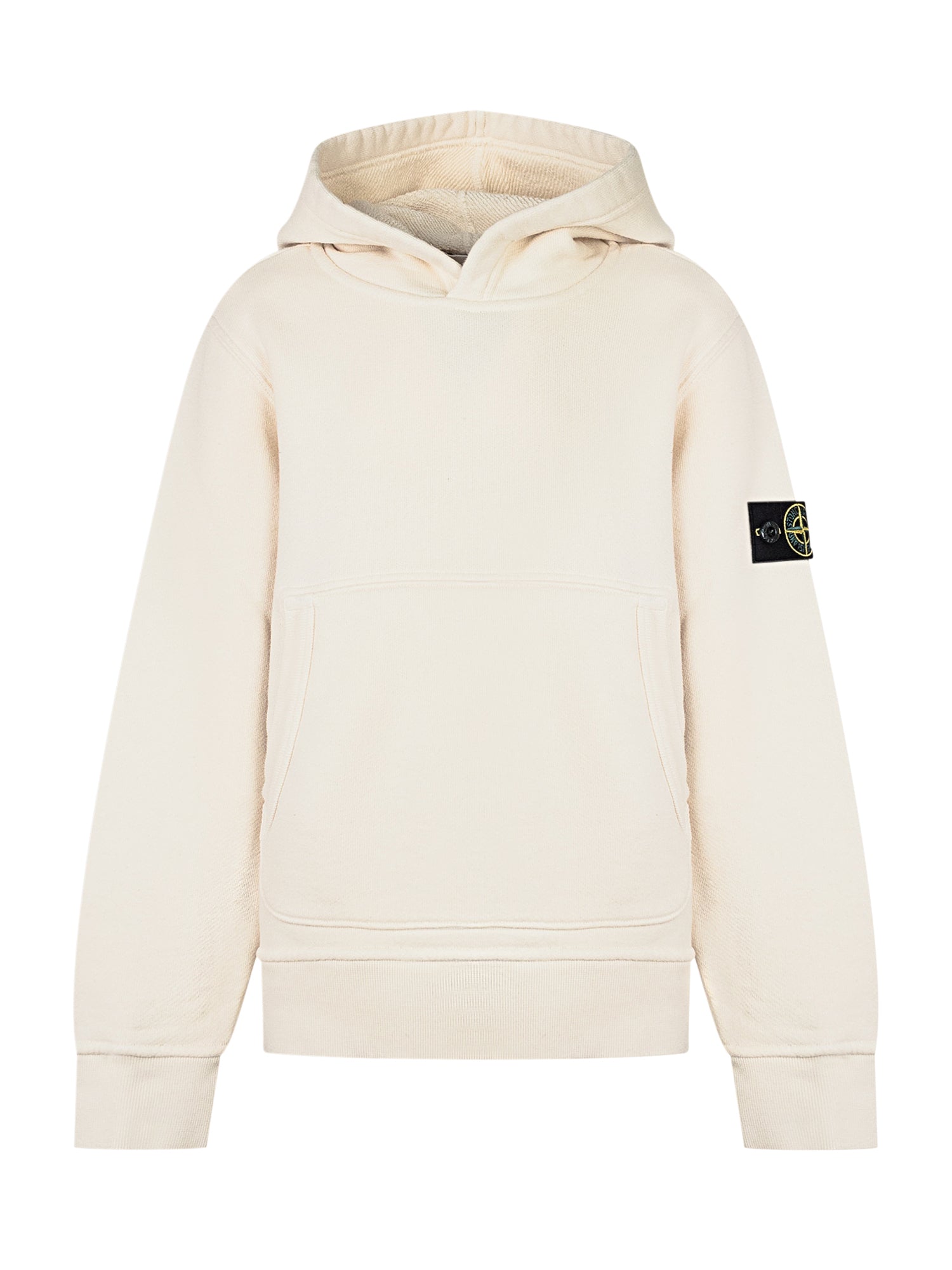 Felpa Stone Island Kids in cotone color avorio con cappuccio, tasca a marsupio e iconico logo sulla manica.