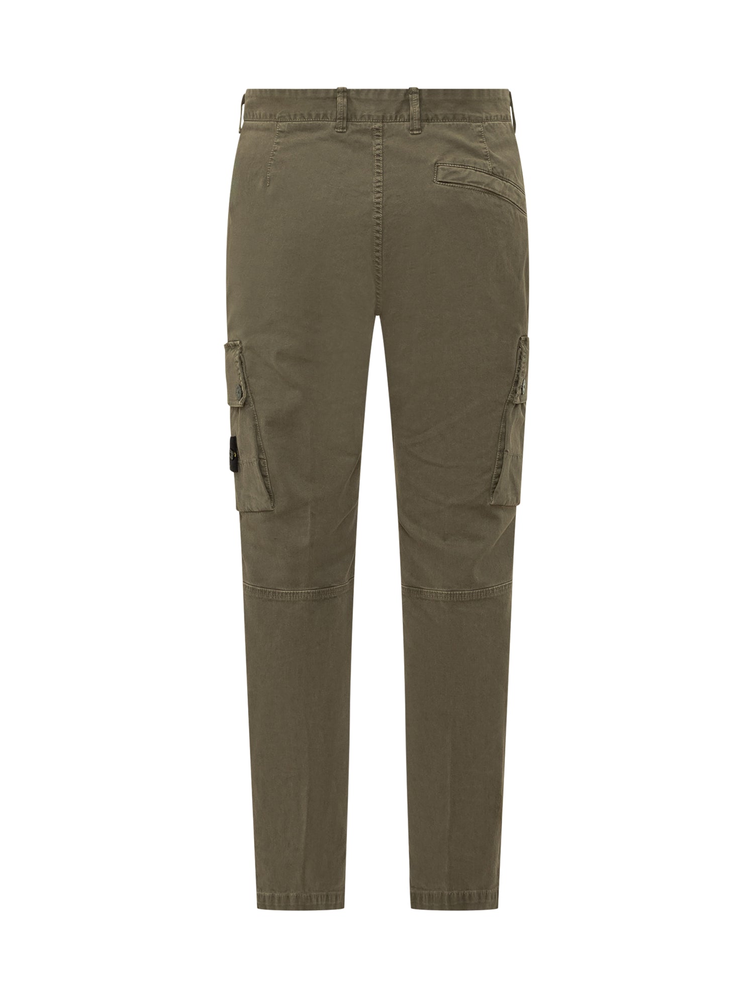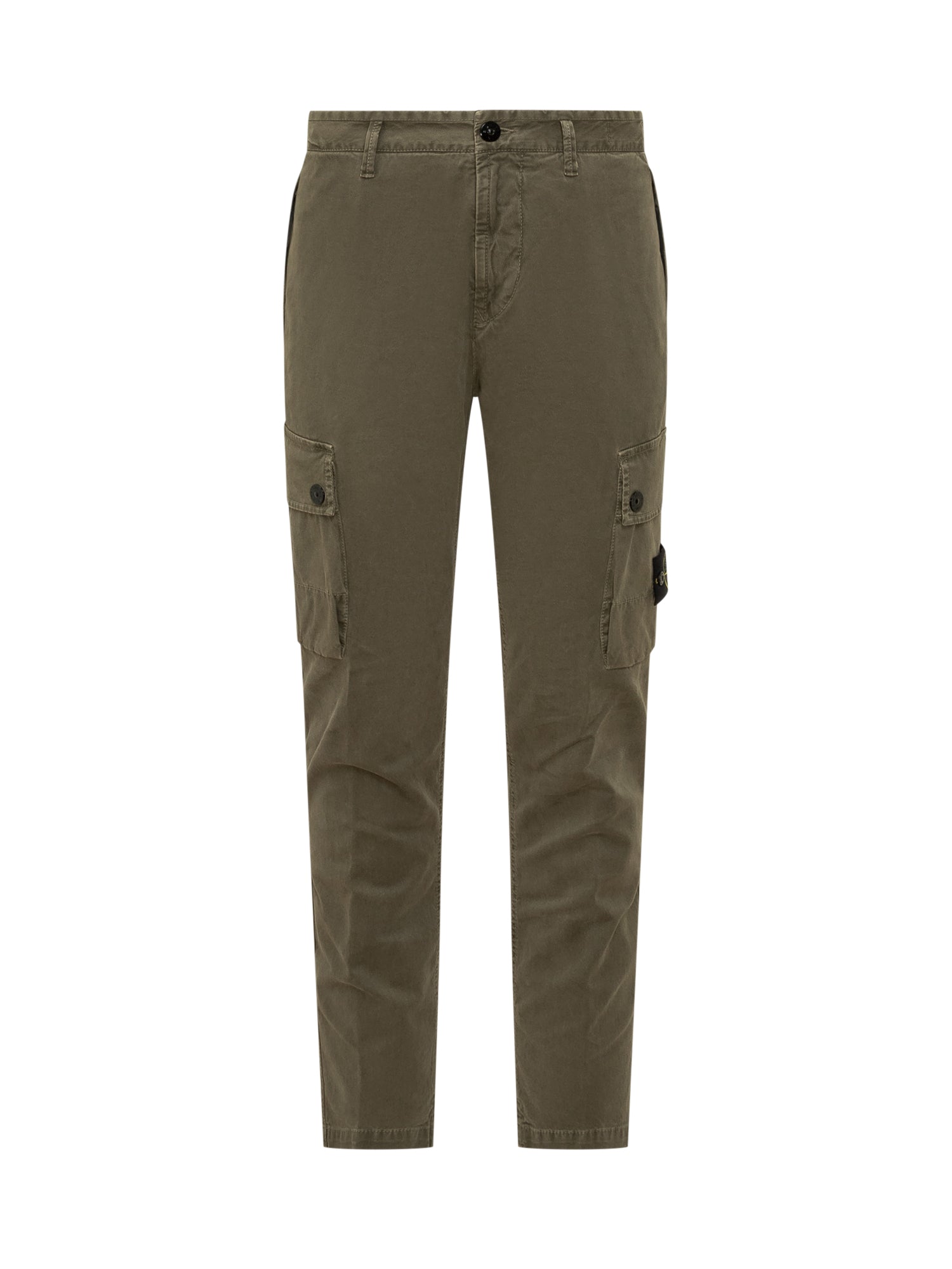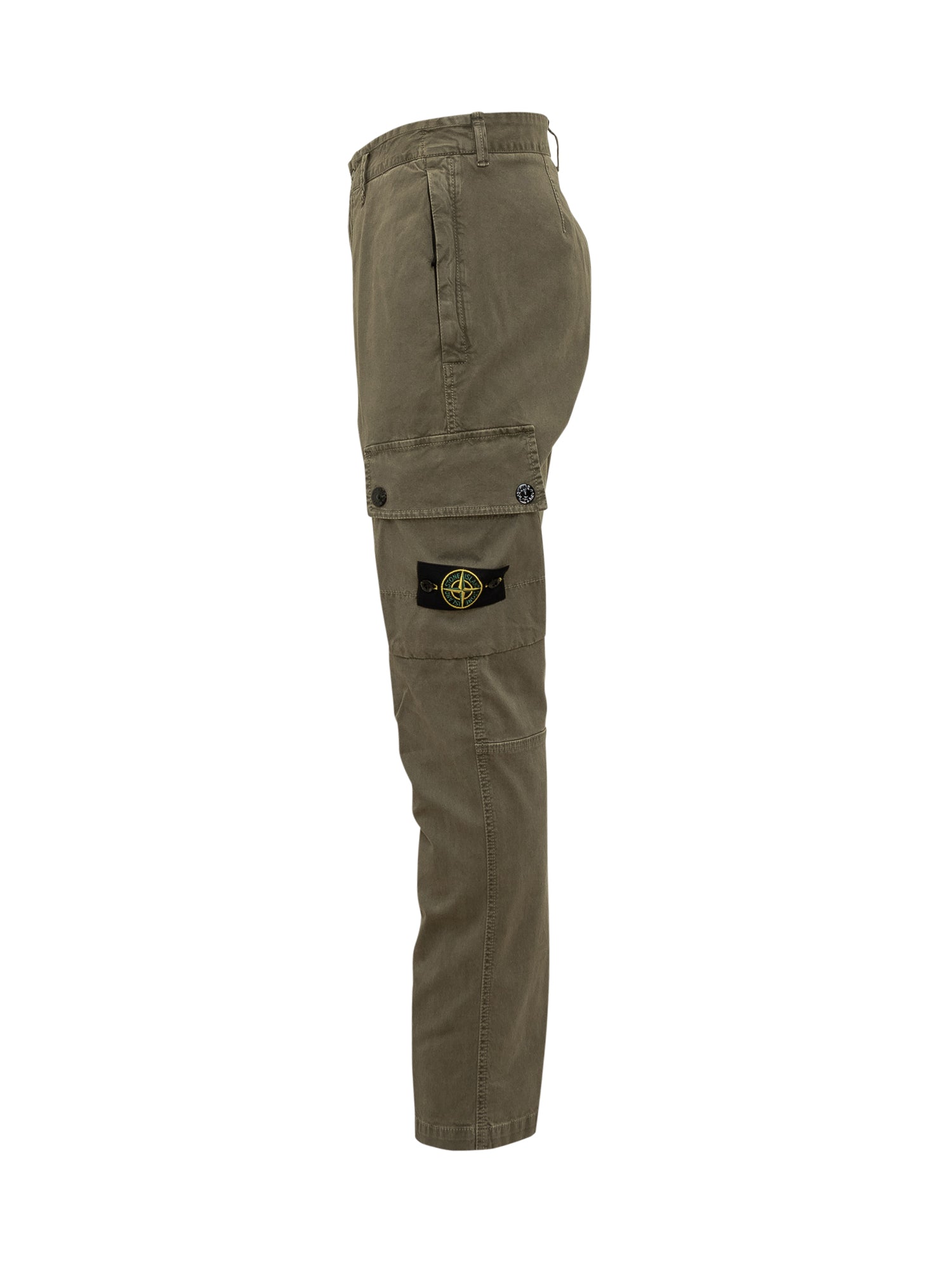 Pantaloni cargo Stone Island in cotone verde militare con tasche laterali e iconico badge con bussola. Chiusura con zip e bottone, passanti in vita.