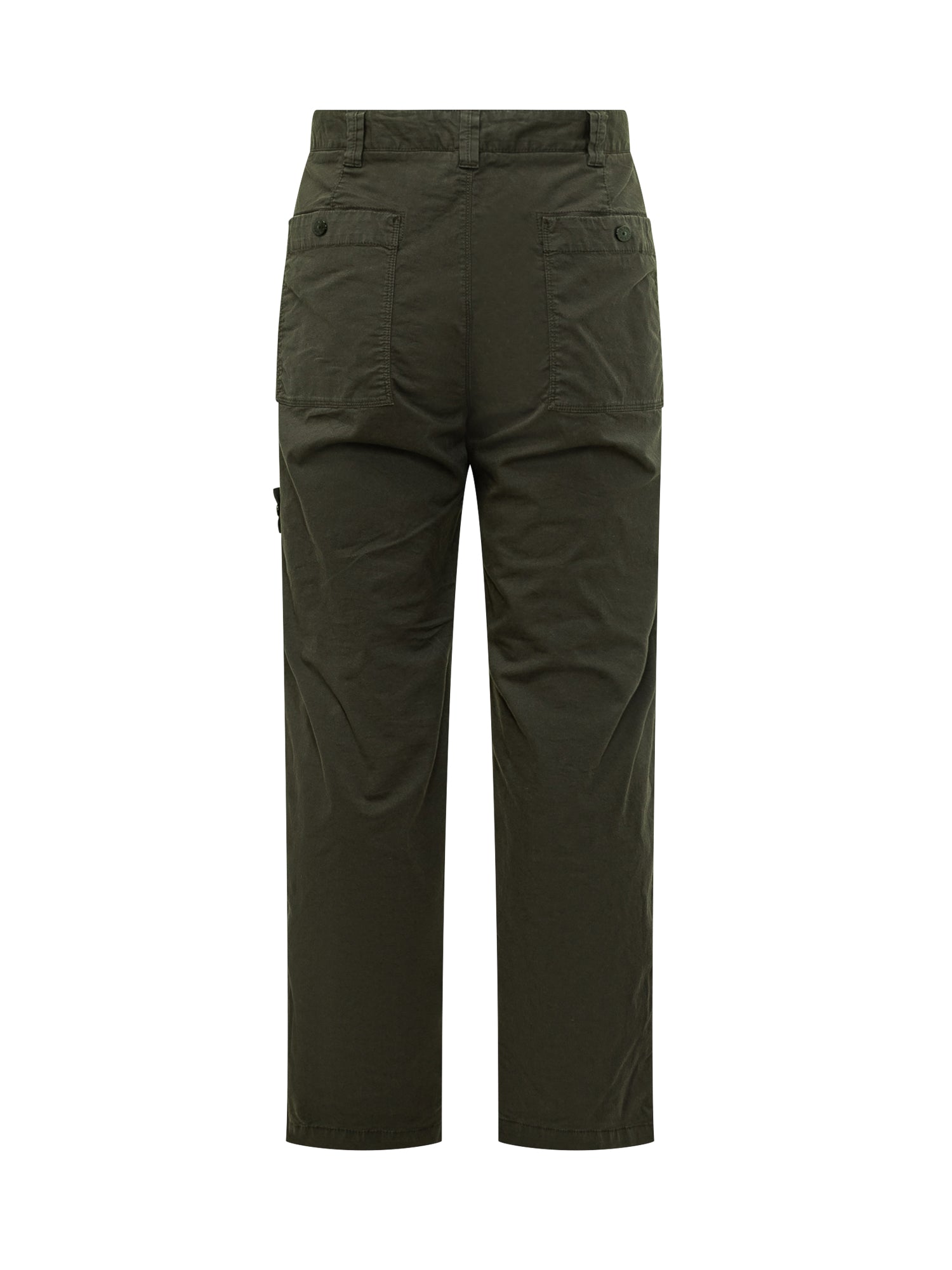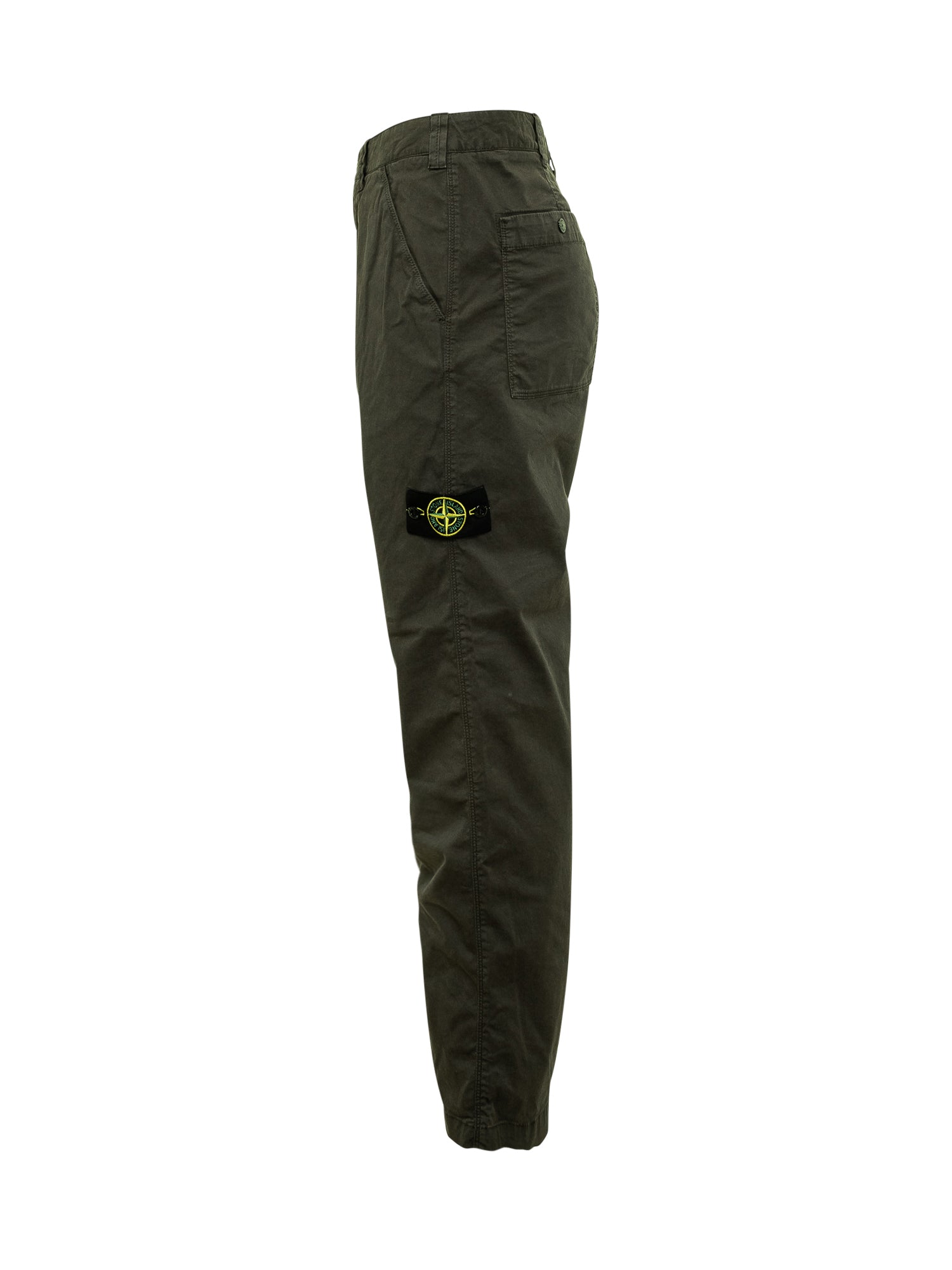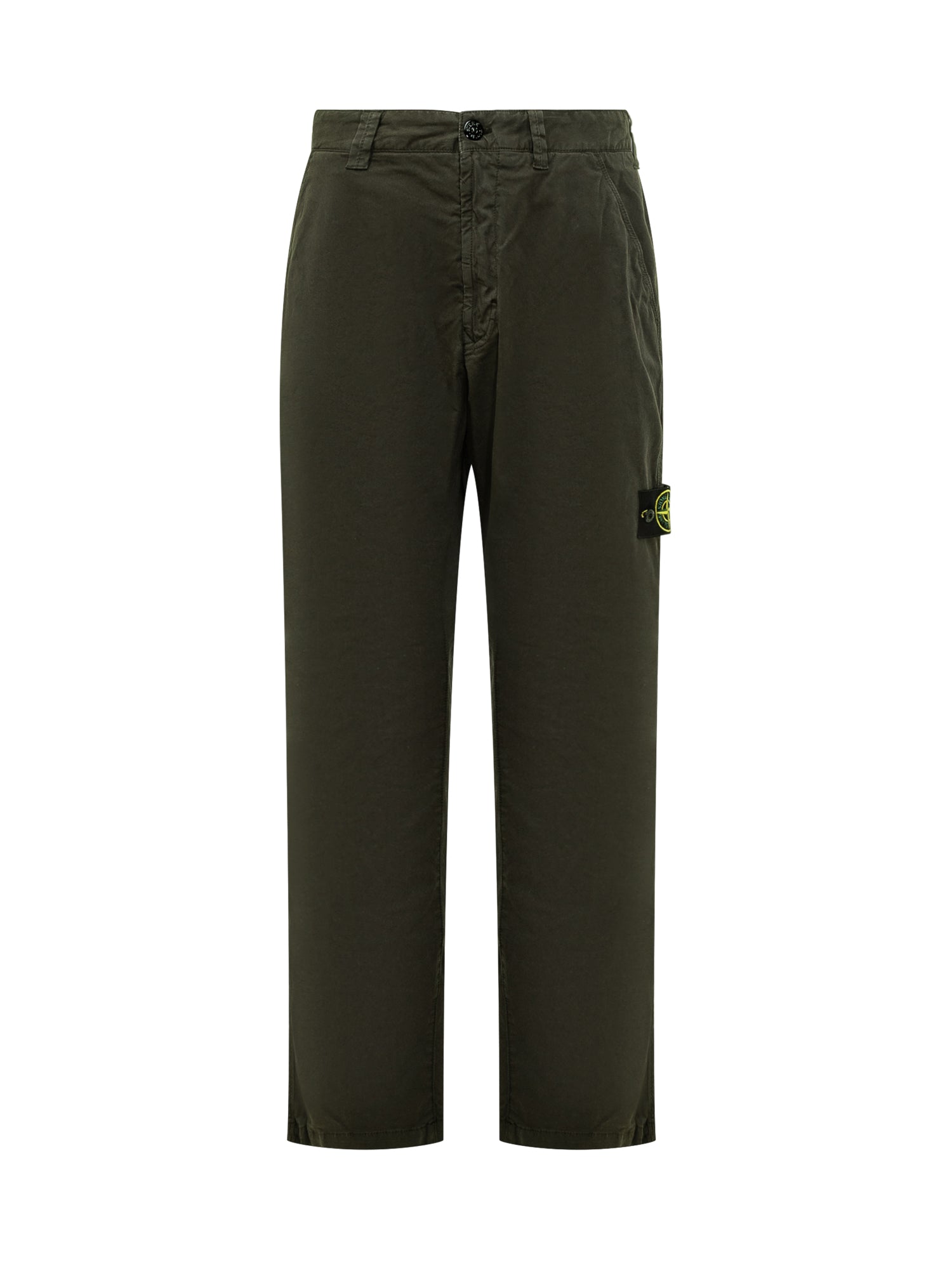 Pantaloni Stone Island in cotone verde con chiusura a bottone e zip, tasche laterali e iconico badge con logo sulla gamba.