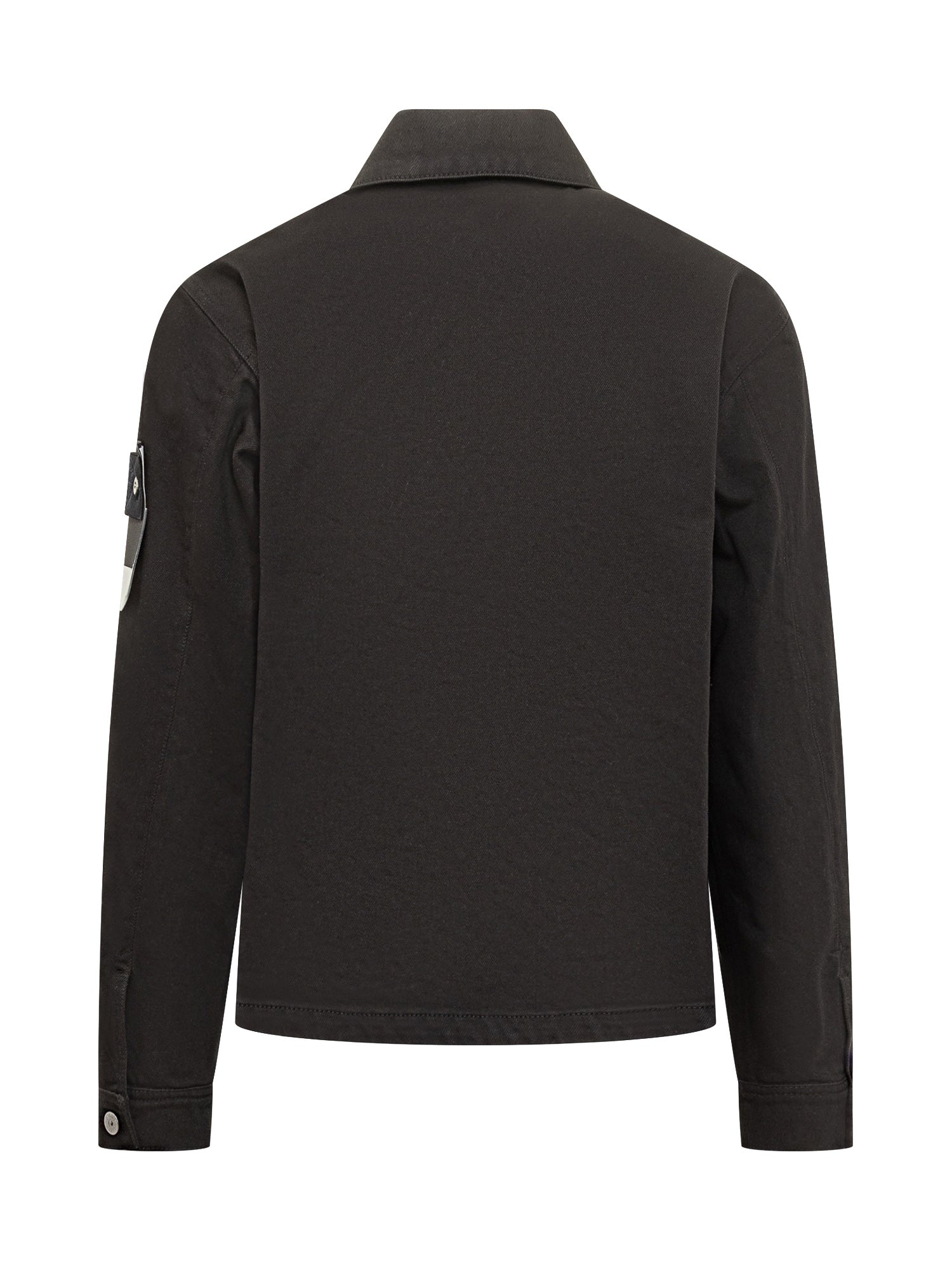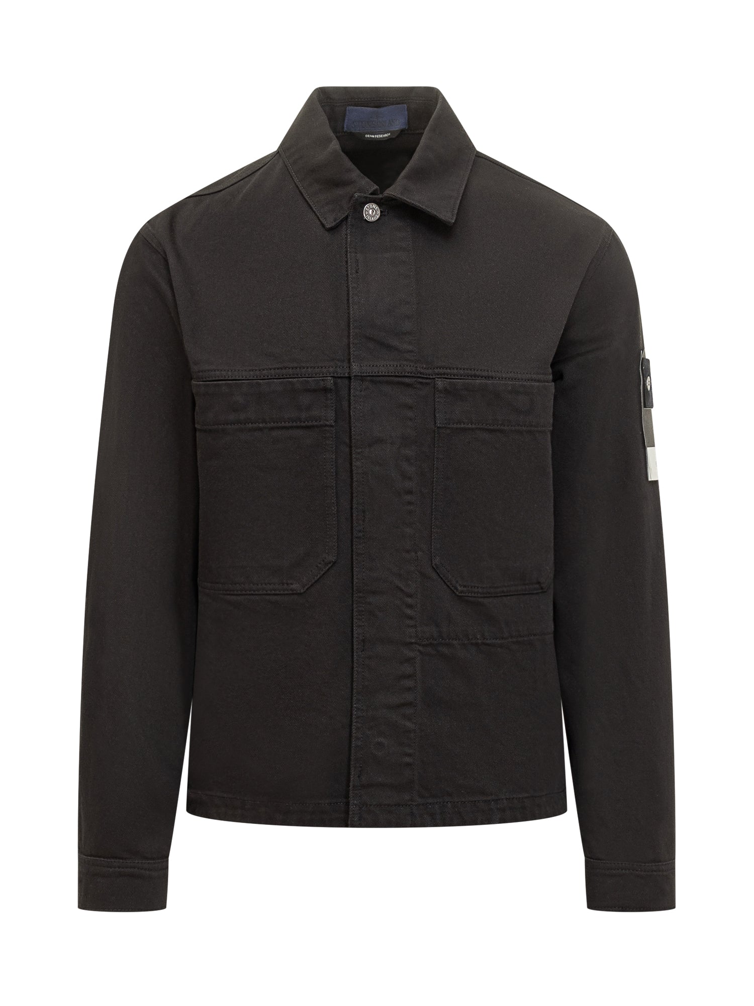 Giacca in bull denim nero Stone Island con tasche frontali applicate, chiusura con bottoni e logo sulla manica. Taglio dritto e design essenziale.