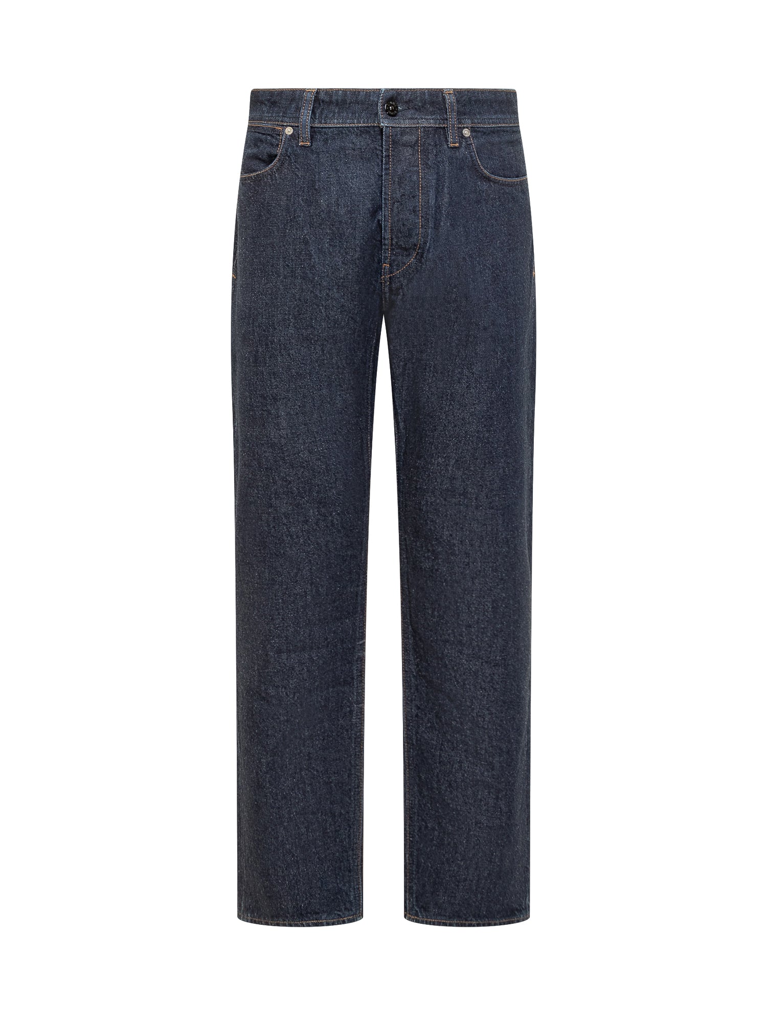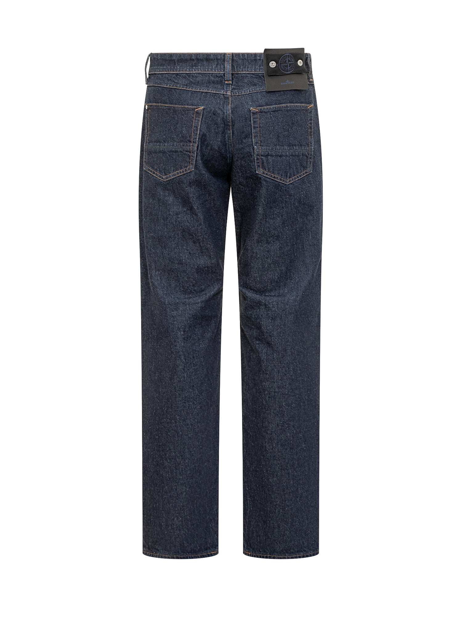 Jeans Stone Island in denim blu a gamba dritta, con cuciture a contrasto e patch logata sul retro.