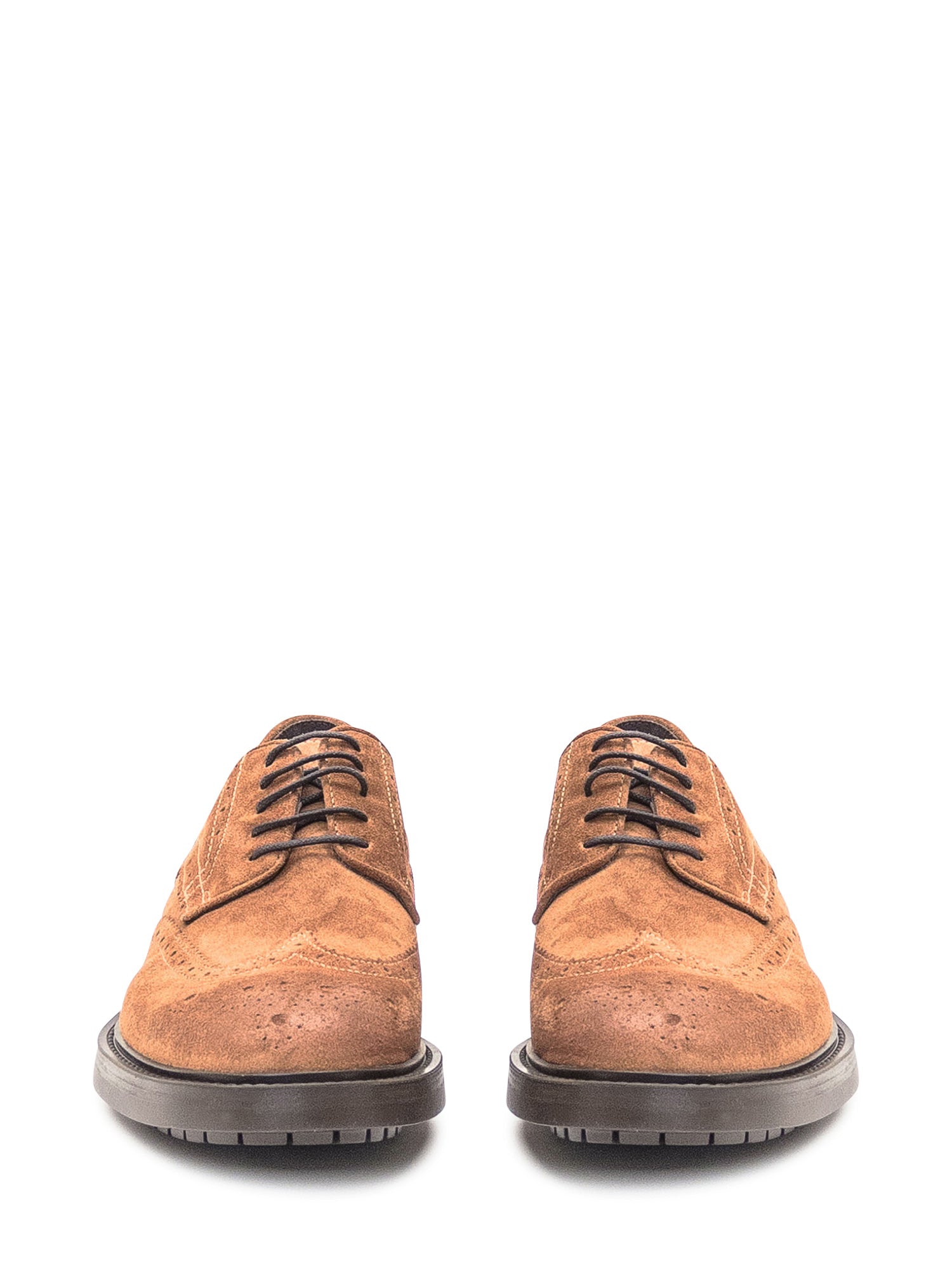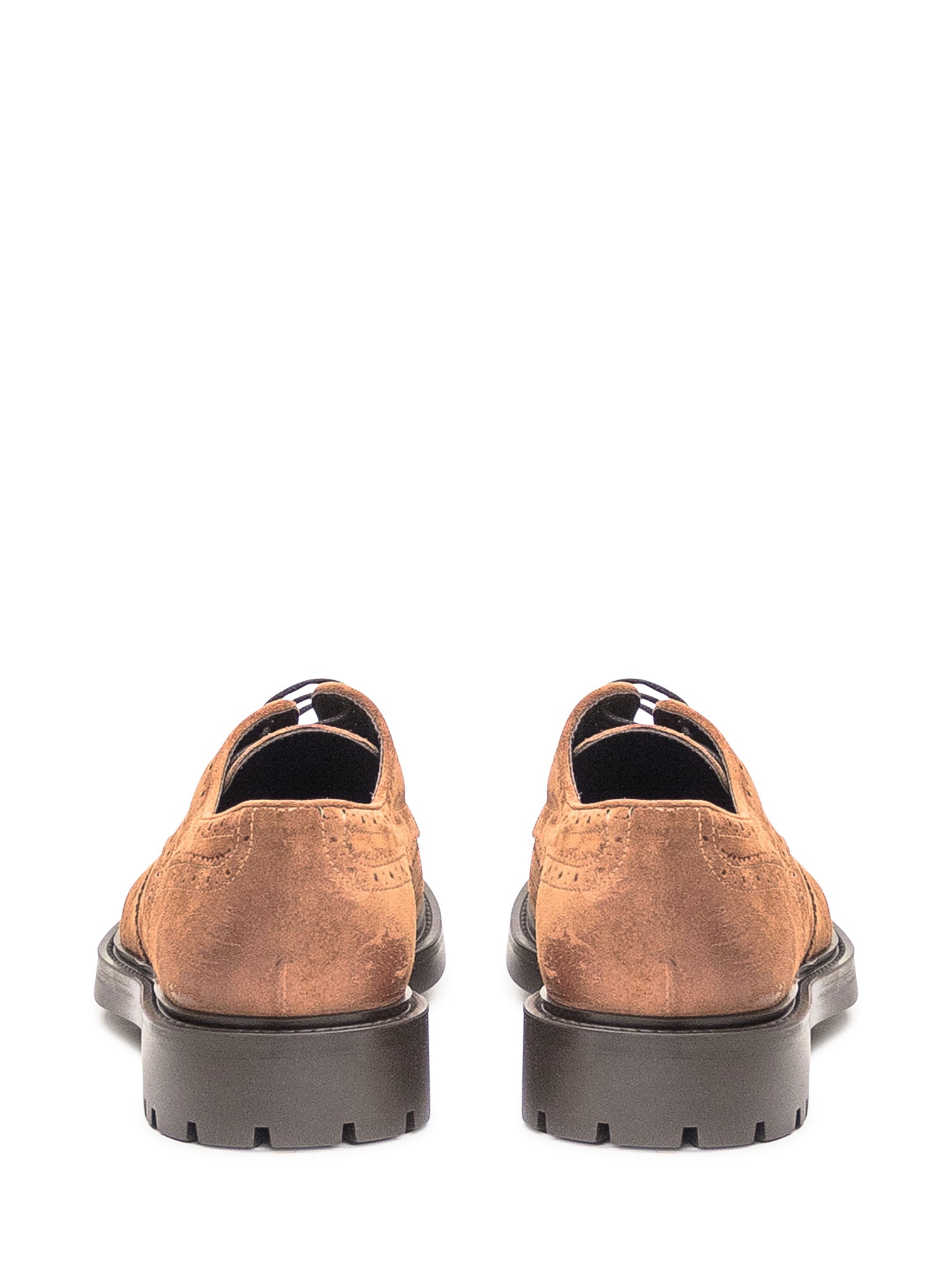 Brogue Sturlini in camoscio cuoio con dettagli traforati e suola carrarmato.