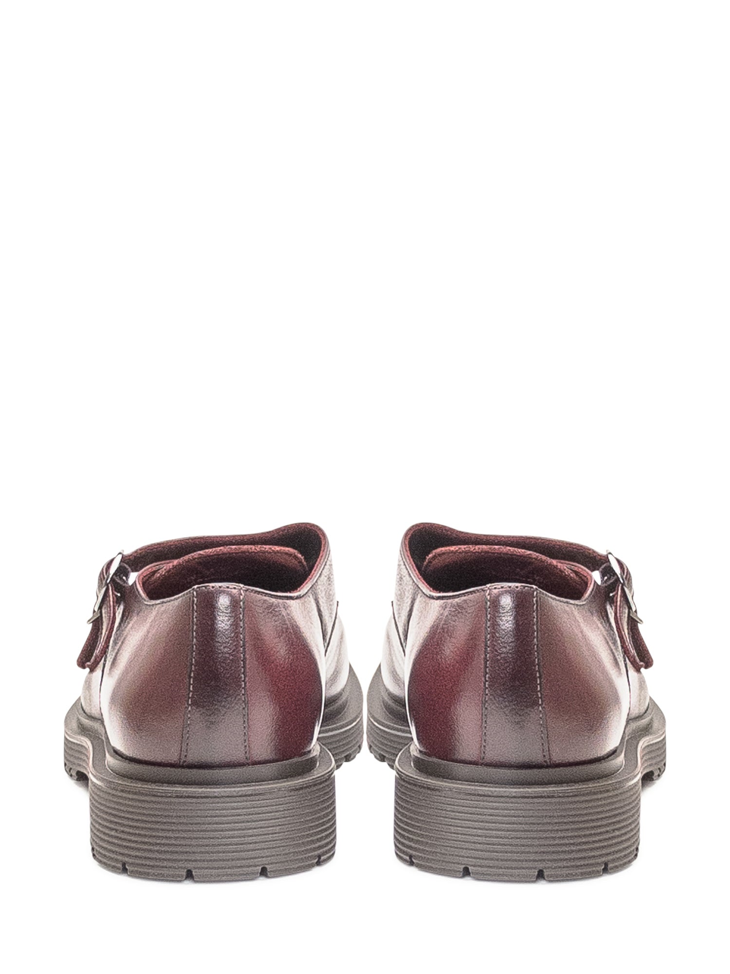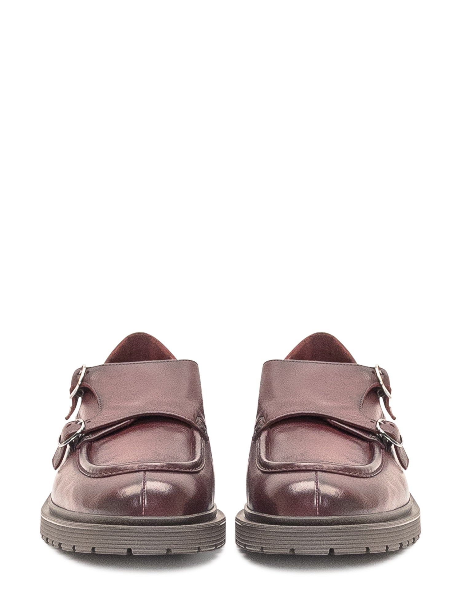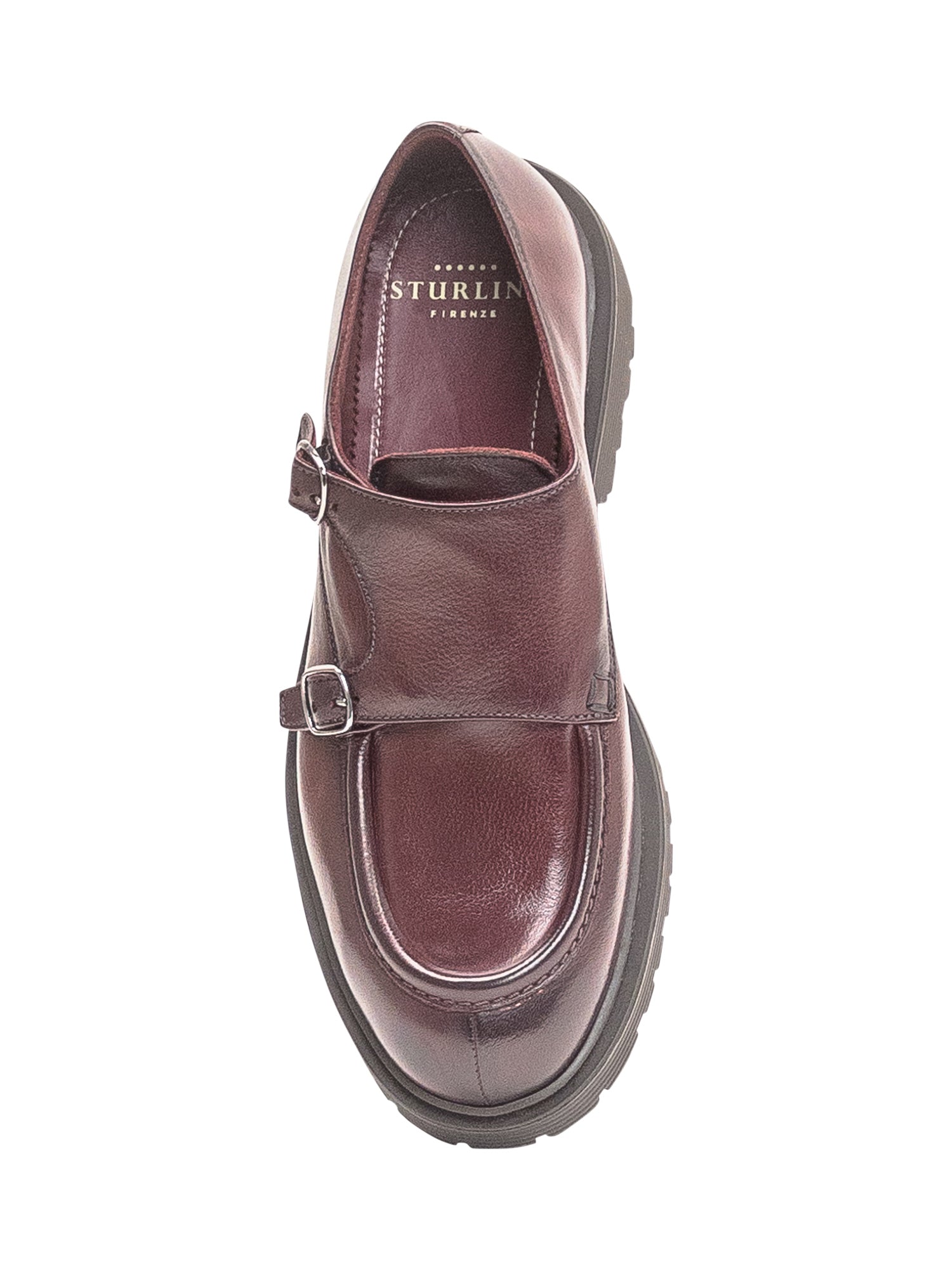 Scarpa doppia fibbia Sturlini in pelle bordeaux lucida, punta tonda e suola carrarmato in gomma.