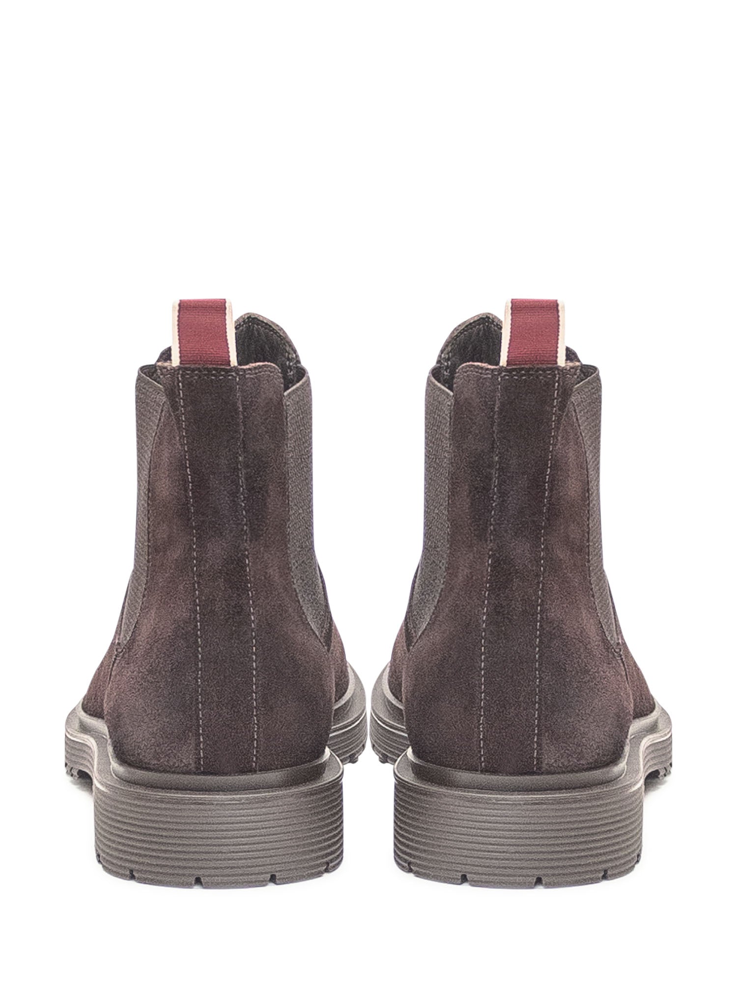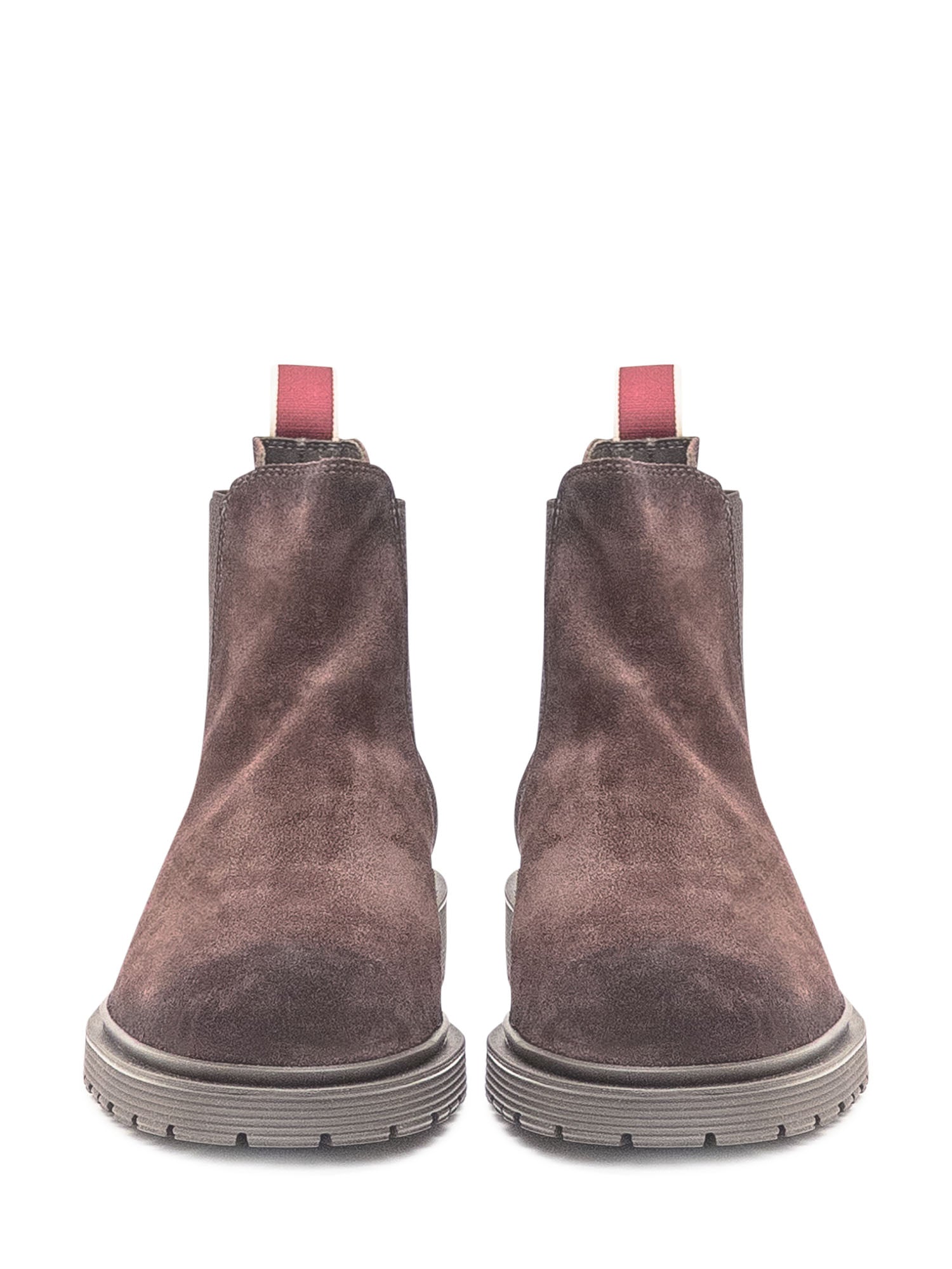 Stivaletto Chelsea Sturlini in camoscio marrone con inserti elastici laterali e linguetta sul tallone.