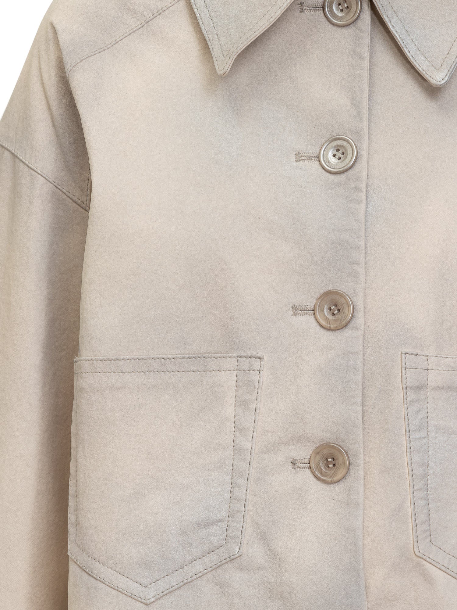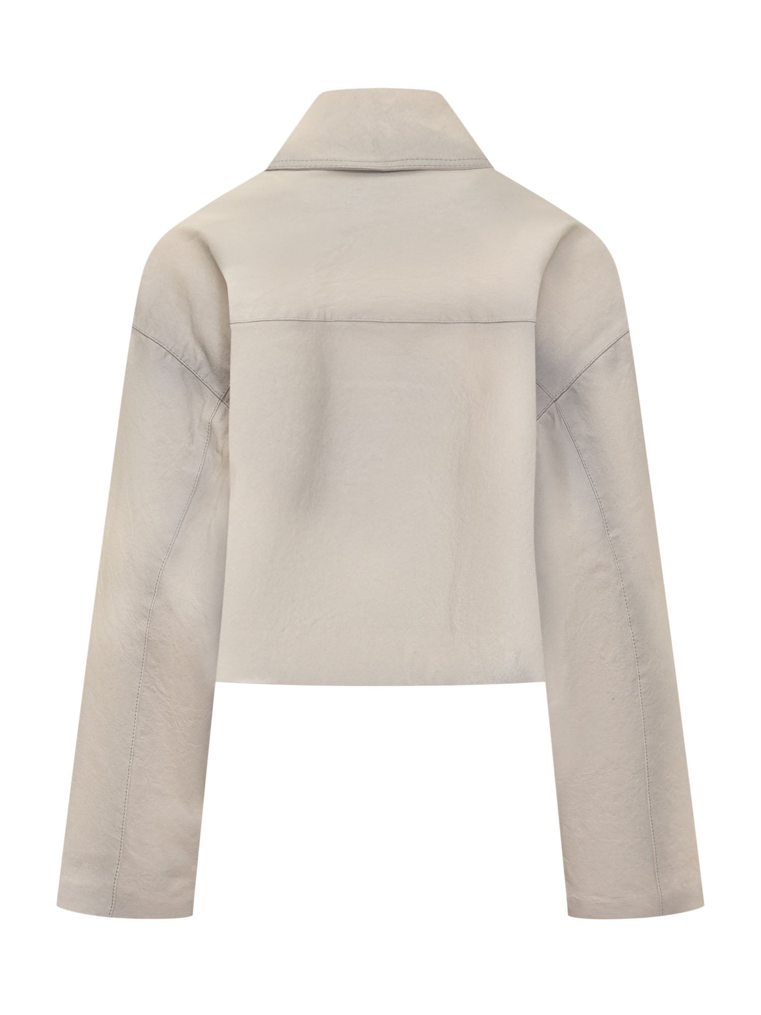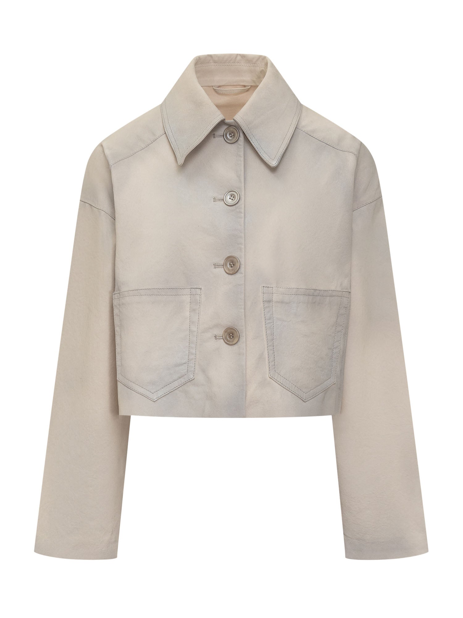 Giacca cropped a maniche lunghe in pelle. Collo classico. Chiusura con bottoni. Due tasche sul davanti.