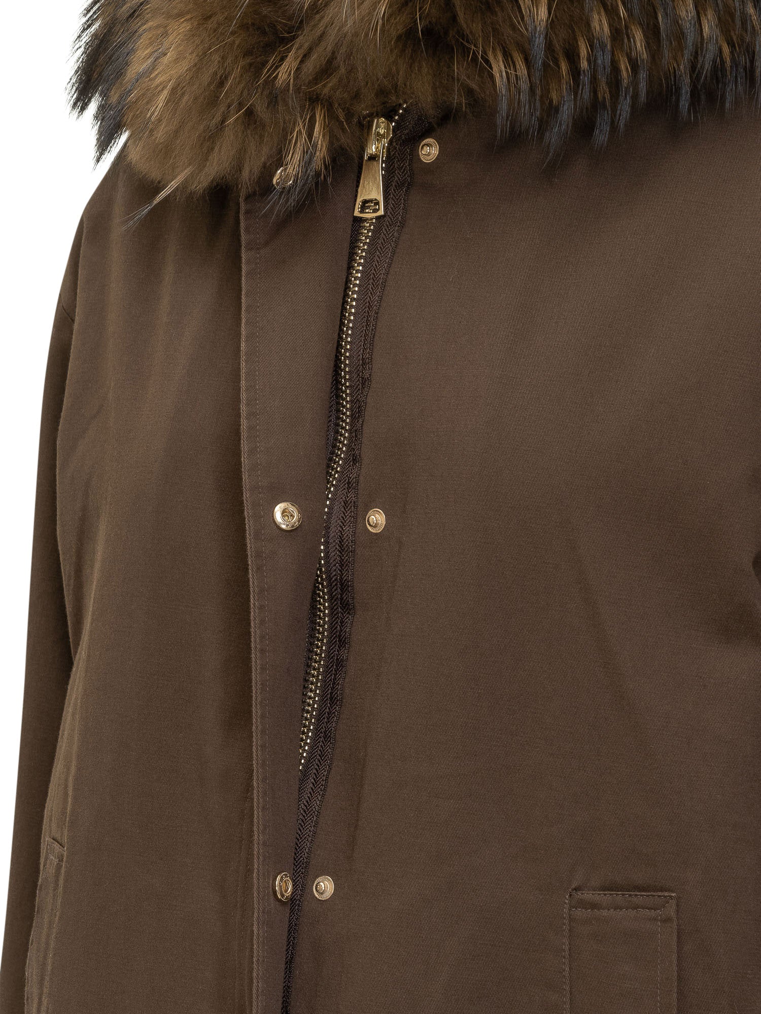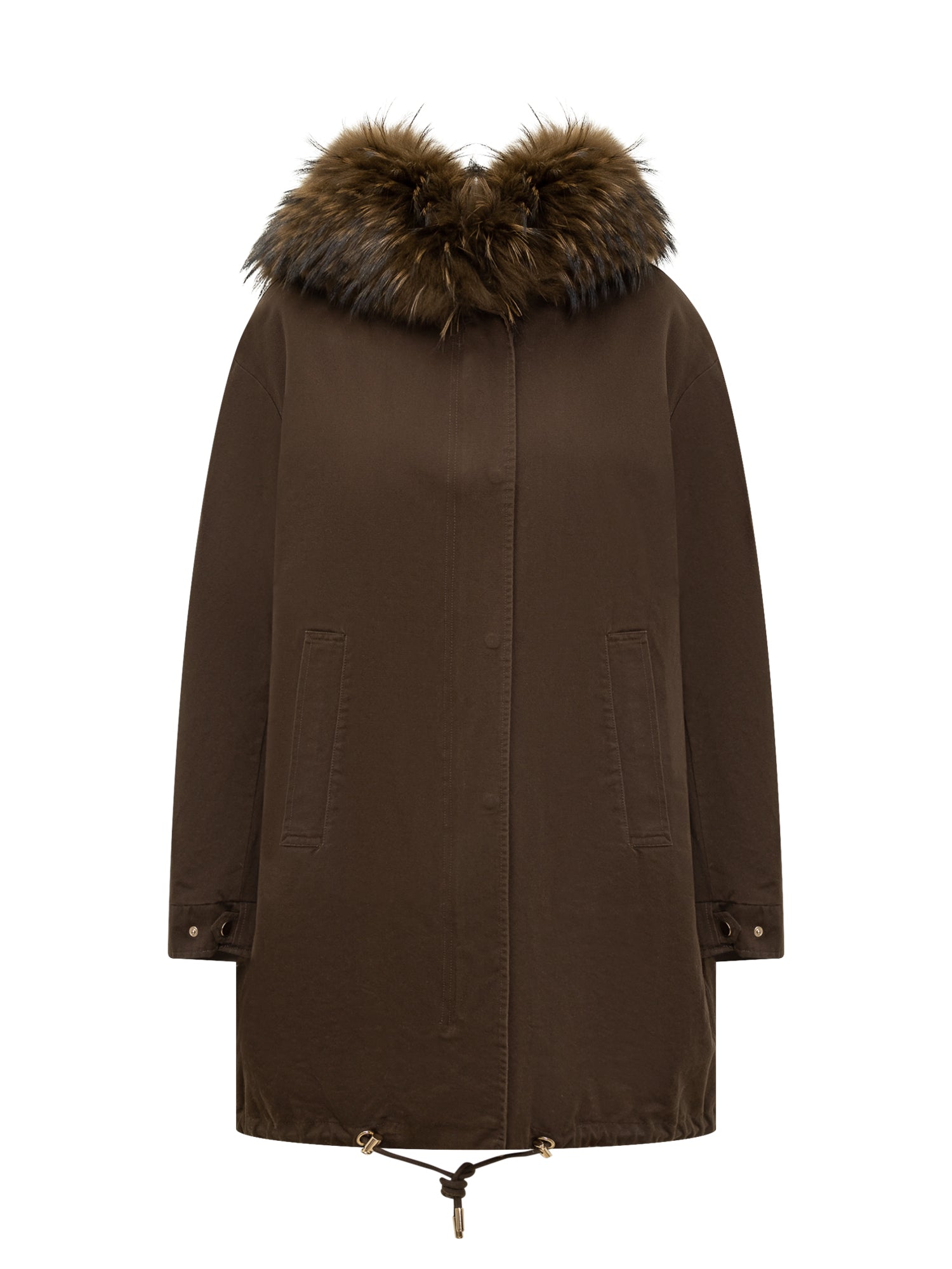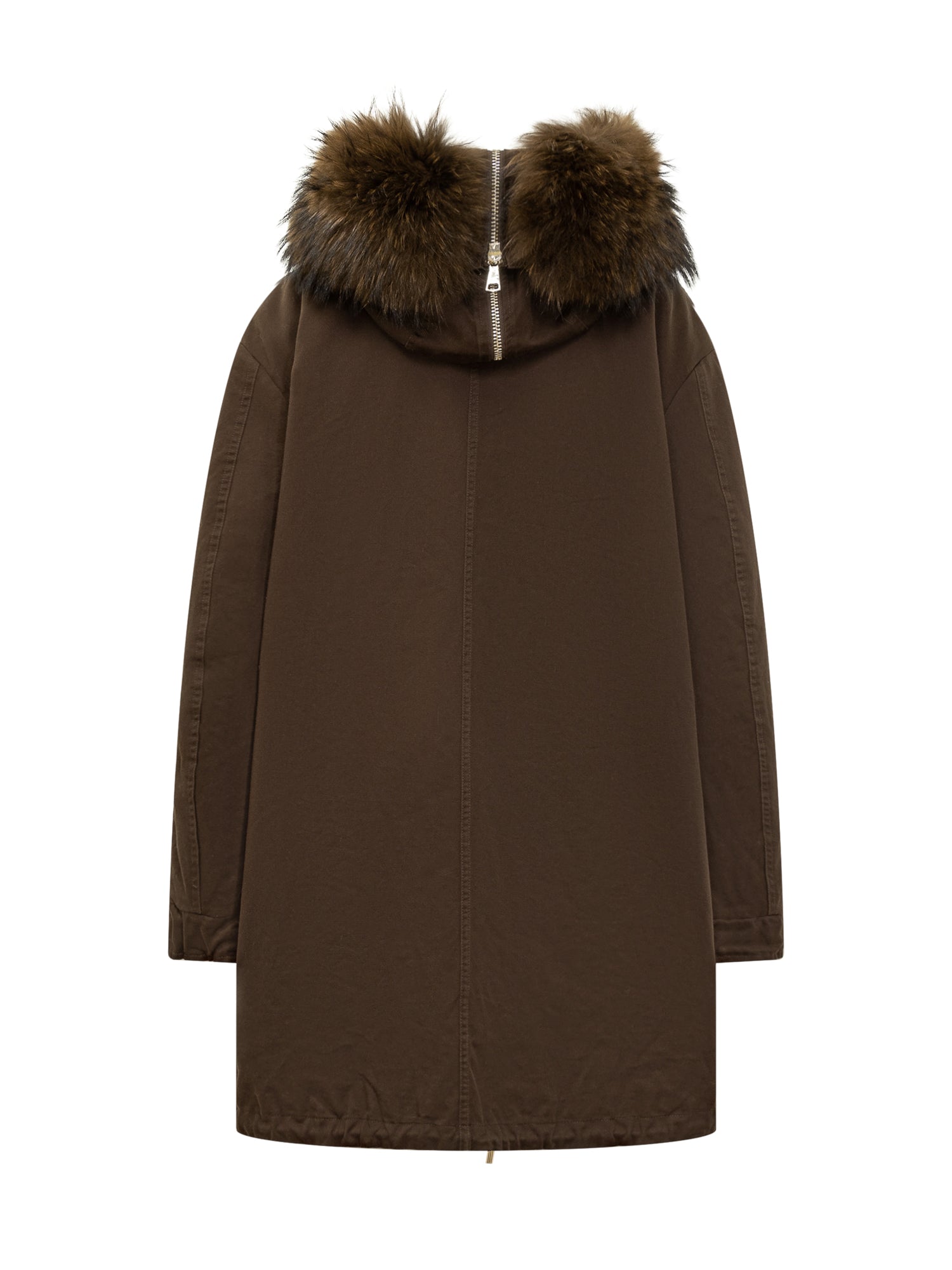 Parka in cotone con cappuccio rifinito in vera pelliccia di volpe. Chiusura con zip e bottoni, coulisse in vita.