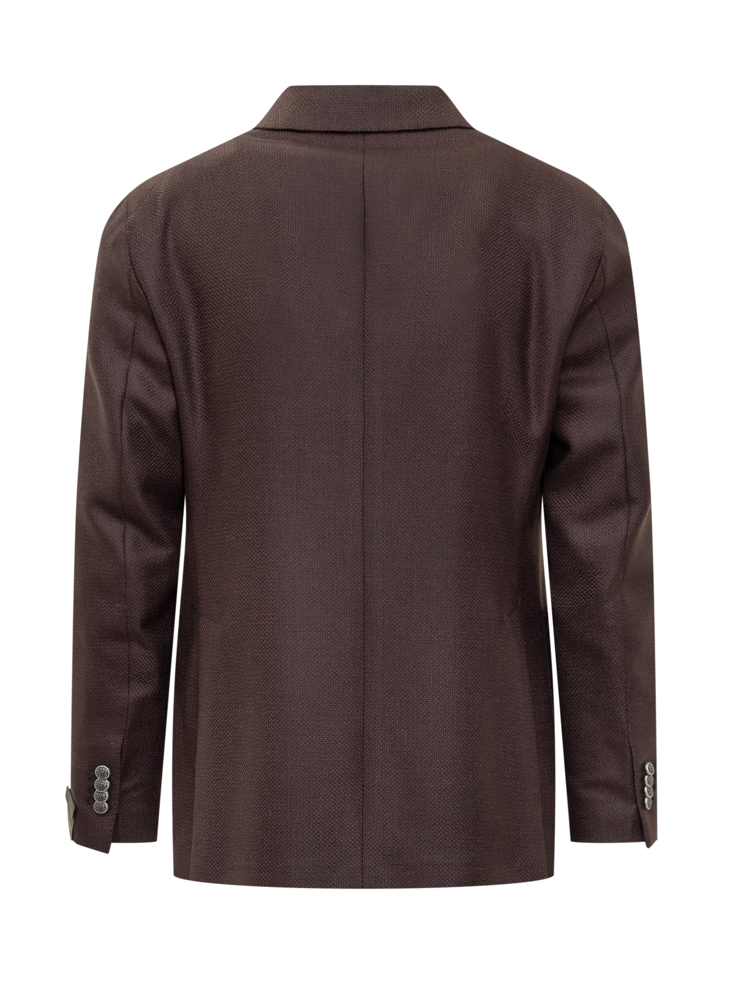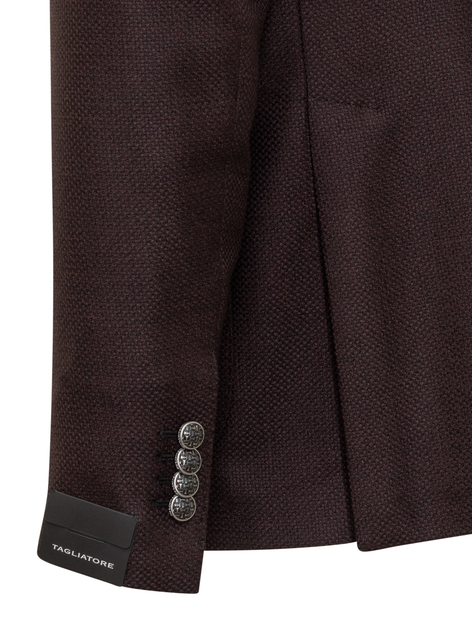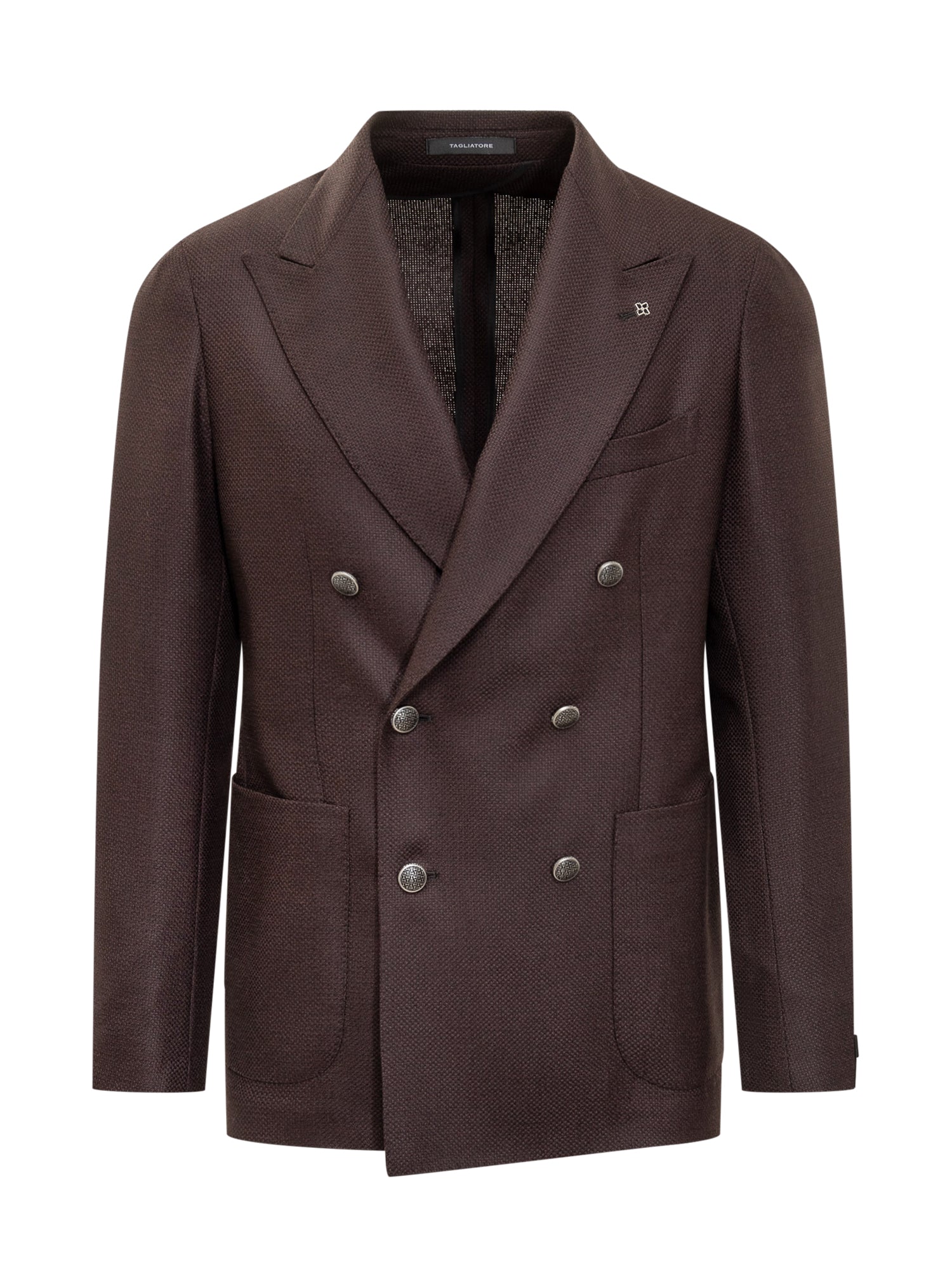 Giacca doppiopetto Tagliatore in pura lana, caratterizzata da un'elegante texture microfantasia e revers a lancia. Chiusura con sei bottoni, tasche applicate e spilla logata sul revers.