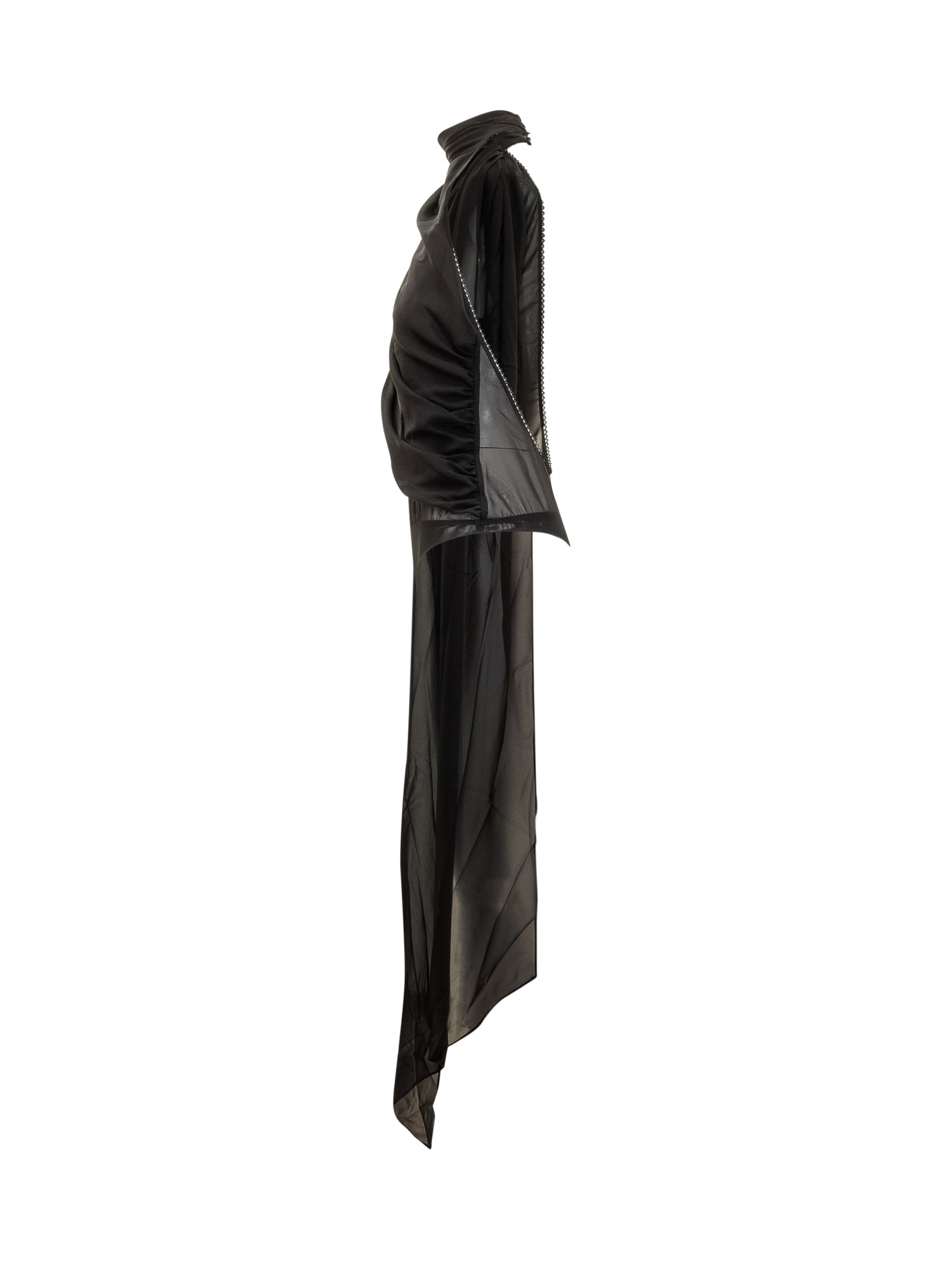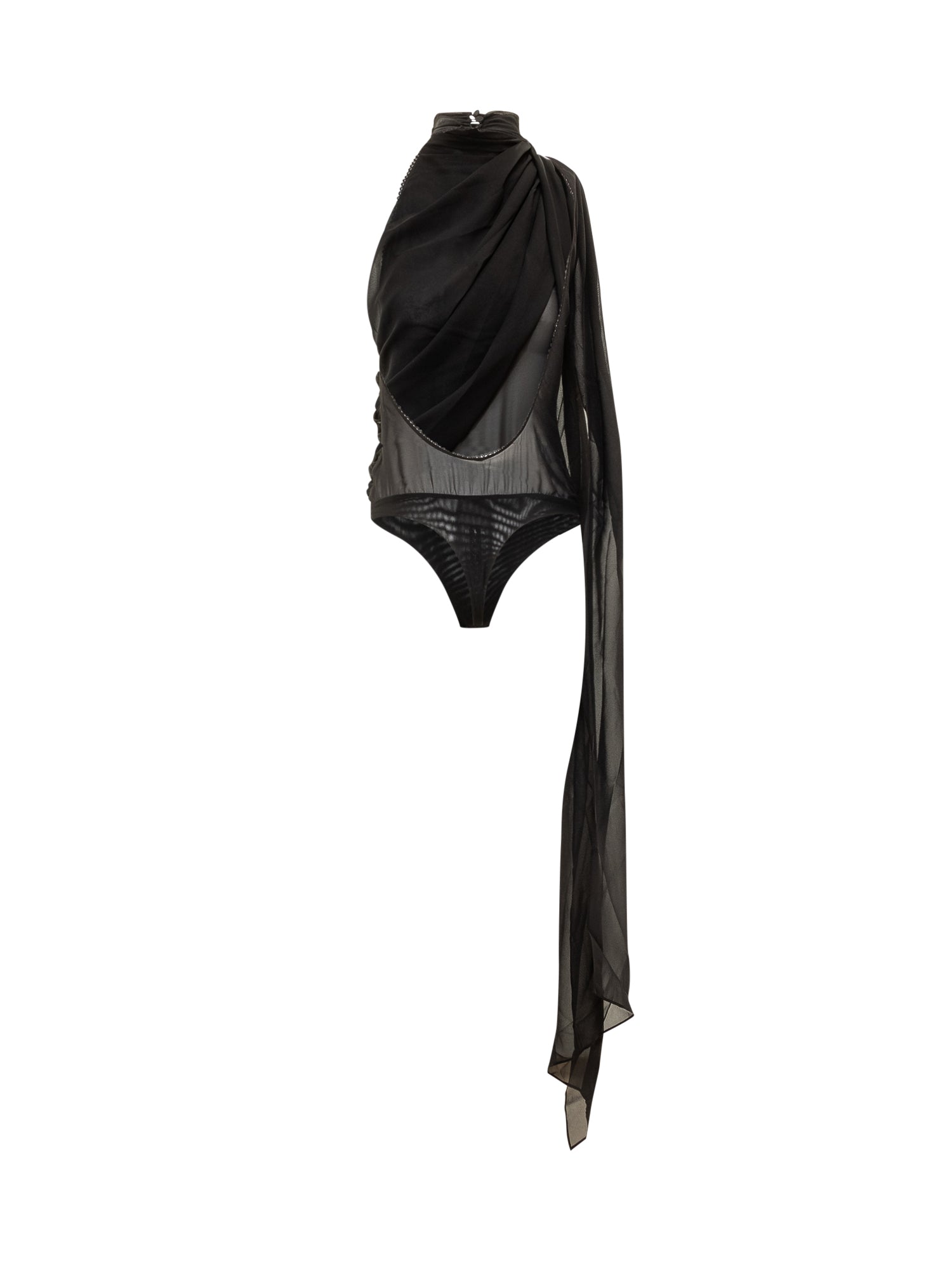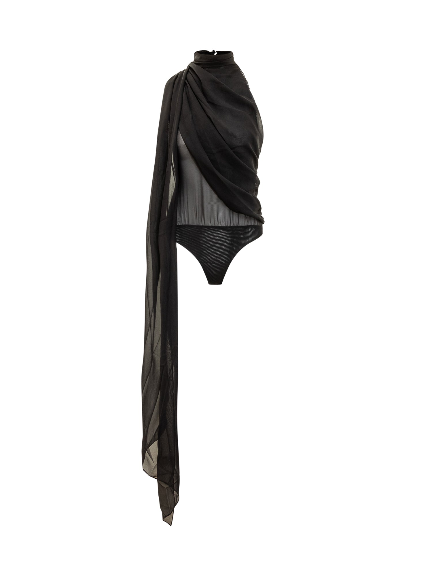 Body Andamane in chiffon nero con scollo alto e drappeggio asimmetrico.