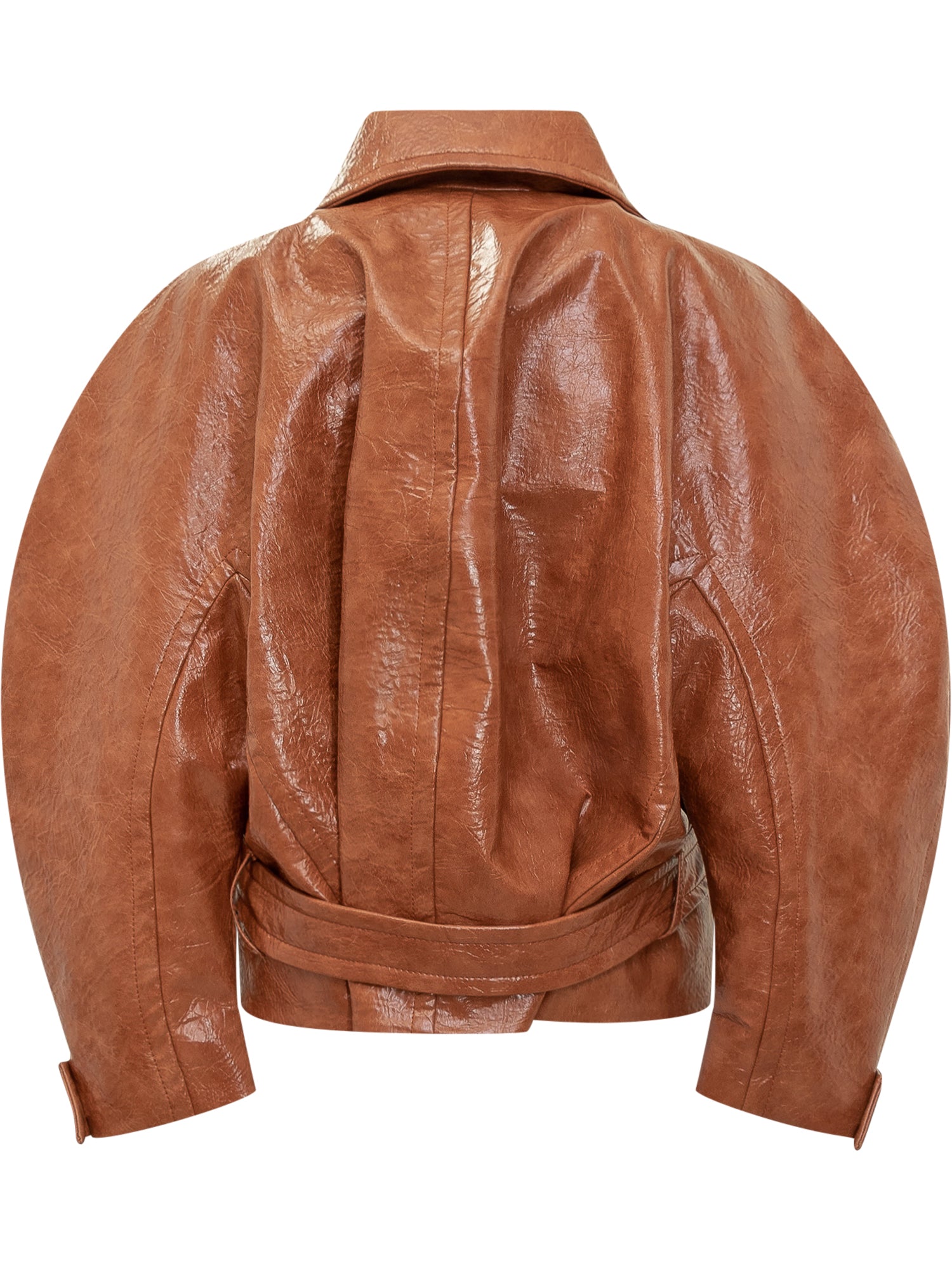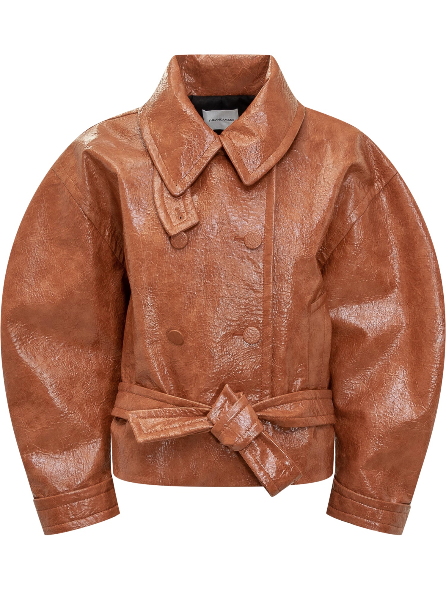 Giacca The Andamane effetto pelle marrone con finitura lucida. Modello doppiopetto con cintura coordinata e maniche oversize.