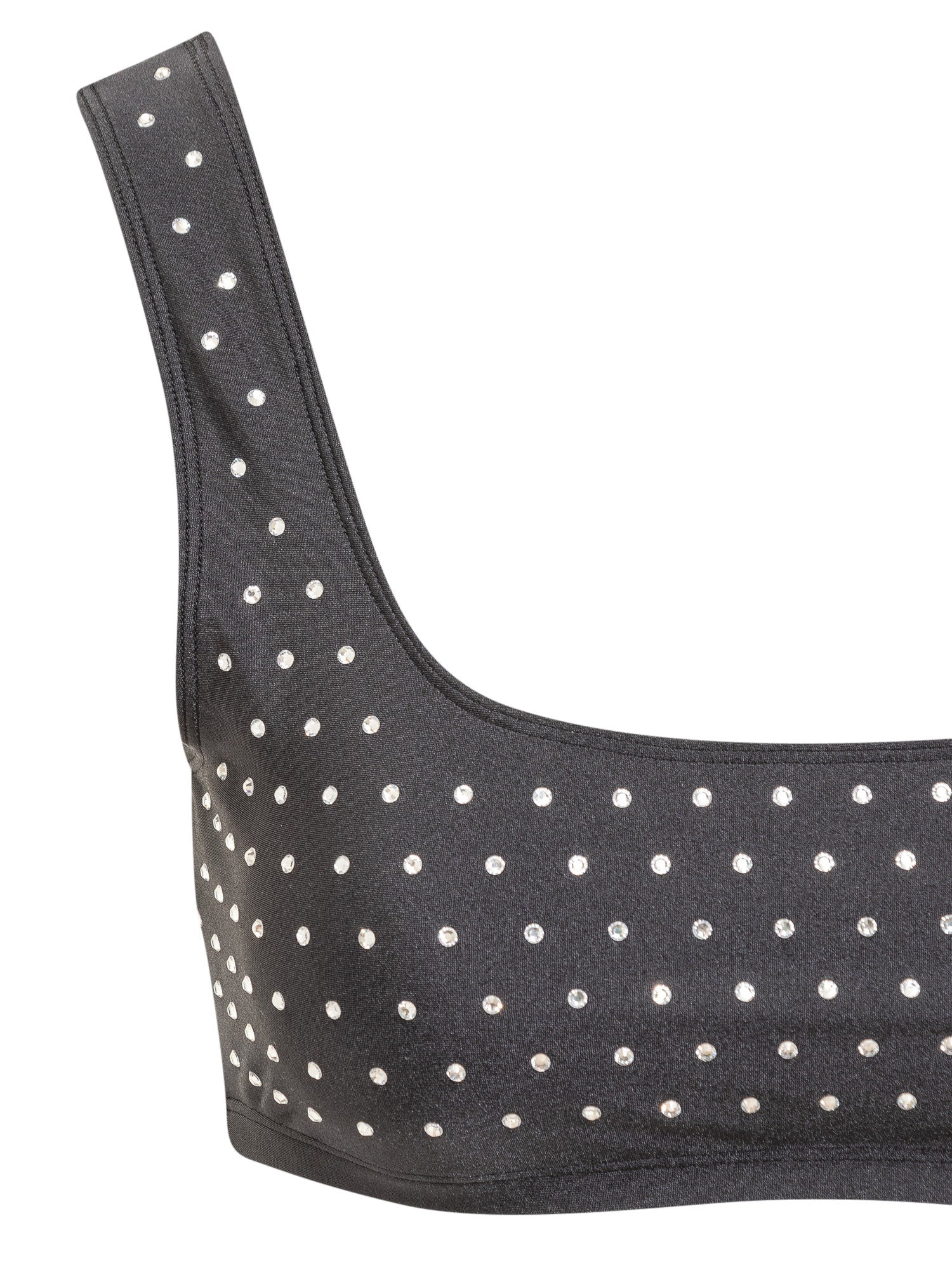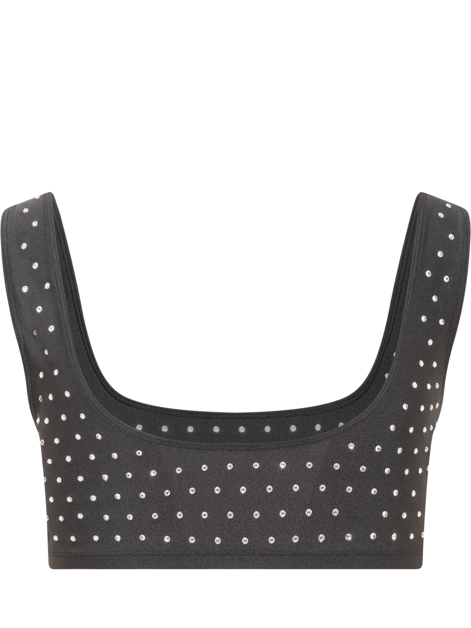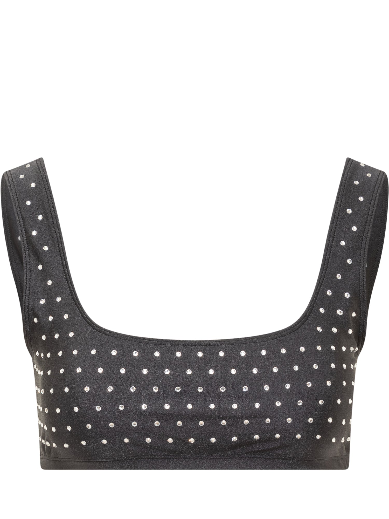 Top elasticizzato. Scollo a U sul davanti e sul retro. Strass applicati all-over.
