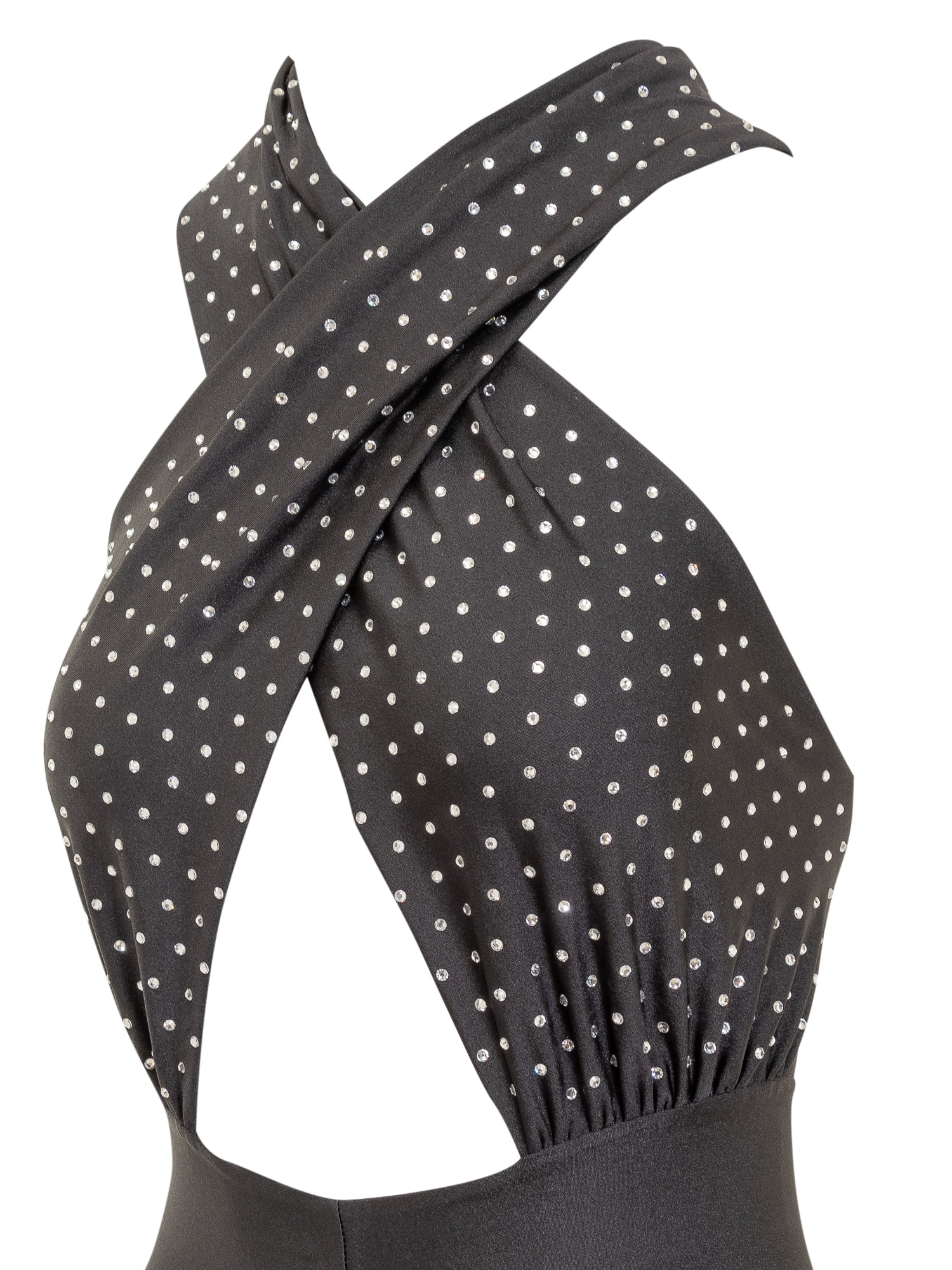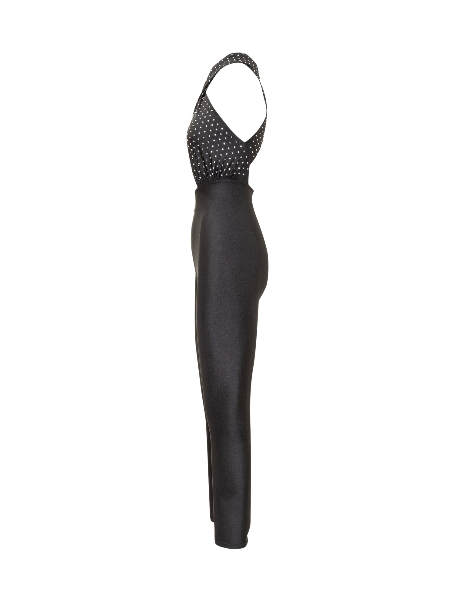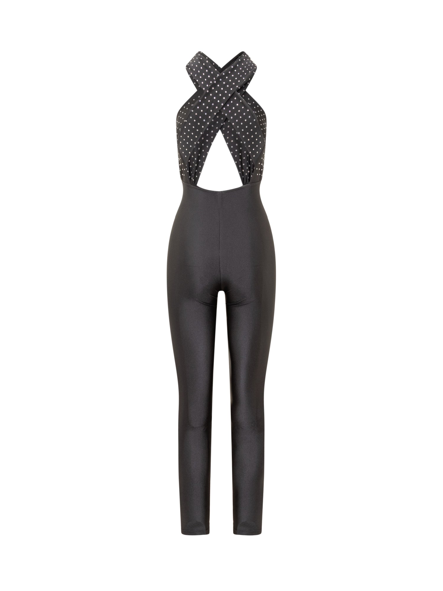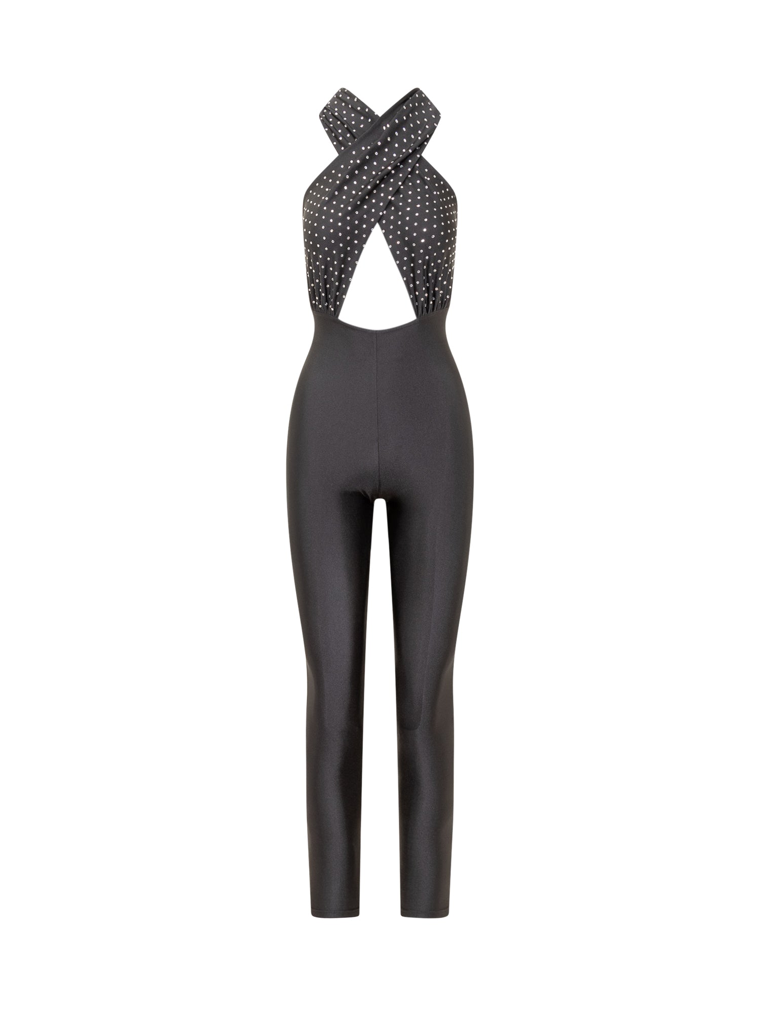 Tuta elasticizzata. Pantalone lungo. Intrecciata su fronte e retro. Cristalli sulla parte superiore.
