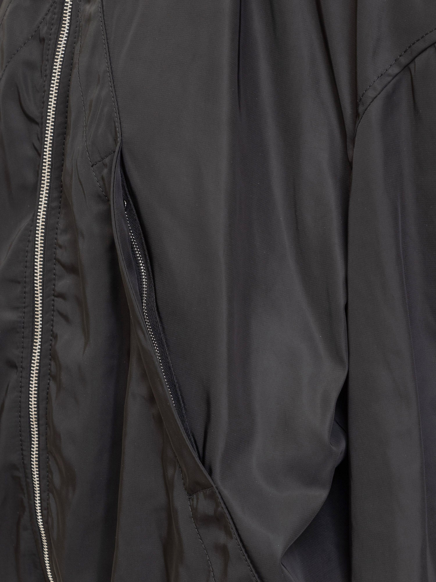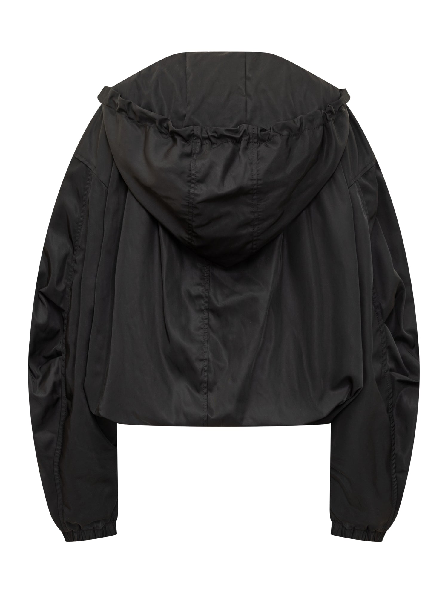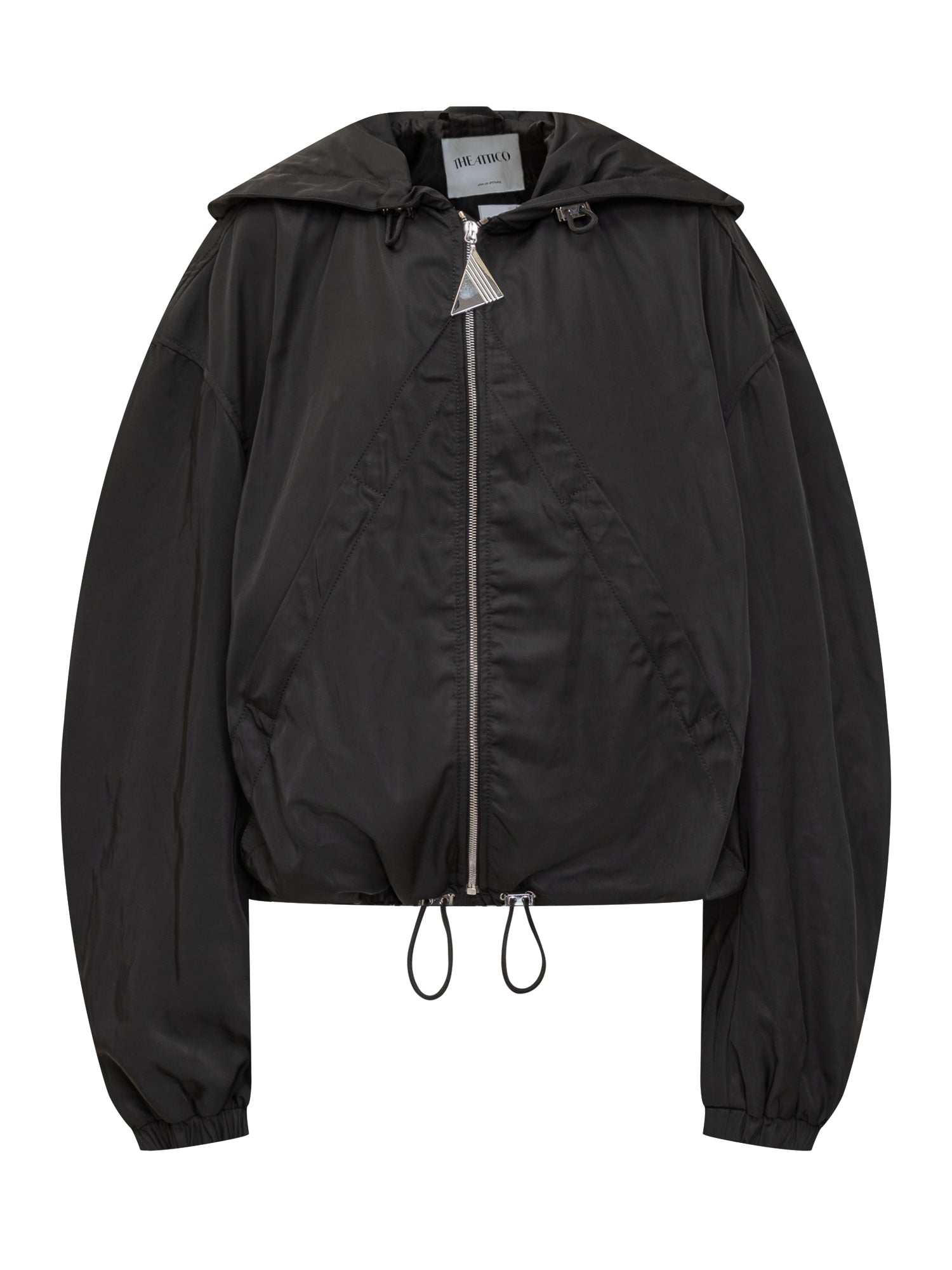 Bomber nero con cappuccio. Spalle scese. Chiusura con zip. Tasche con zip. Coulisse sul fondo.