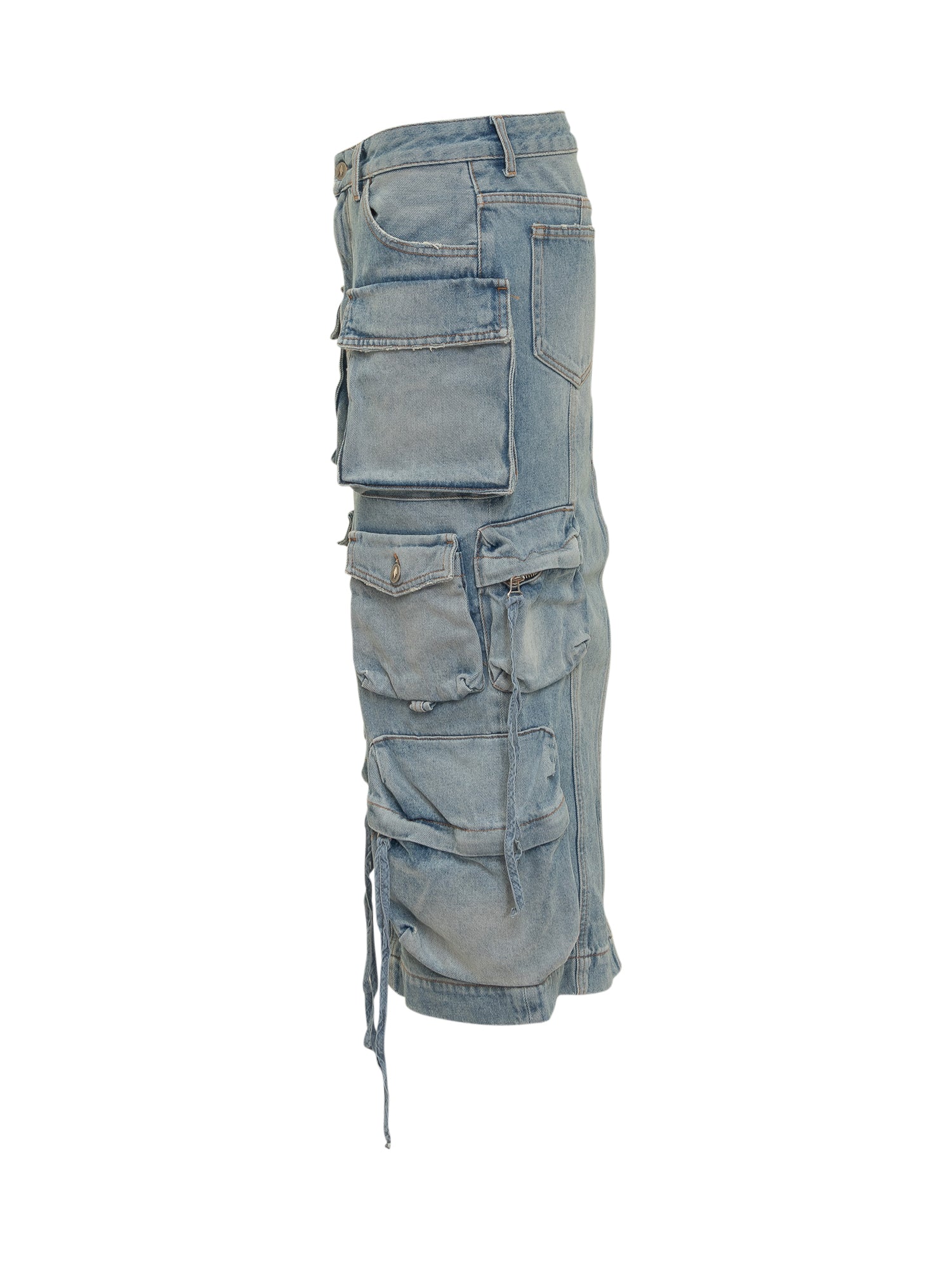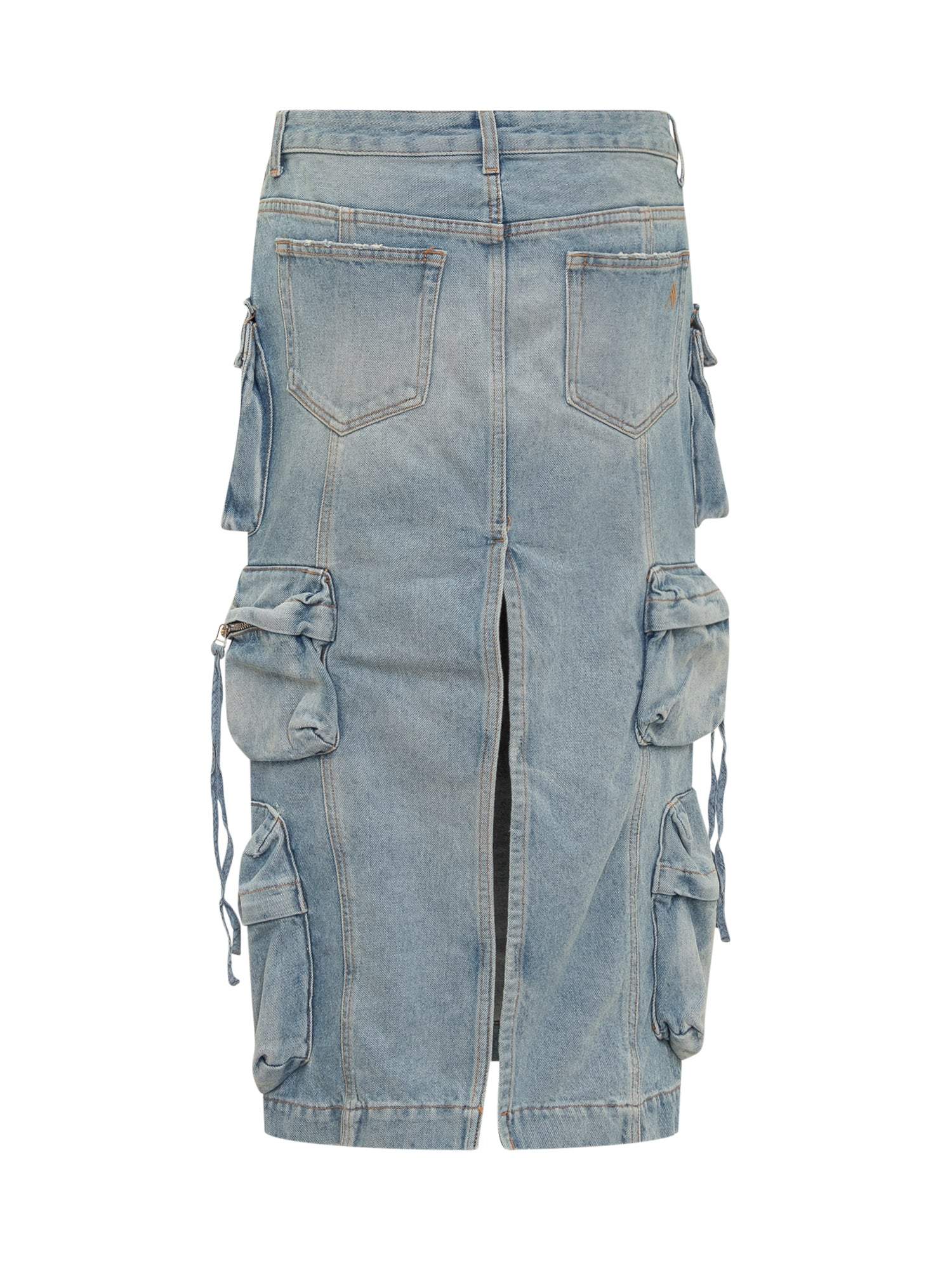 Gonna midi multitasche. Quinto taschino a pieghe e ricamo logo. Chiusura con bottone e zip. Colore blu.