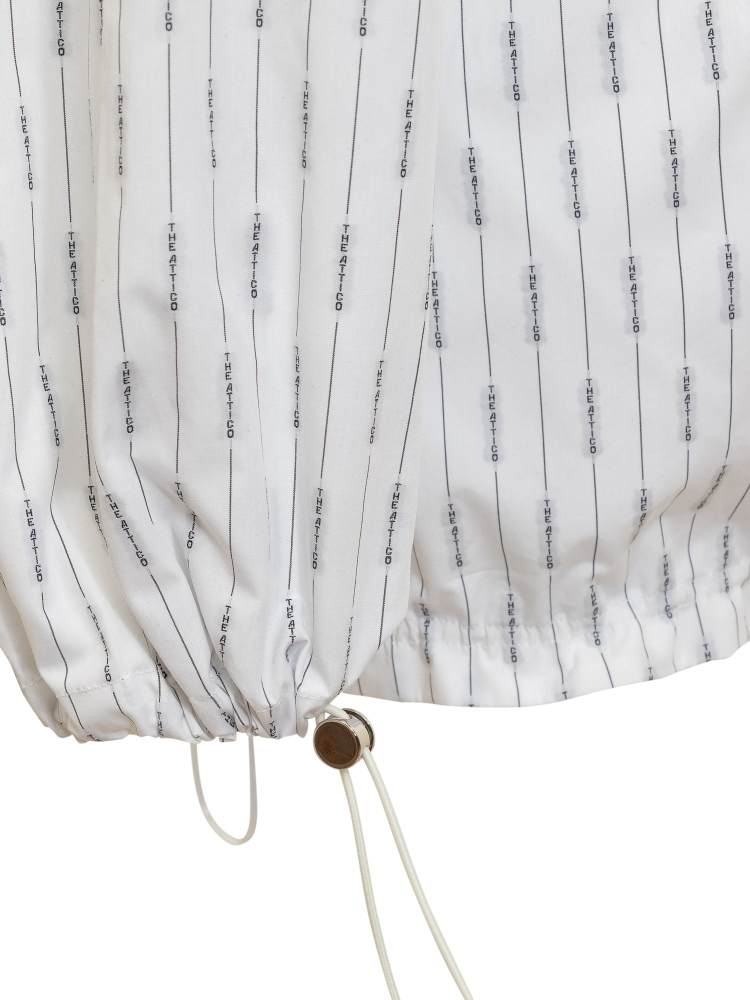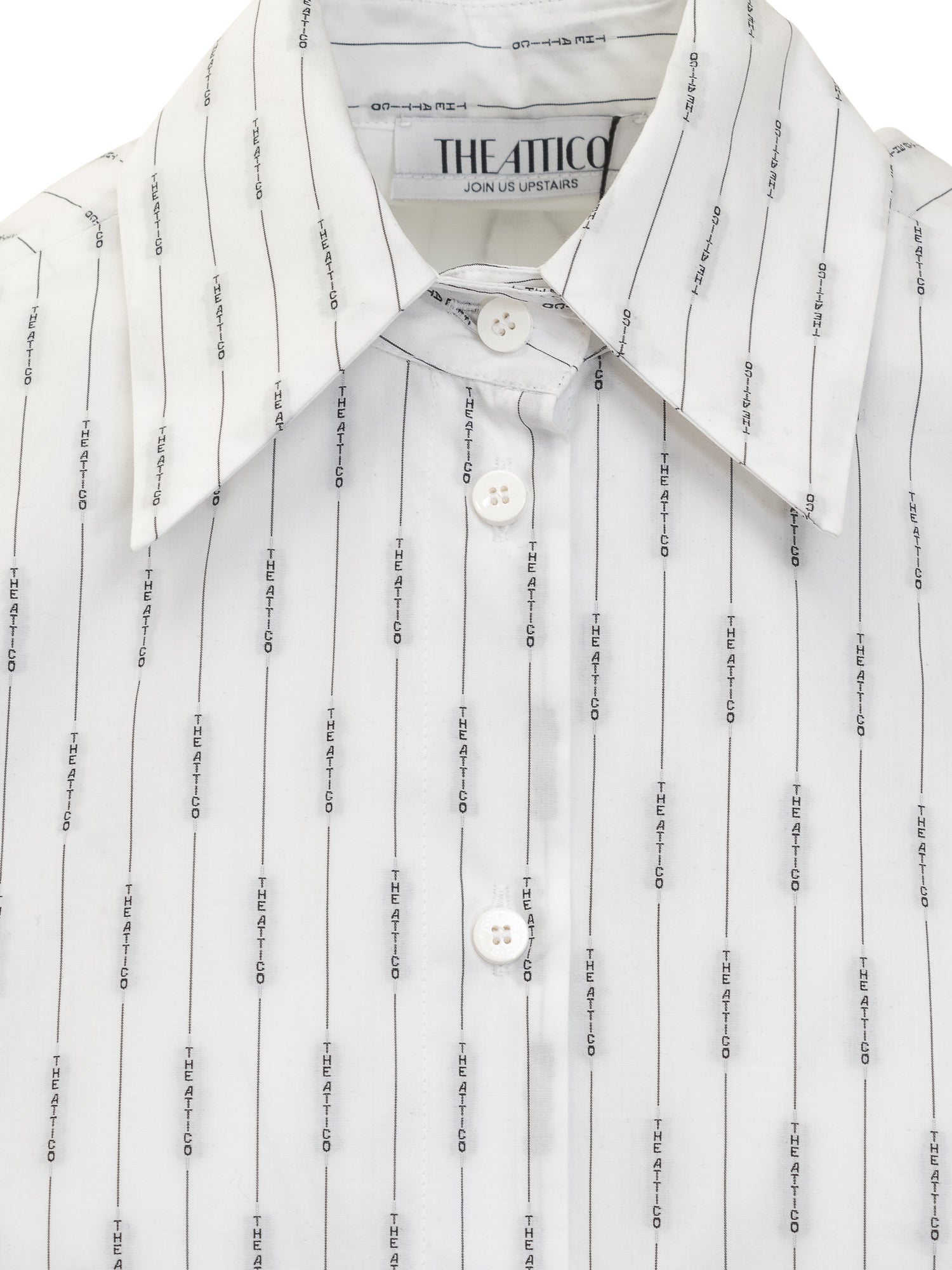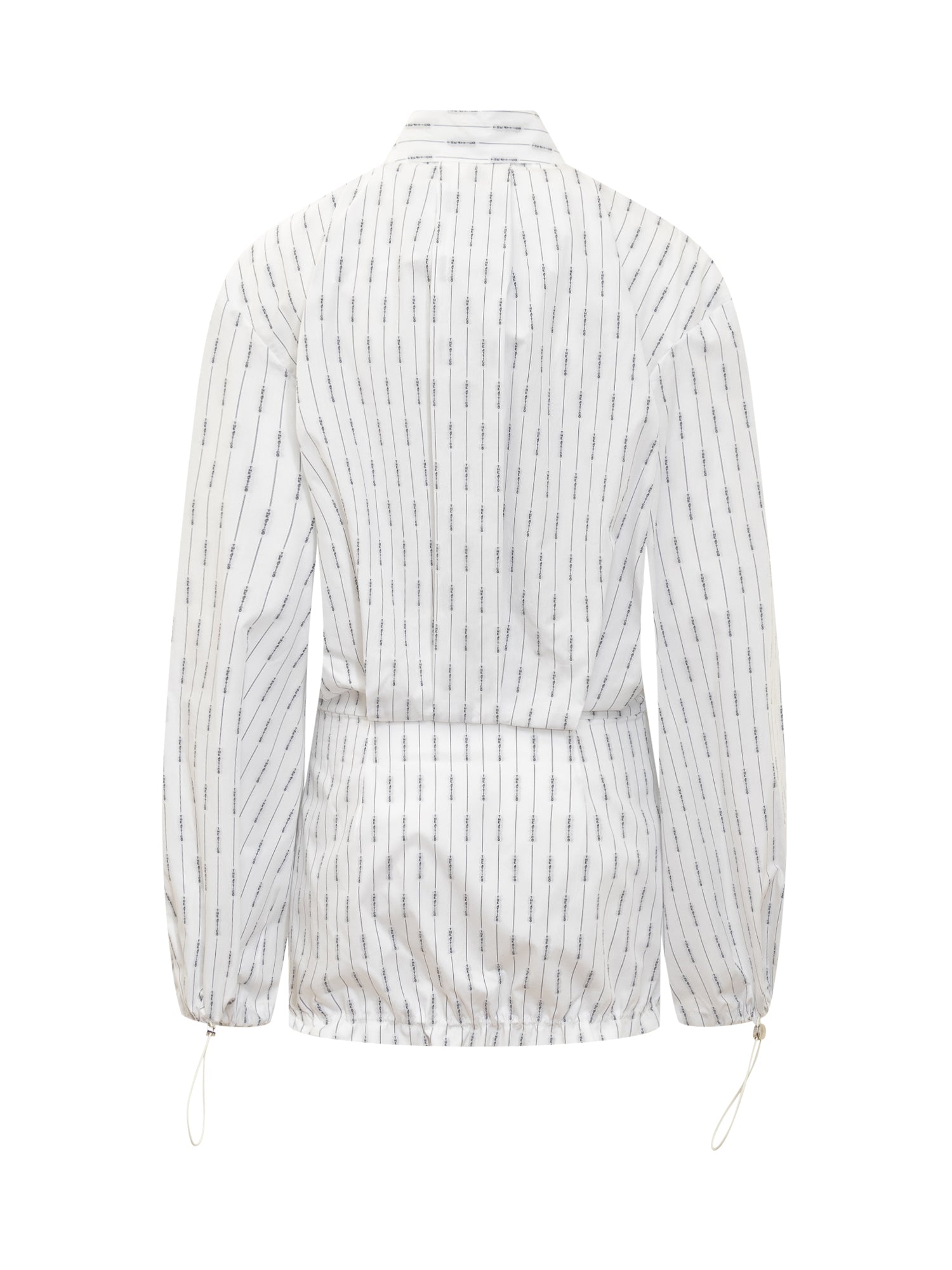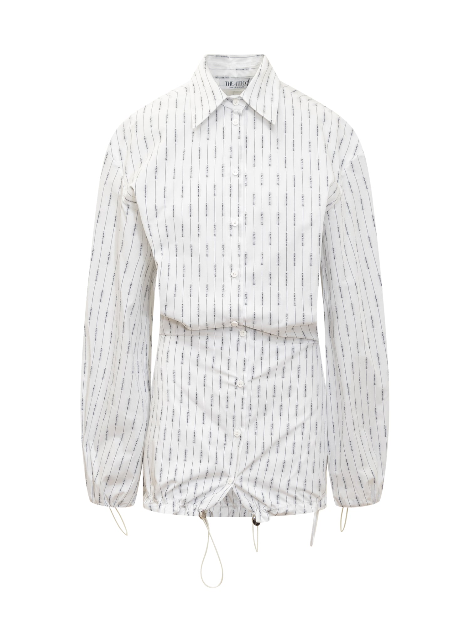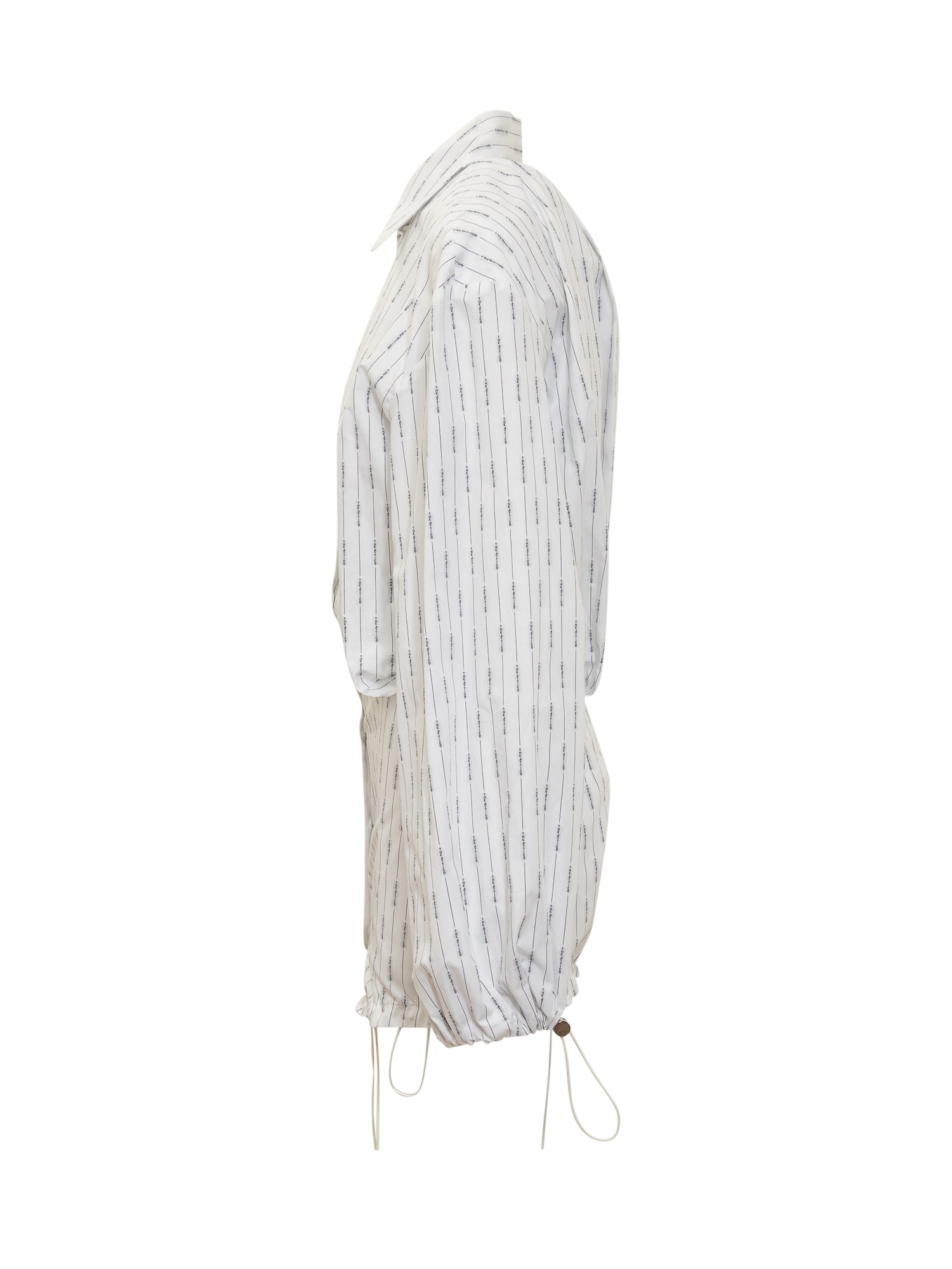 Mini abito camicia bianco e nero. Baschina aderente. Logo a righe. Dettaglio coulisse e fermacorda logo in metallo.