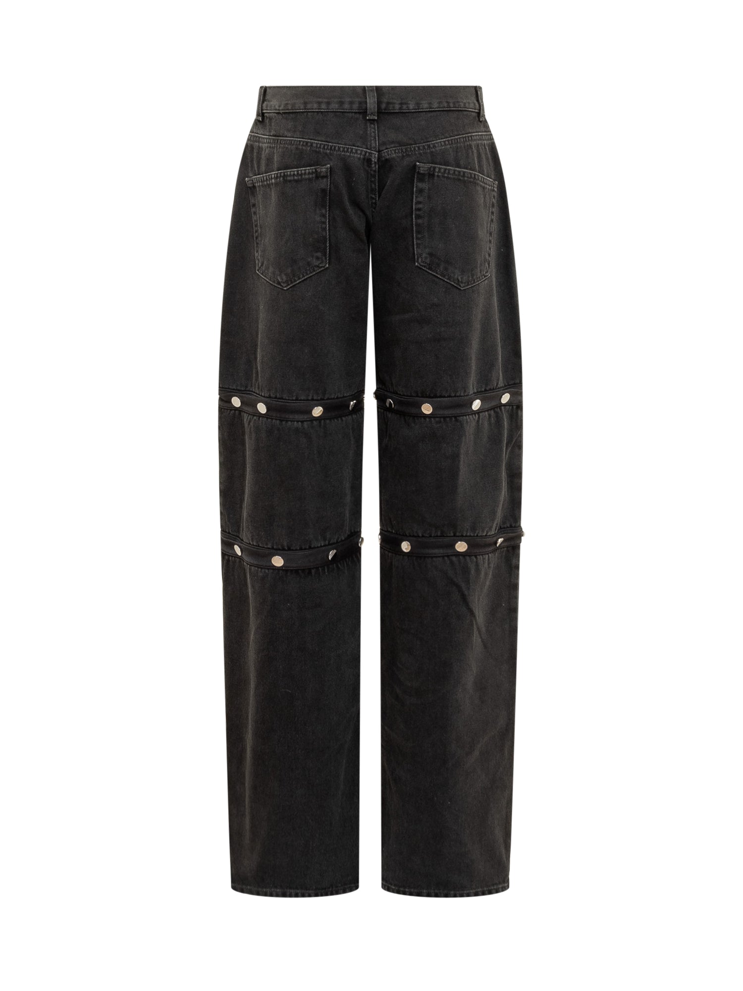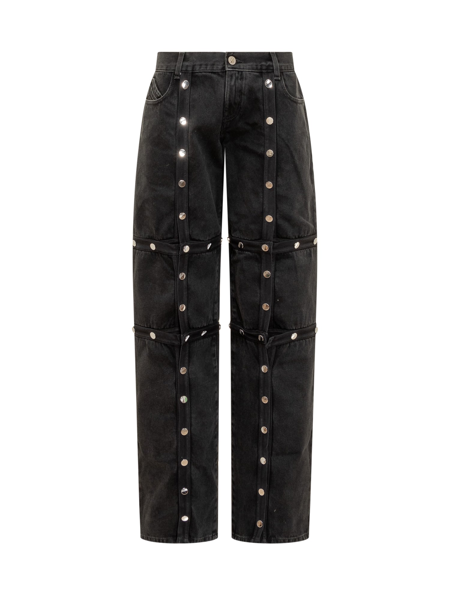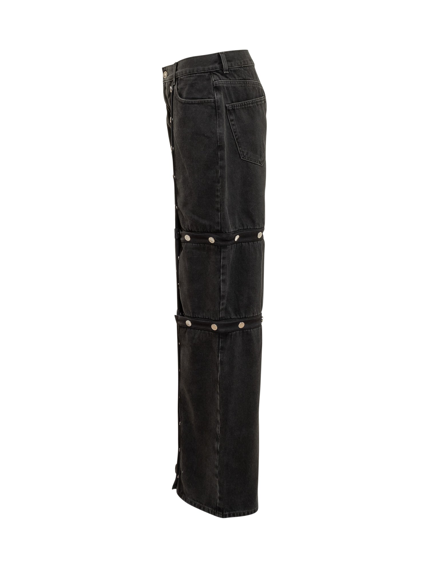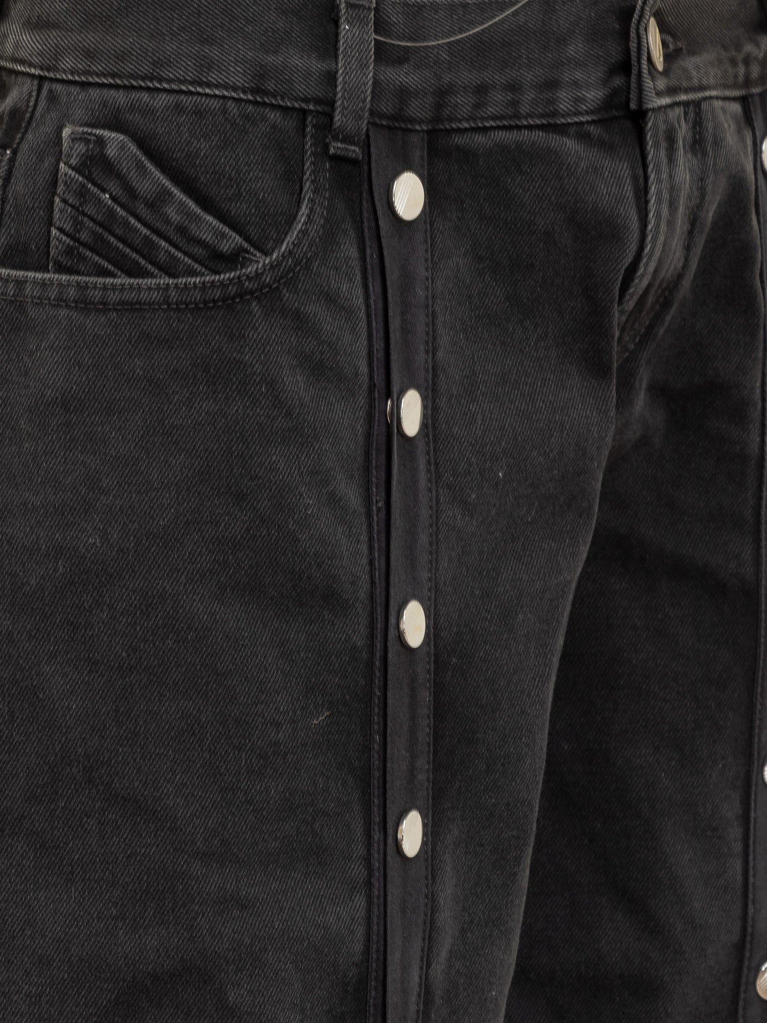 Pantalone lungo in jeans nero. Cinque tasche. Quinto taschino a pieghe e ricamo logo. Chiusura con bottone e zip. Passamaneria con bottoni logo snap. Passanti per cintura.
