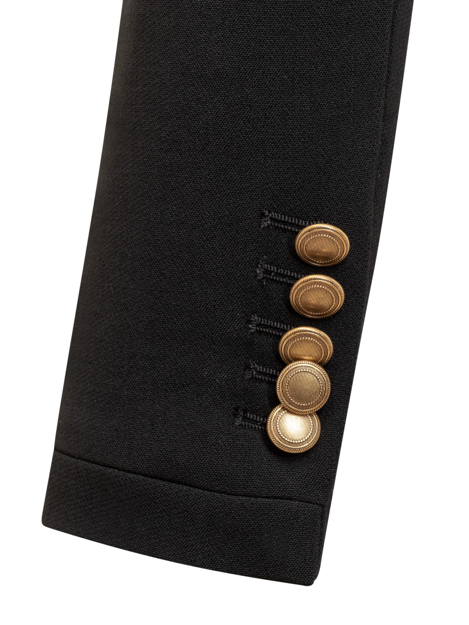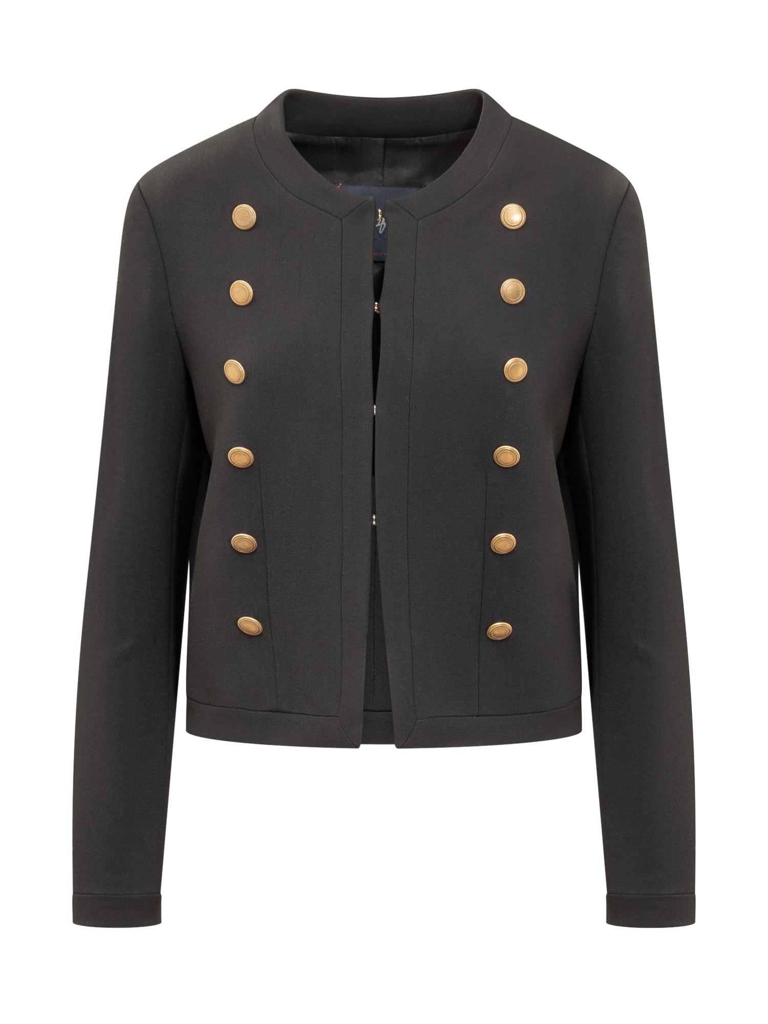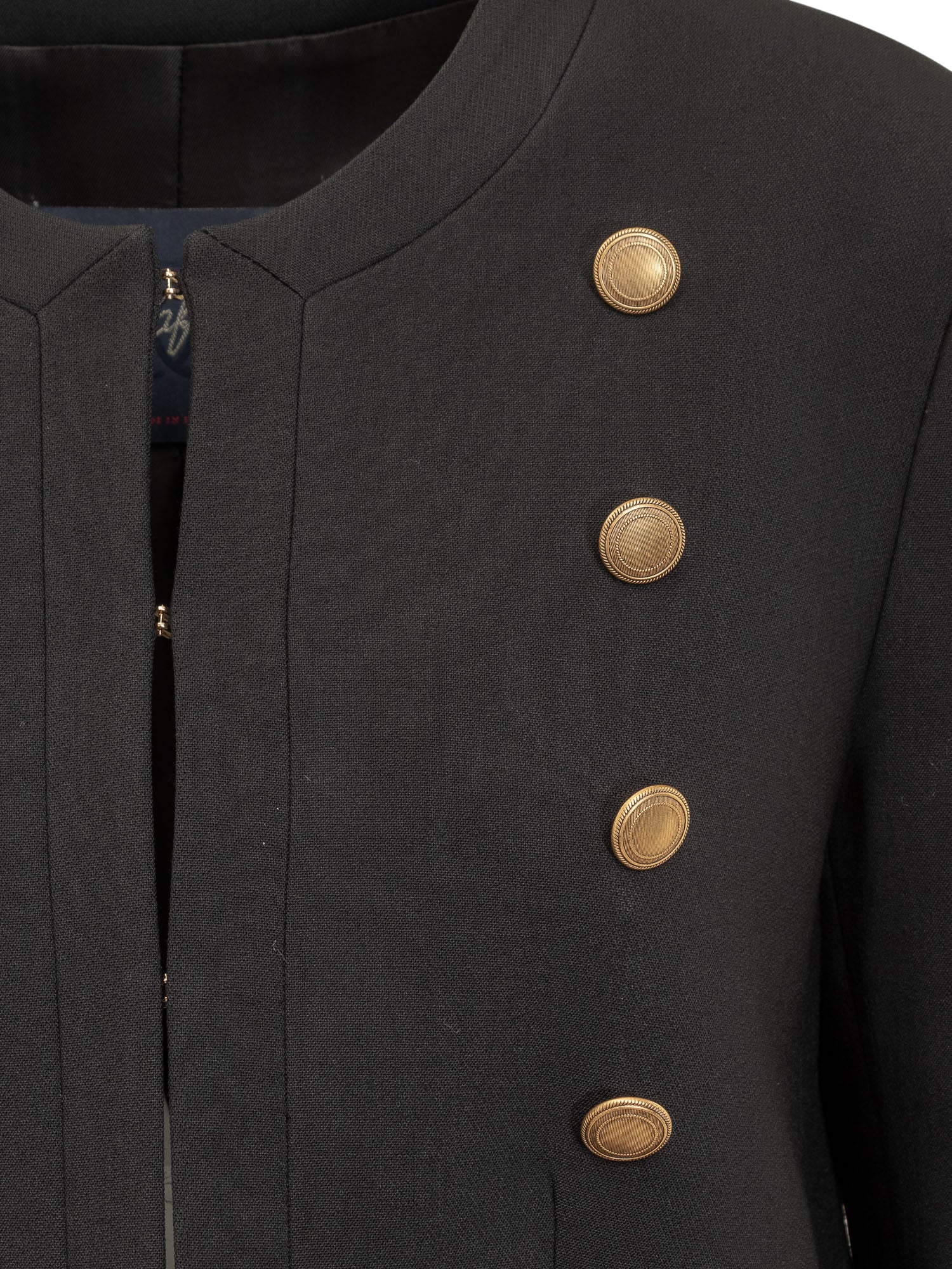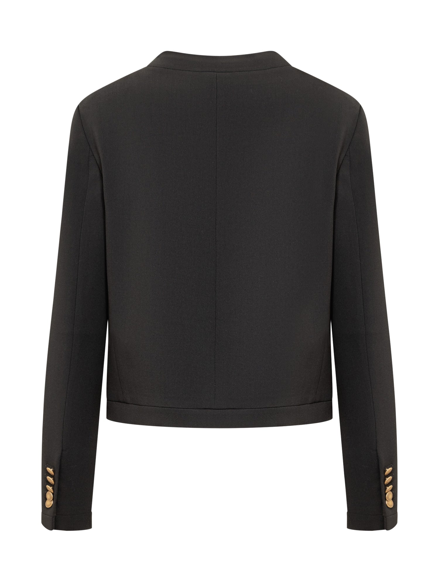 Giacca nera a girocollo. Chiusura frontale con gancini. Polsini con bottoni.