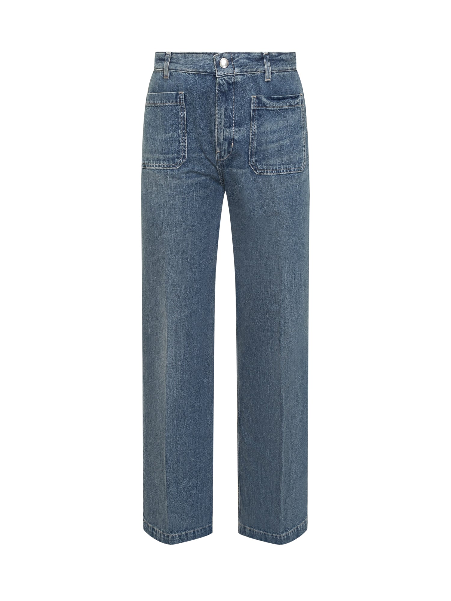 Jeans lunghi wide leg. Chiusura con zip e bottone. Passanti per cintura. Quattro tasche. Logo ricamato sul retro.