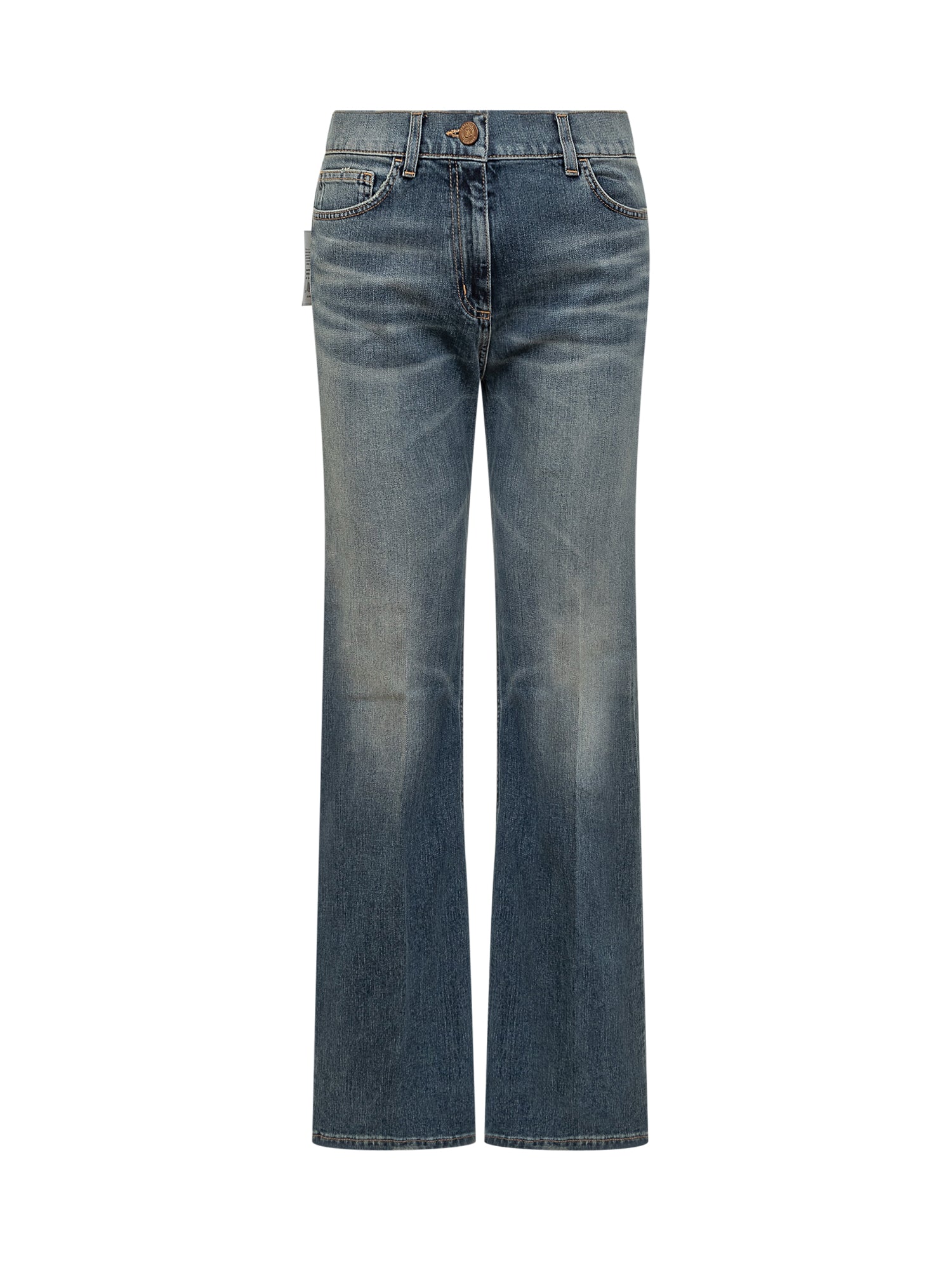 Jeans lungo svasato. Chiusura con bottone e zip. Passanti per cintura. Cinque tasche.