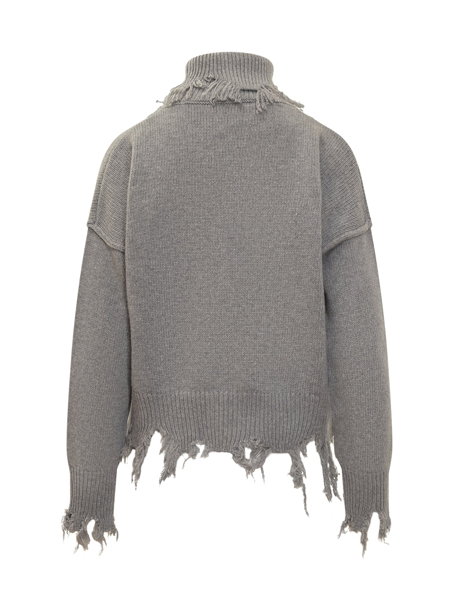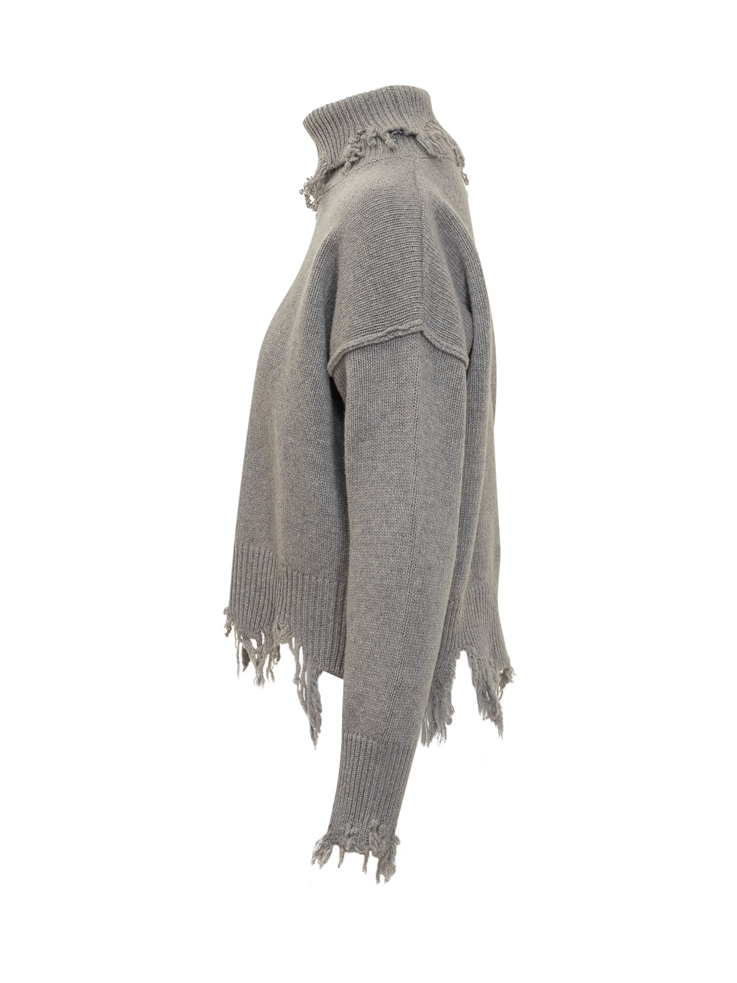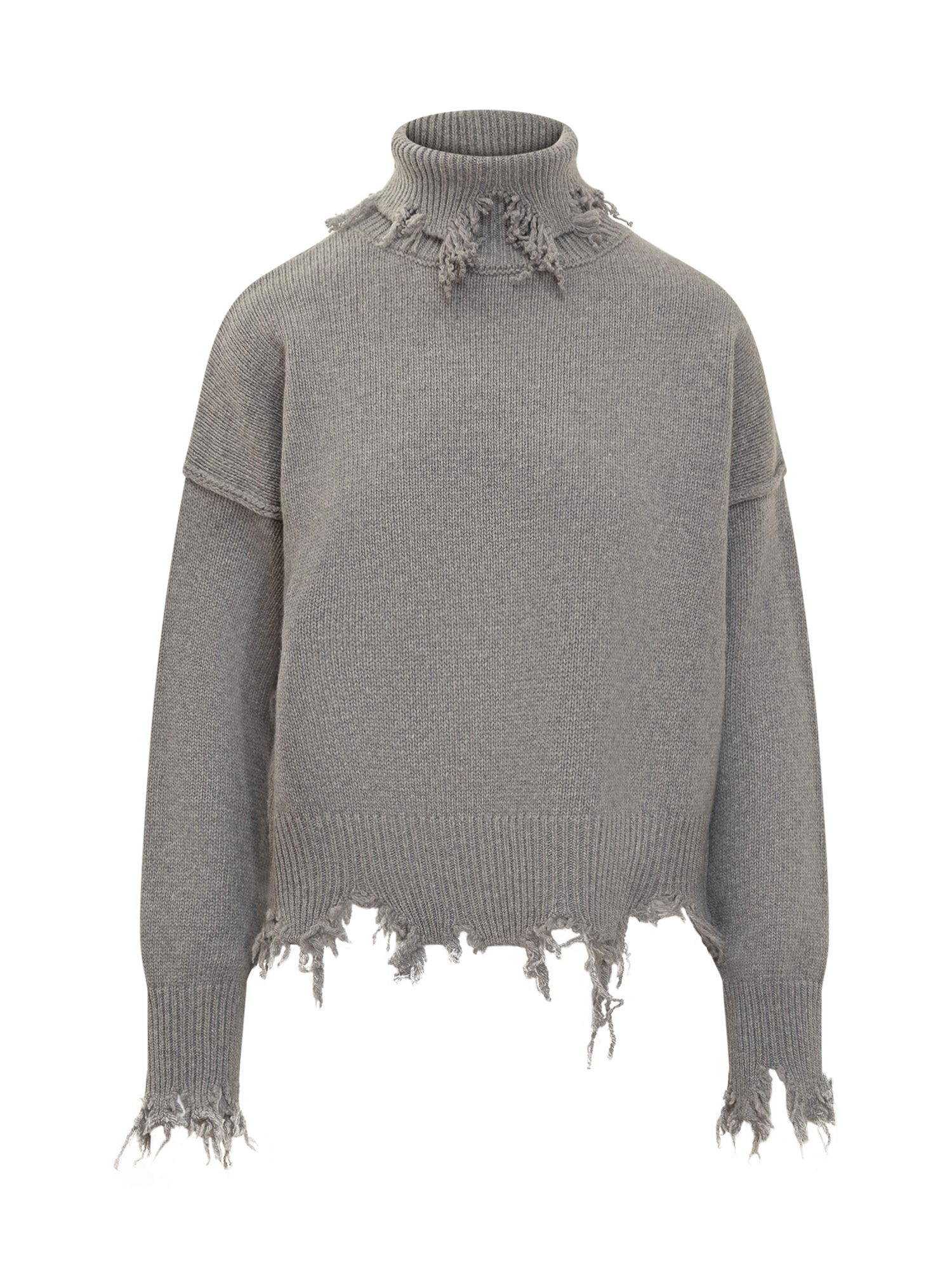 Maglione in misto lana grigio con collo alto e dettagli sfrangiati su orlo e polsini.