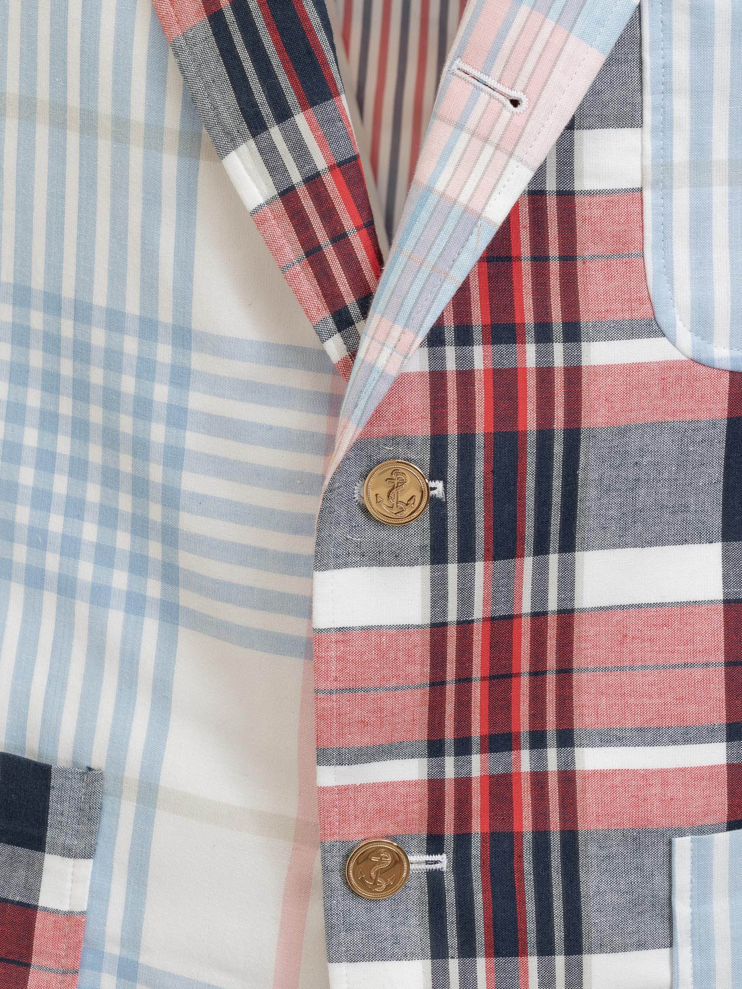 Giacca blazer monopetto. Chiusura con bottoni. Tacsche sul davanti. Fodrera a righe all'interno con tasche a filetto. Bandiera firma tricolor grosgrain al colletto posteriore.