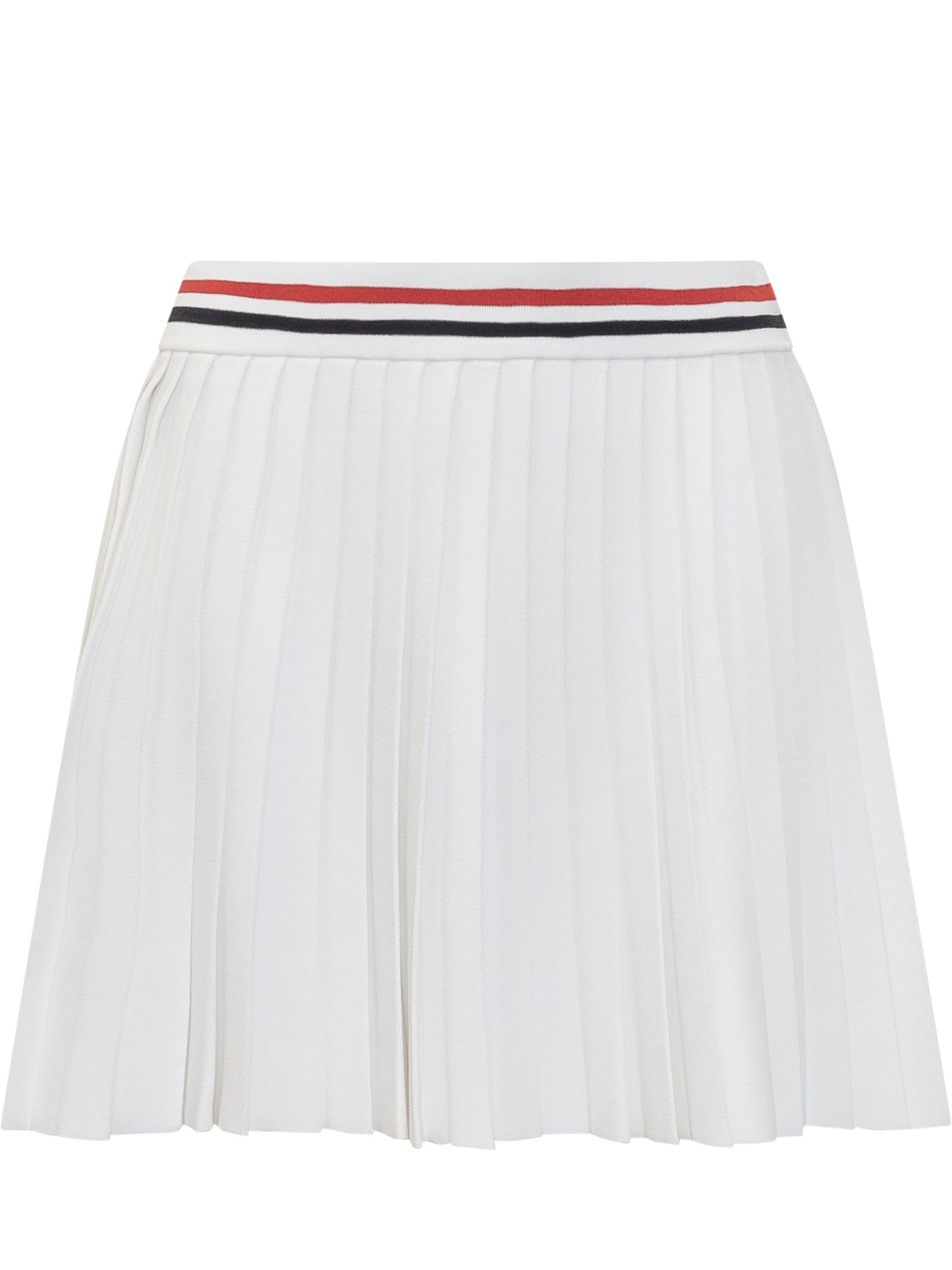 Gonna mini plissettata in misto viscosa. Vita elasticizzata. Linguetta in gros-grain con righe RWB sul retro.