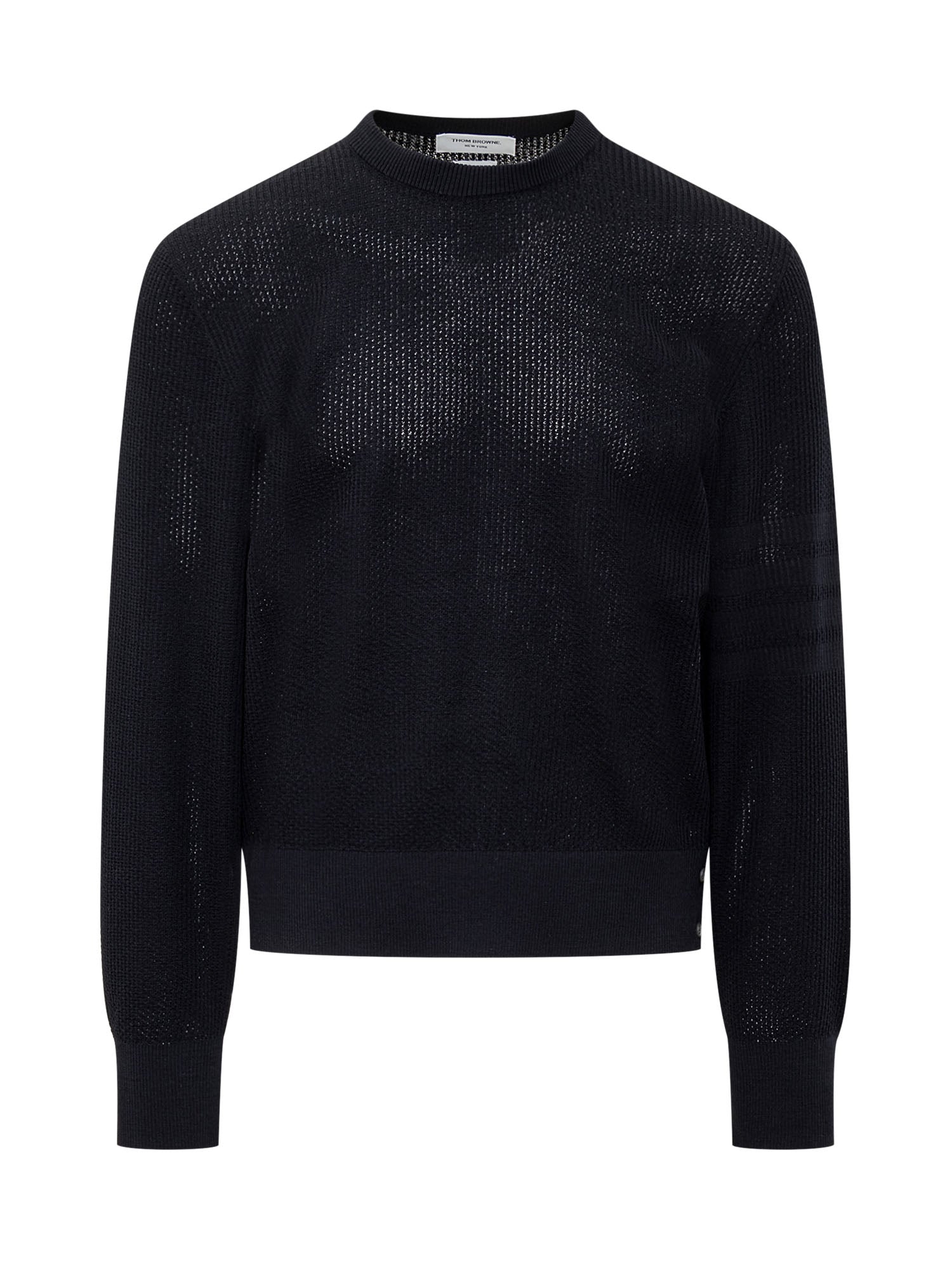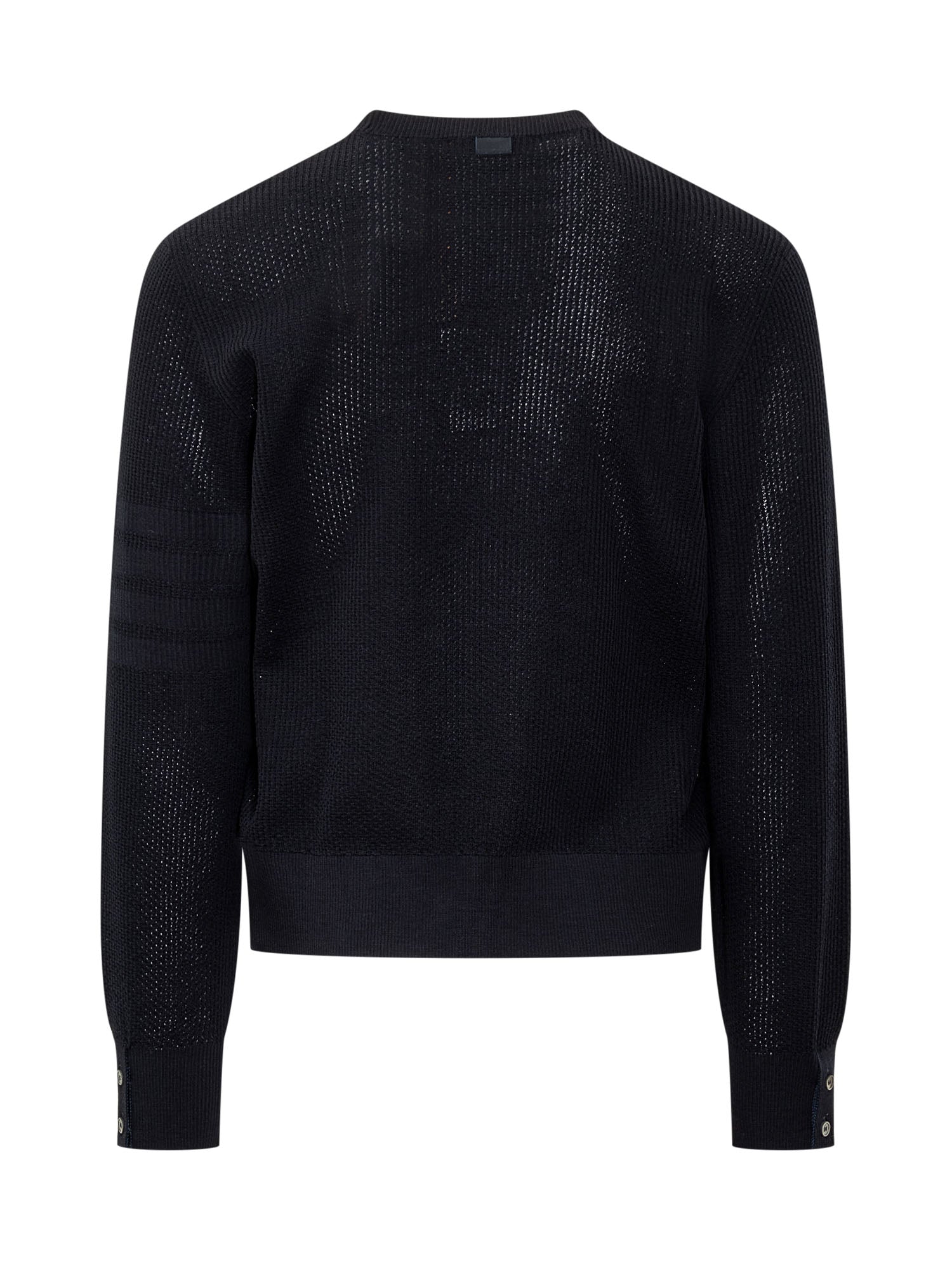 Maglia a maniche lunghe in lana vergine. Lavorazione in maglia con trasparenze. Girocollo. Orli a costine. Polsi con bottoni. Spacchetti laterali con bottoni. Motivo 4Bar sulla manica.