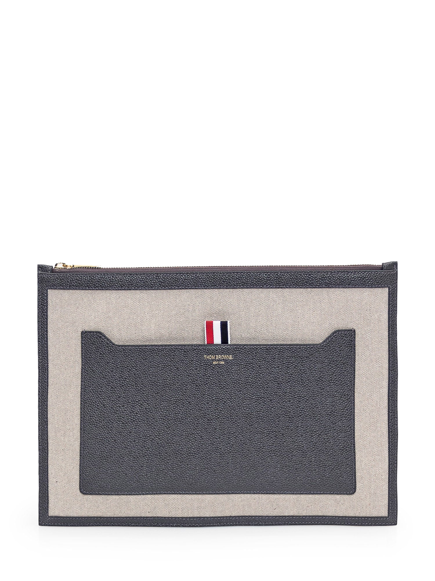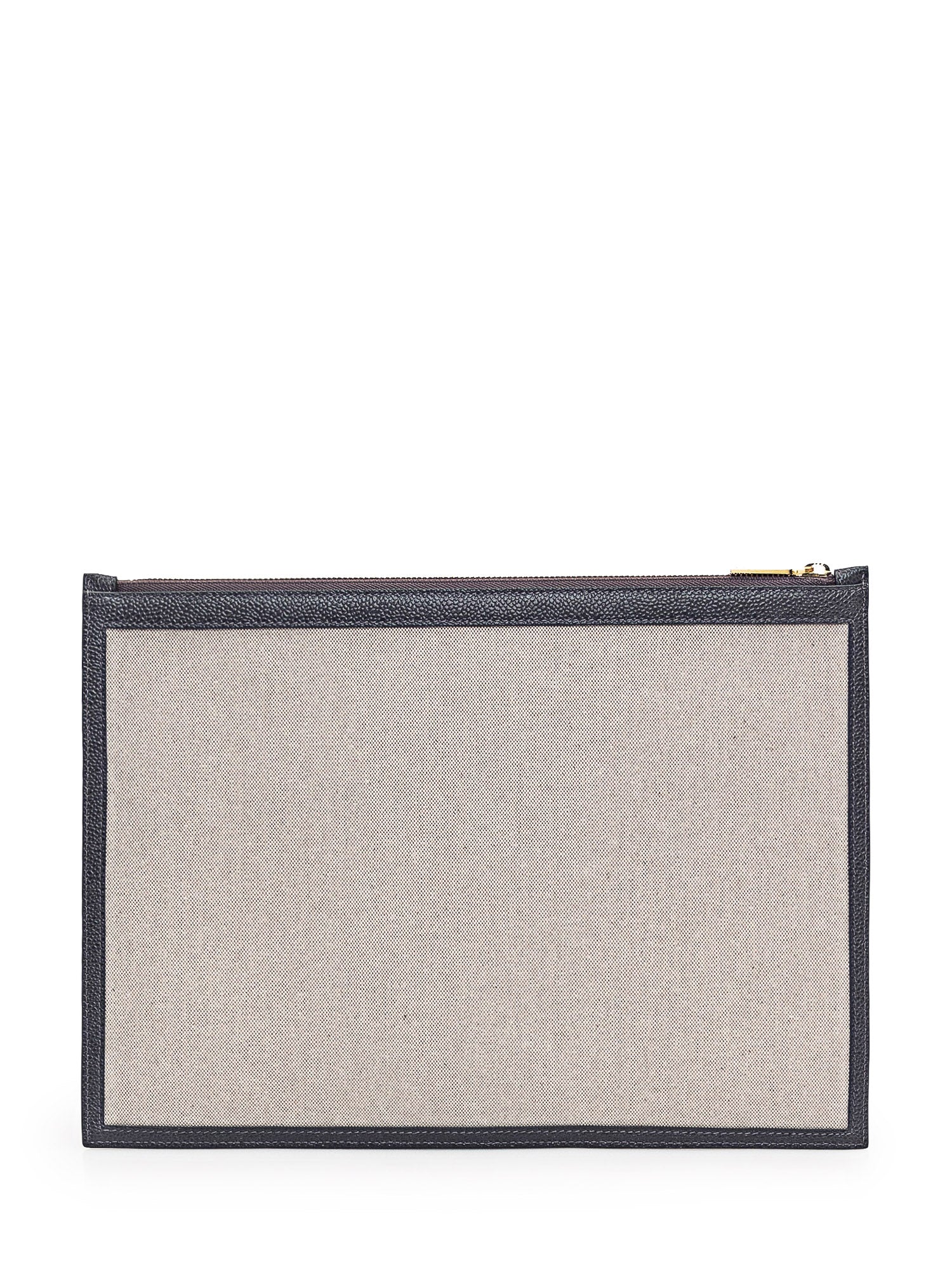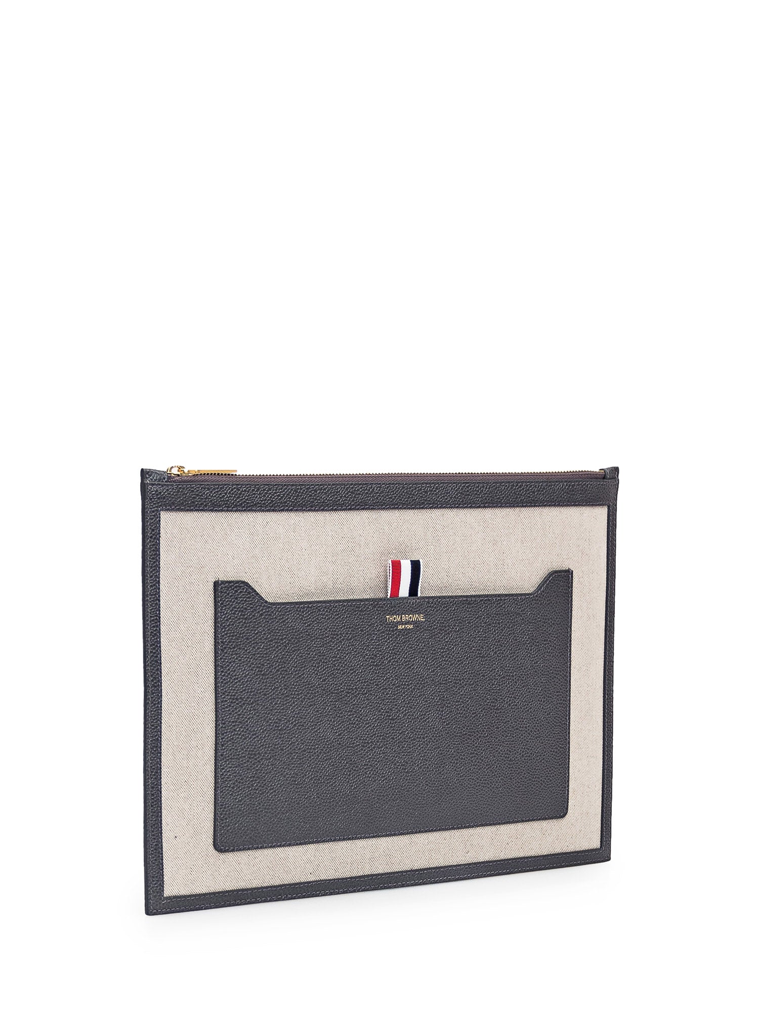 Portadocumenti grigio in pelle. Inserto in cotone. Chiusura con zip. Tasca piatta sul davanti con logo.