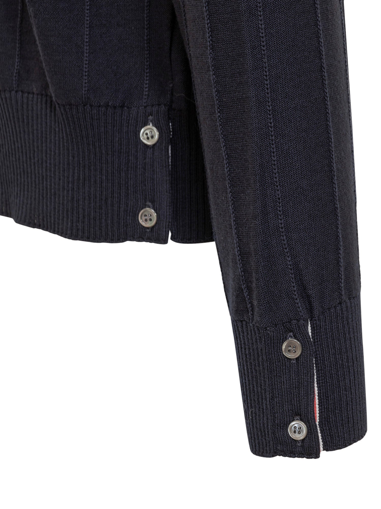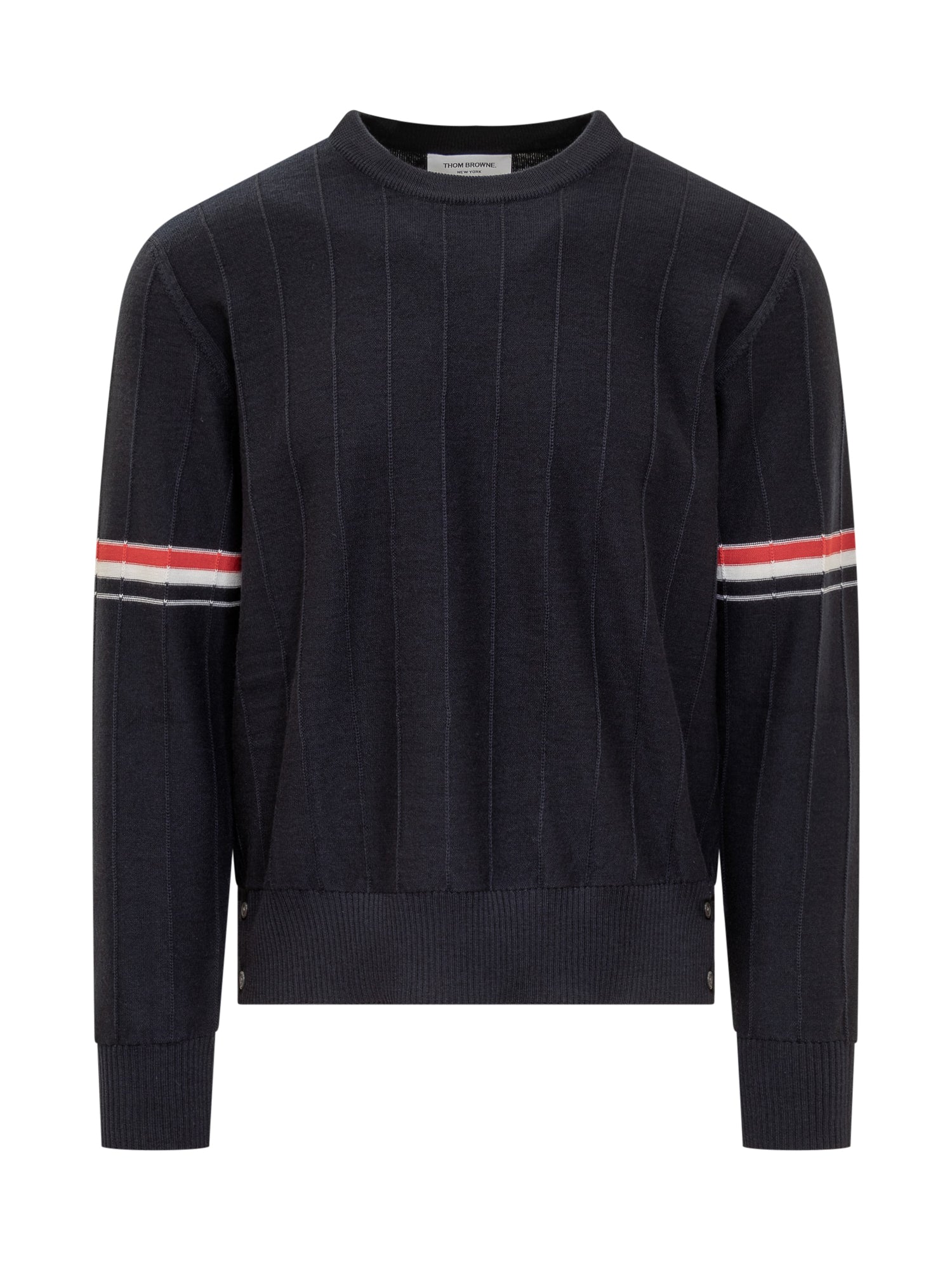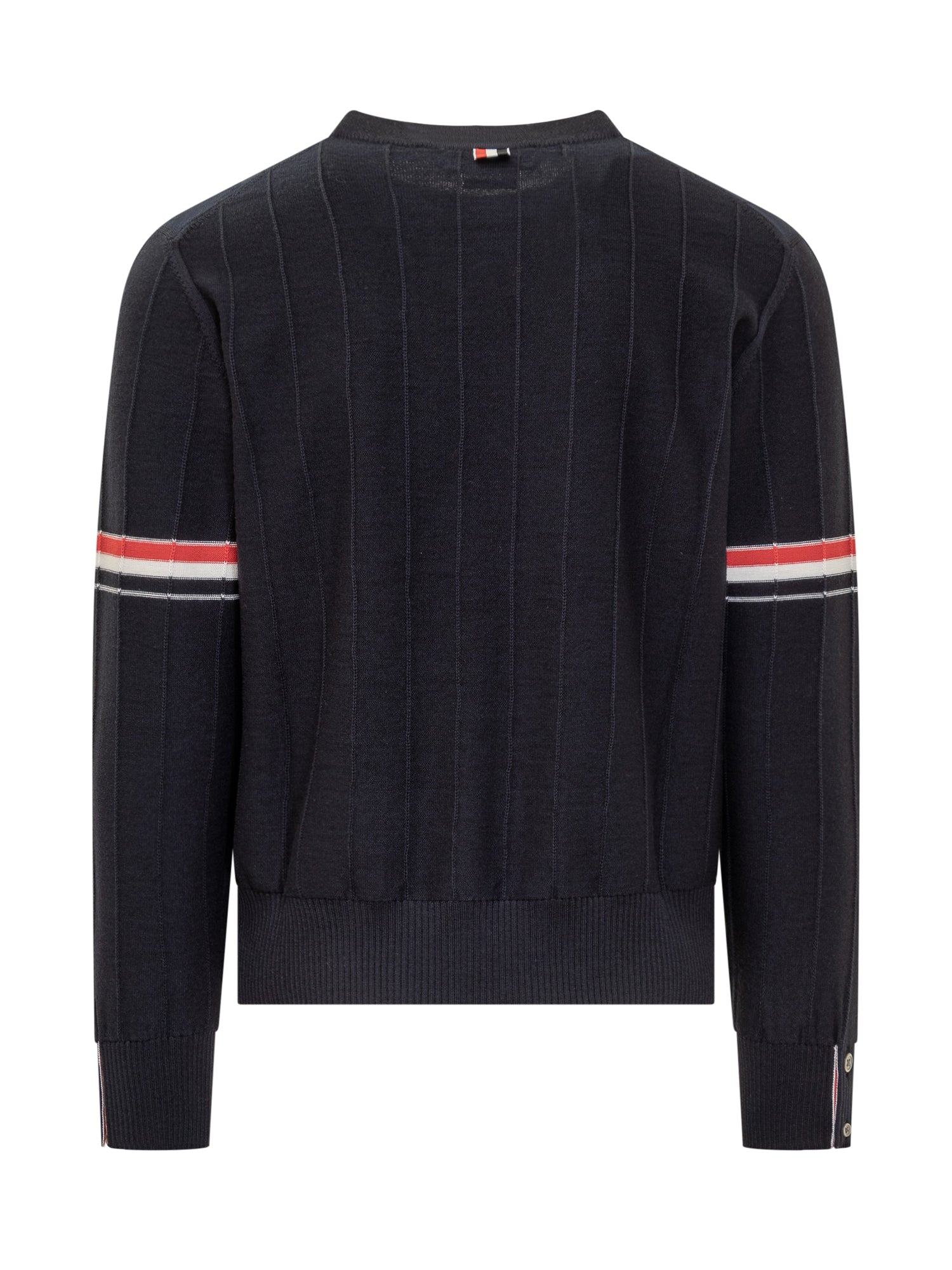 Maglia a maniche lunghe in lana vergine. Girocollo. Orli a costine. Spacchi laterali traspiranti sul fondo e sui polsi. Linguetta con passante in gros-grain a righe sul retro. Logo 4-Bar Striped sulle maniche. Lavorazione con motivo a righe in rilievo.