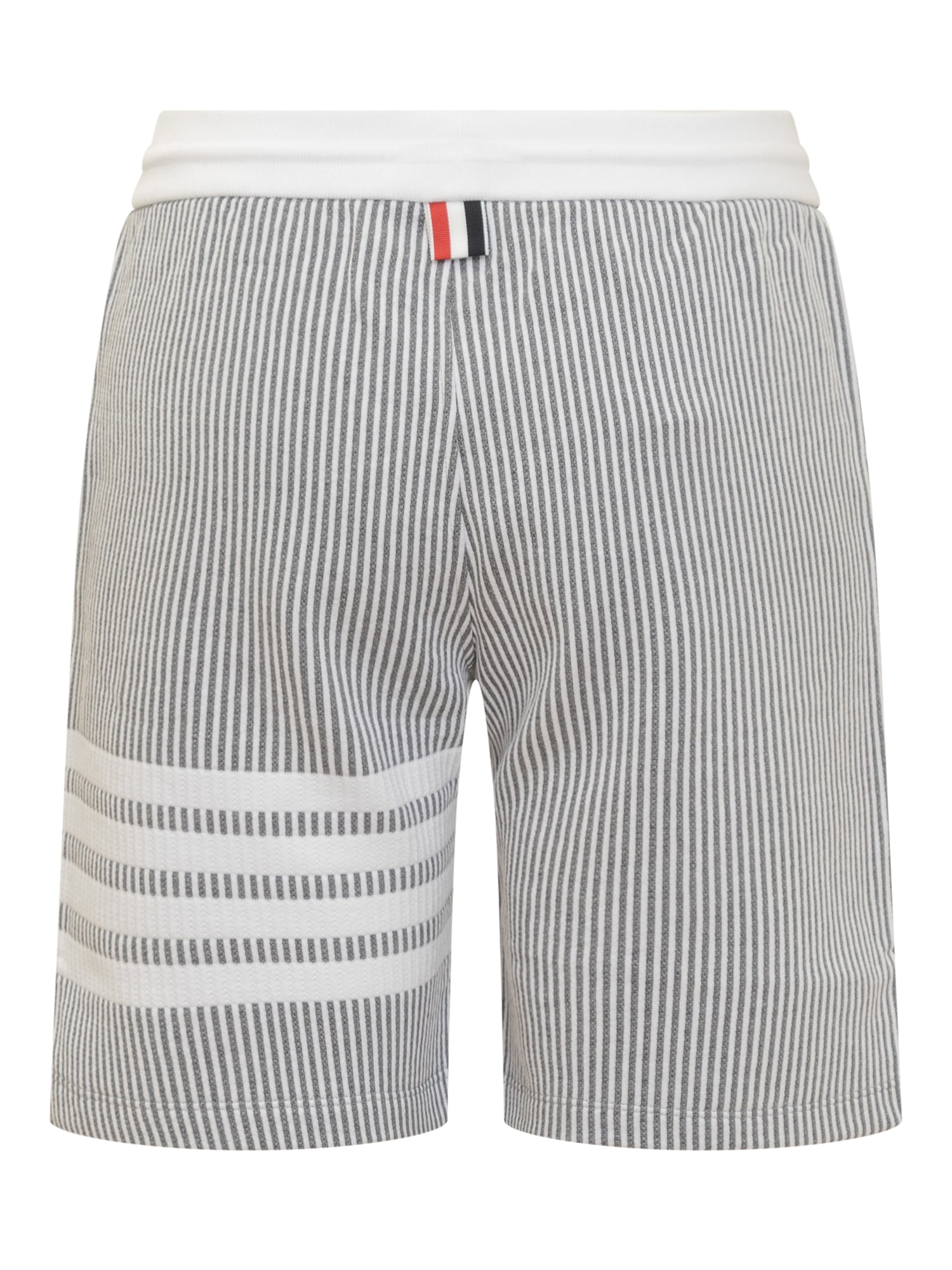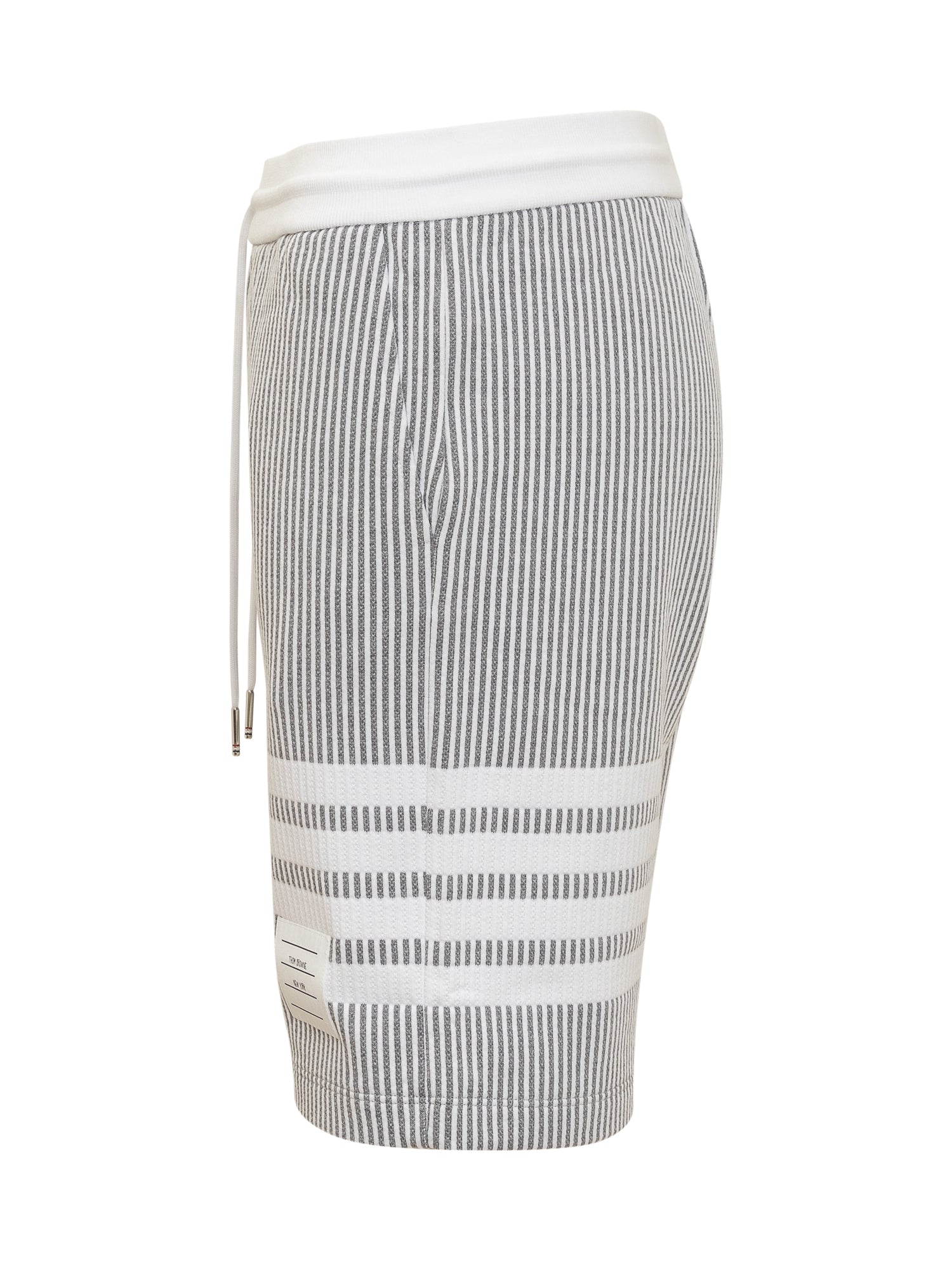 Shorts grigi. Coulisse in vita. Tasche laterali. Realizzati in tessuto seersucker di cotone a righe. Targhetta logo sul retro. Bande logate sulla gamba e logo ricamato sul davanti.