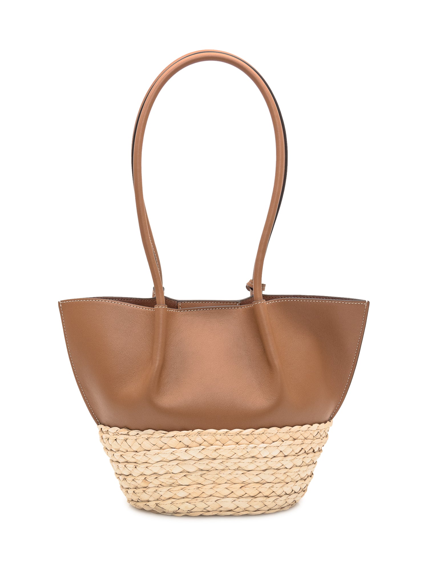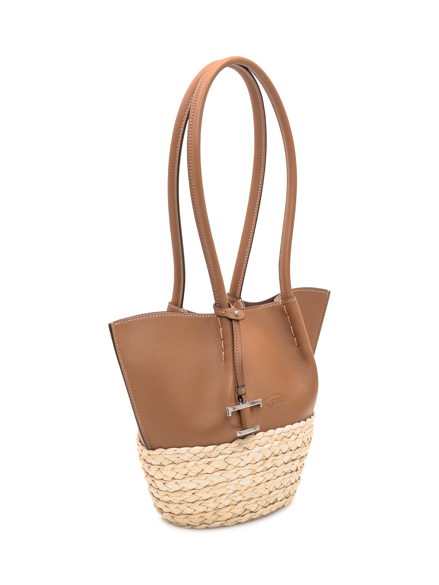 Borsa shopping in pelle. Fondo con dettaglio in rafia. Due manici. Scomparto interno. Charm con logo. Chiusura con bottone.
