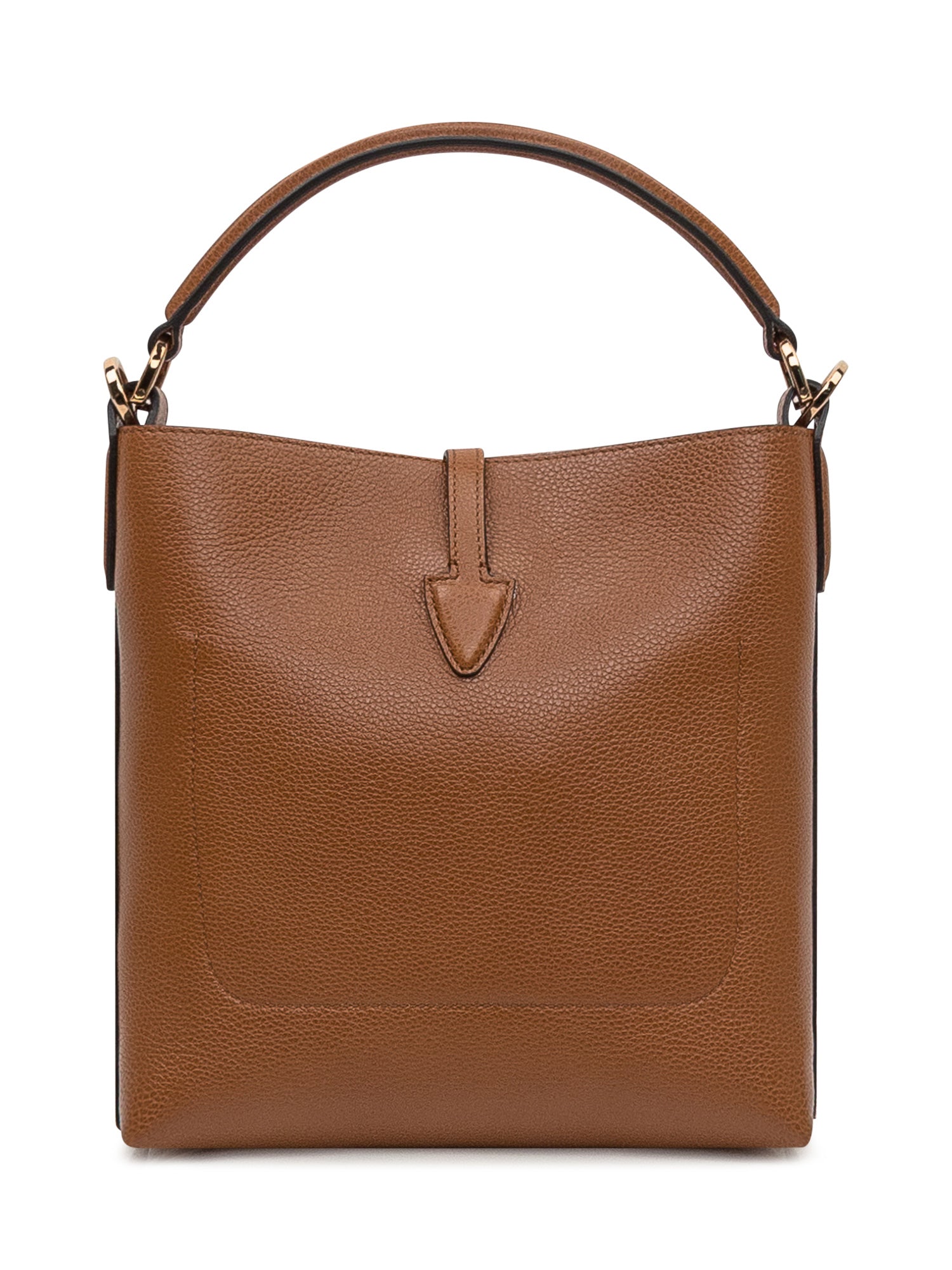 Borsa Tod's in pelle martellata color cuoio con chiusura iconica a T in metallo dorato. Linee pulite e design sofisticato con manico rigido.