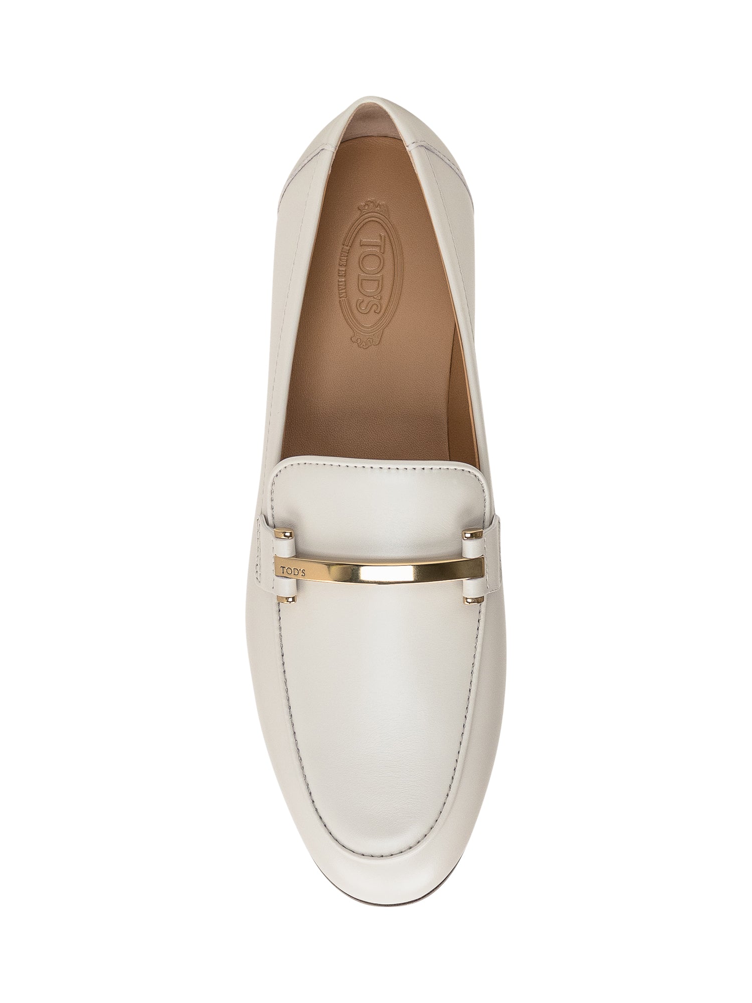 Mocassino bianco con morsetto donna. Tomaia in pelle di vitello. Barretta in metallo personalizzato. Sottopiede in pelle. Suola in cuoio. Tacco in cuoio con inserto in gomma.