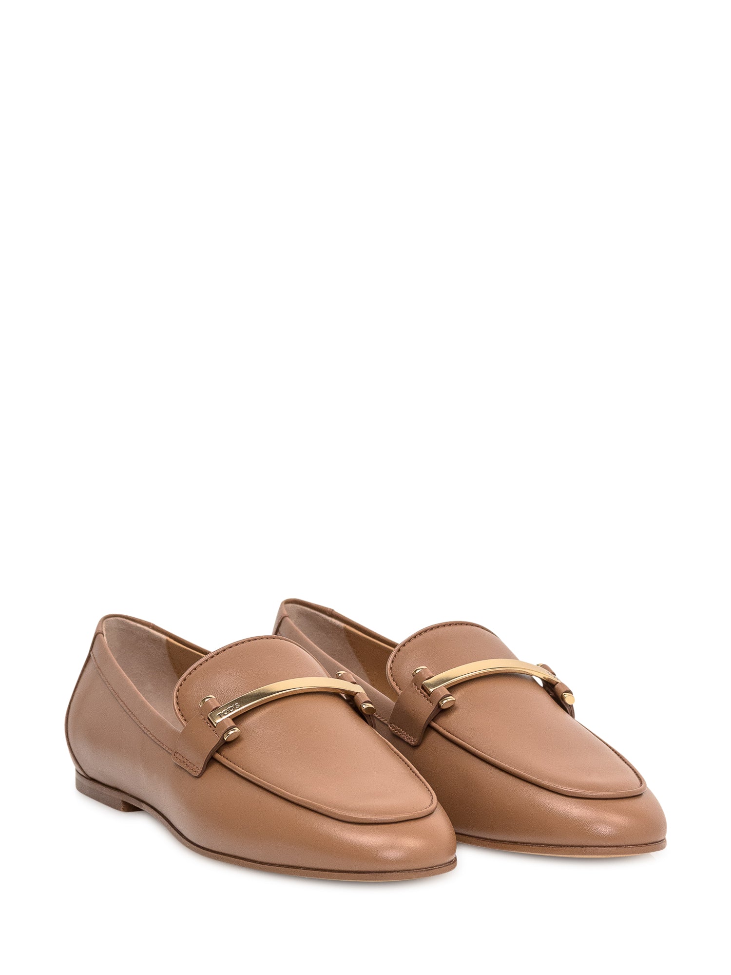 Mocassino marrone con morsetto donna. Tomaia in pelle di vitello. Barretta in metallo personalizzato. Sottopiede in pelle. Suola in cuoio. Tacco in cuoio con inserto in gomma.