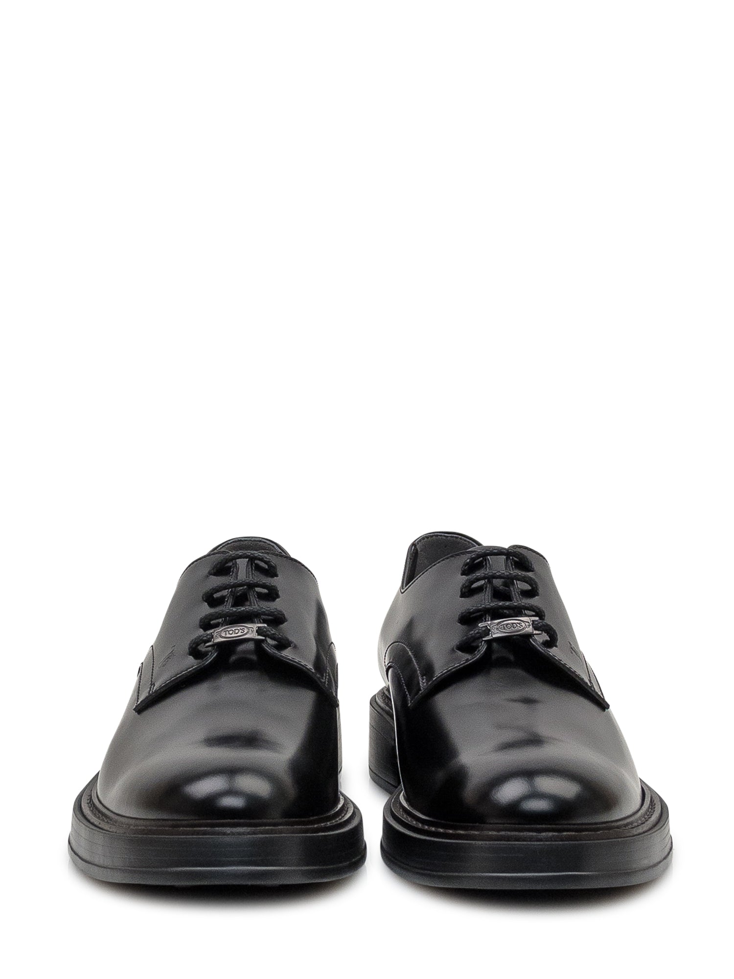 Scarpa derby Tod's in pelle nera lucida, con suola robusta e design classico.
