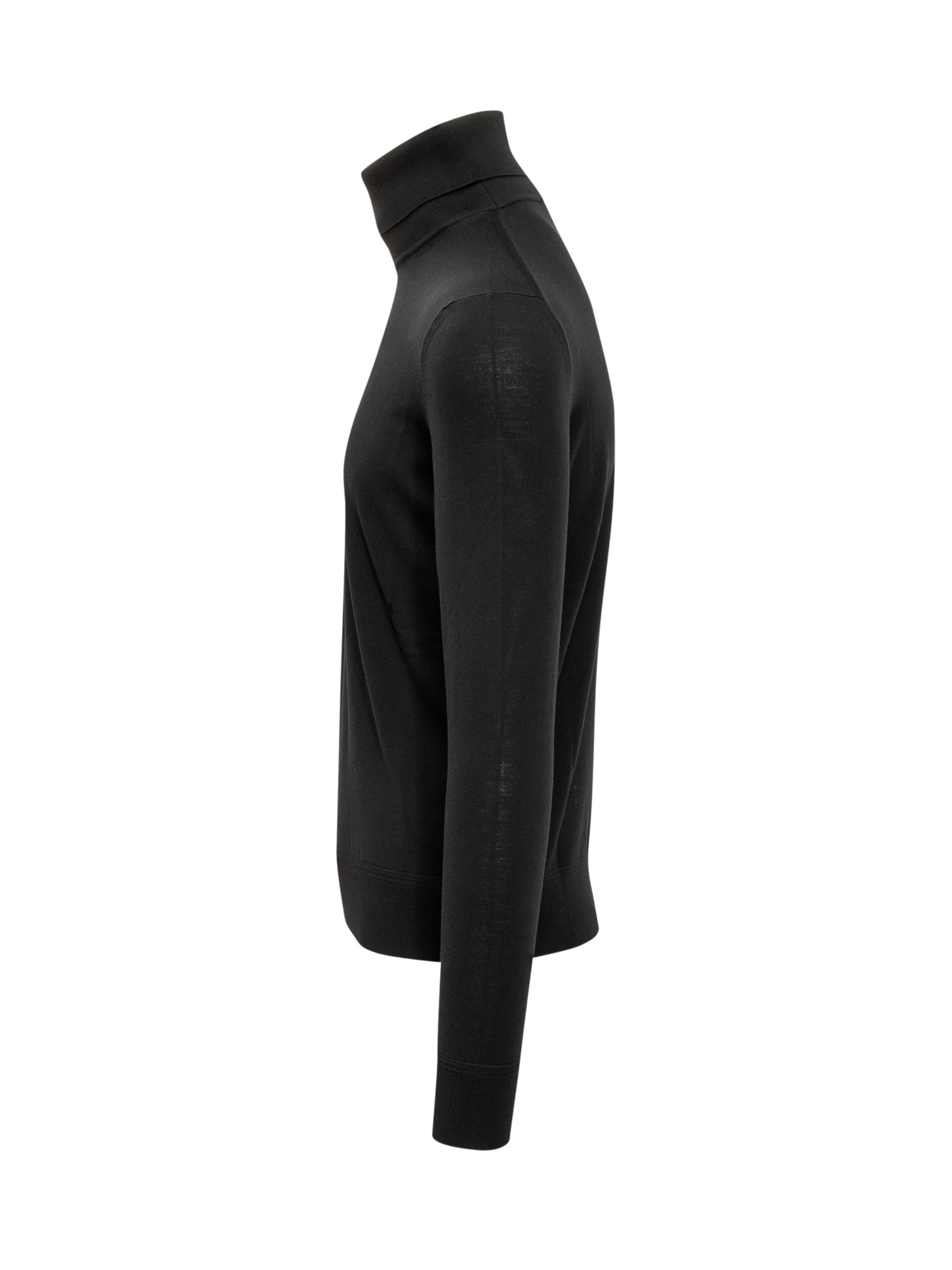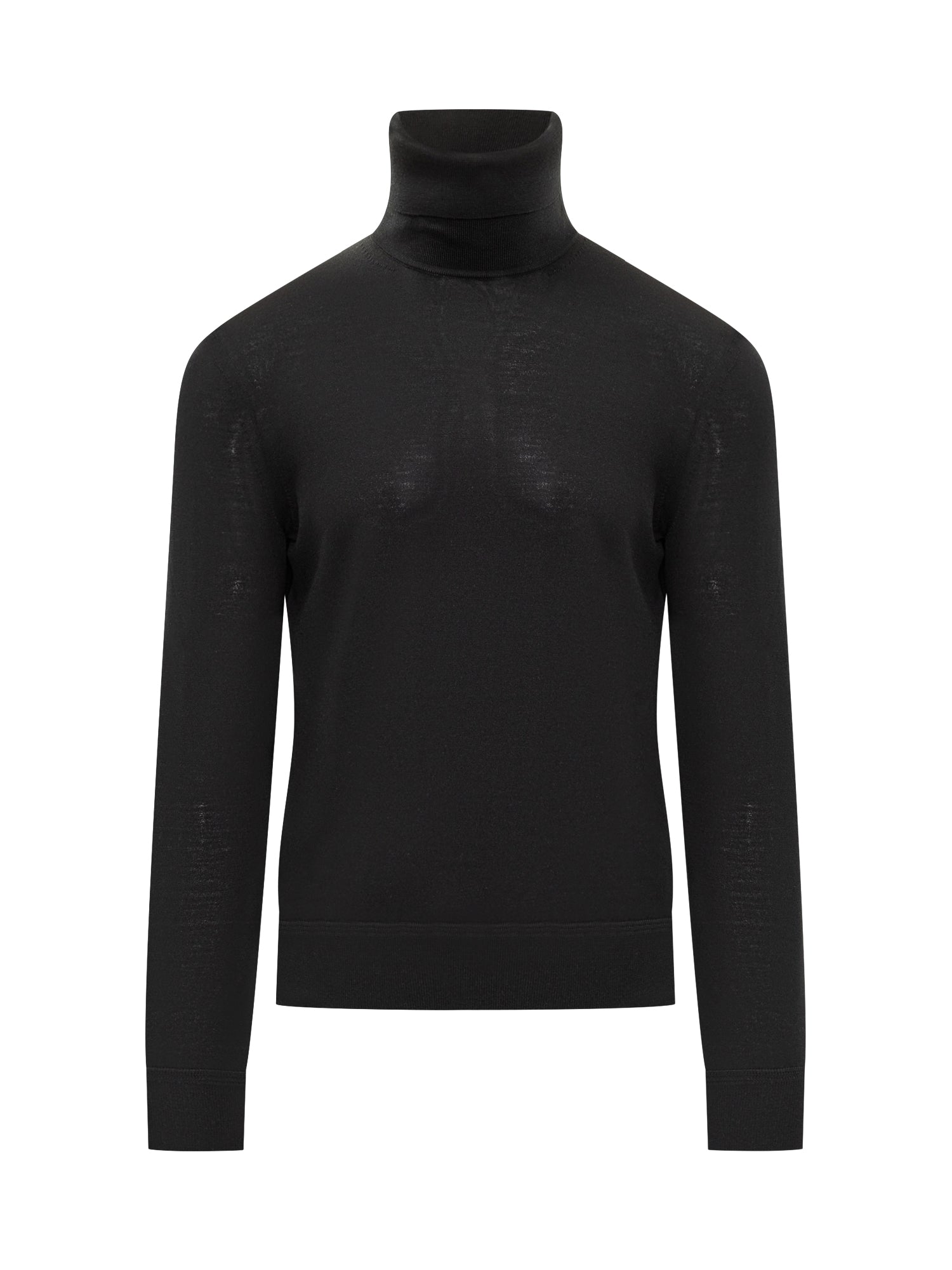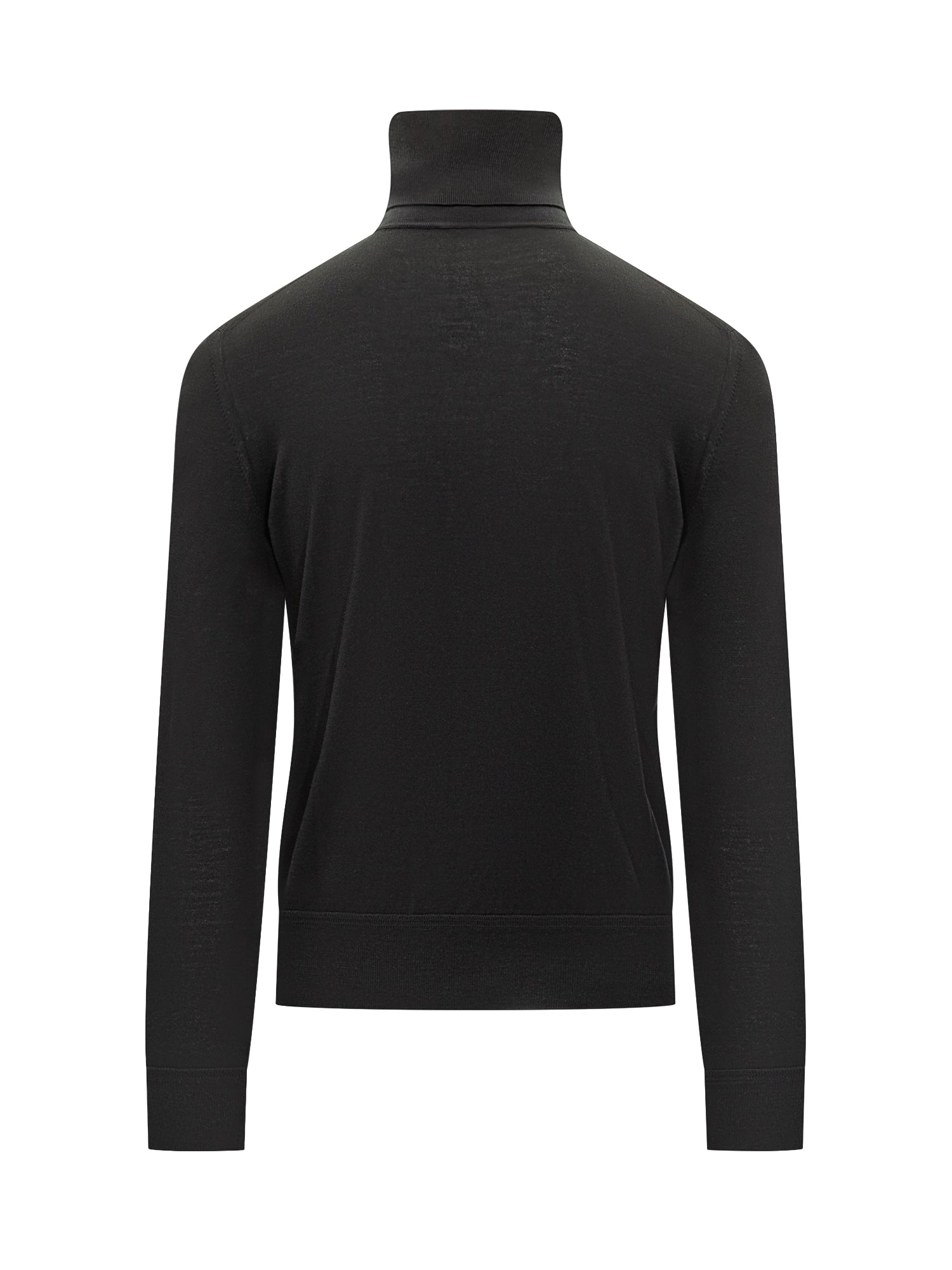Maglia dolcevita nera in lana merino extrafine firmata Tom Ford. Vestibilità slim e stile essenziale, perfetta per look eleganti e raffinati.